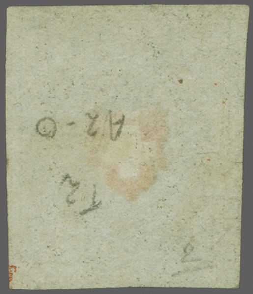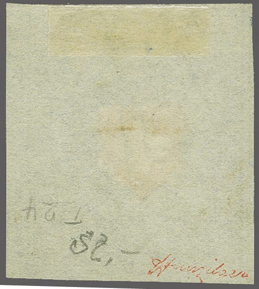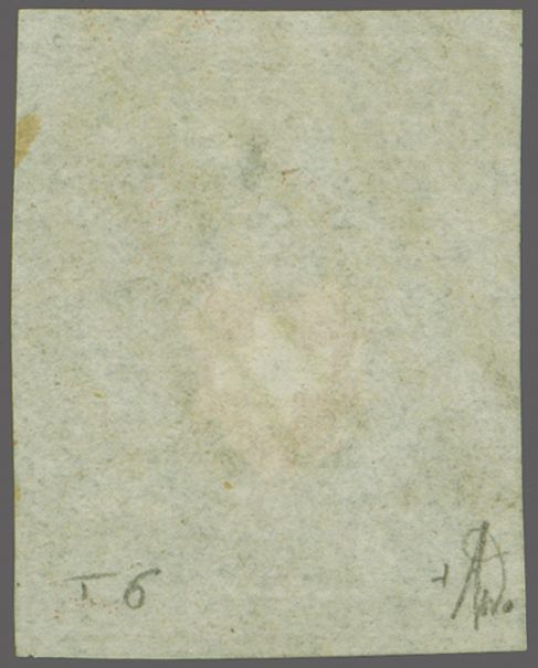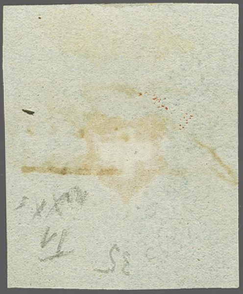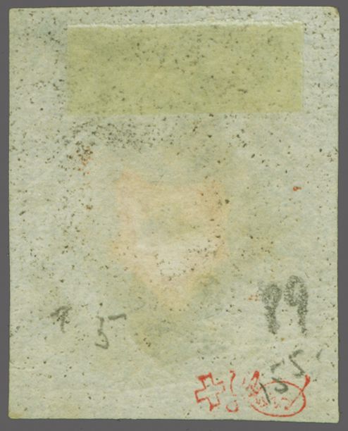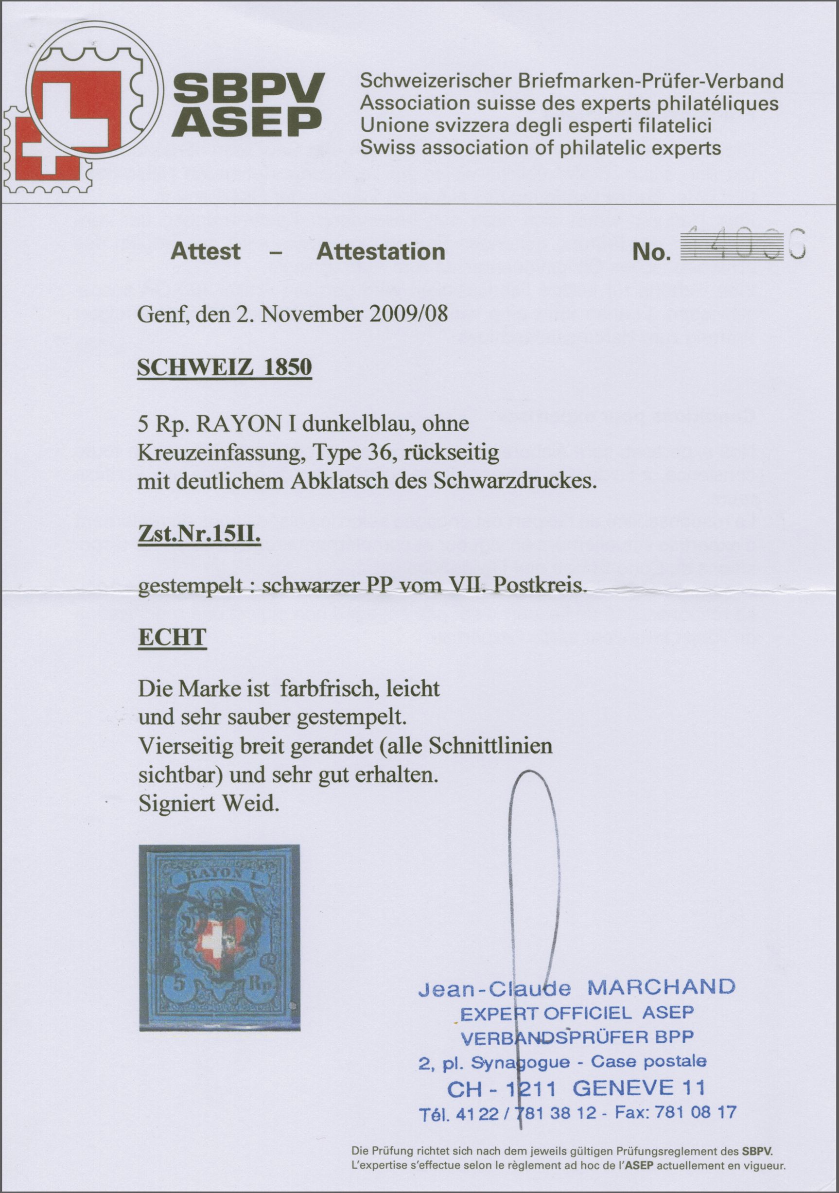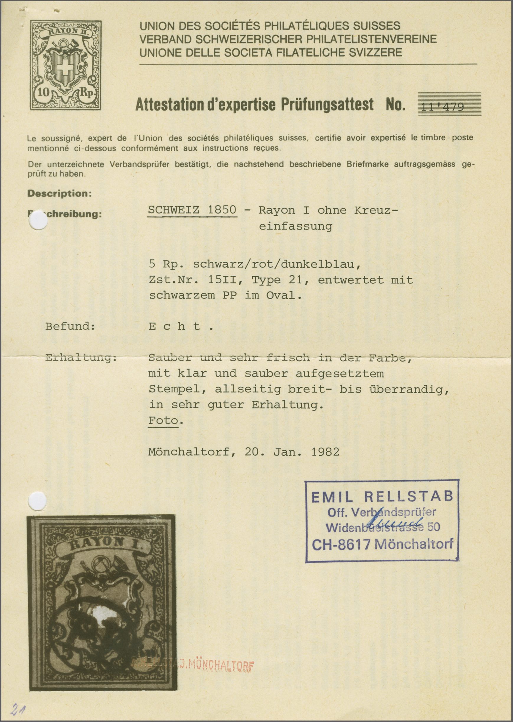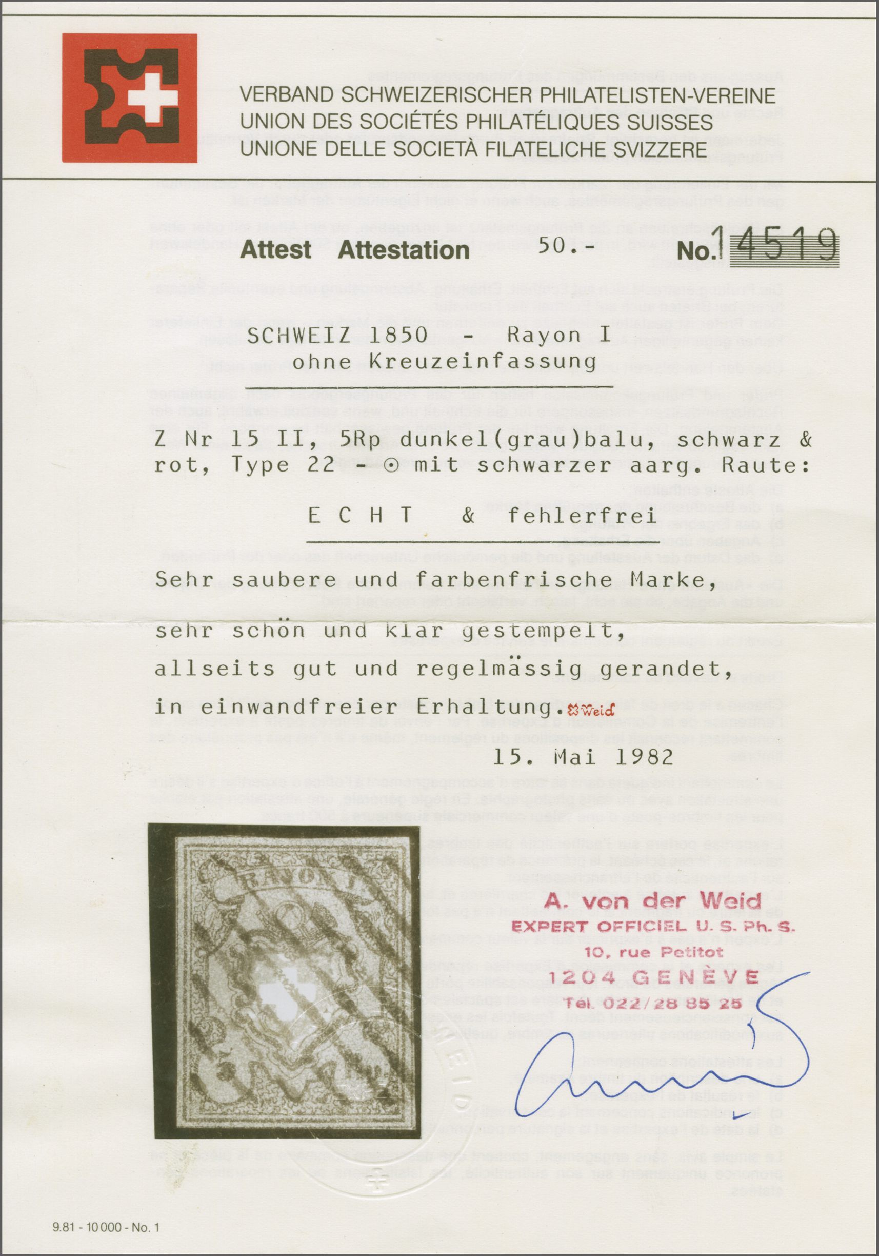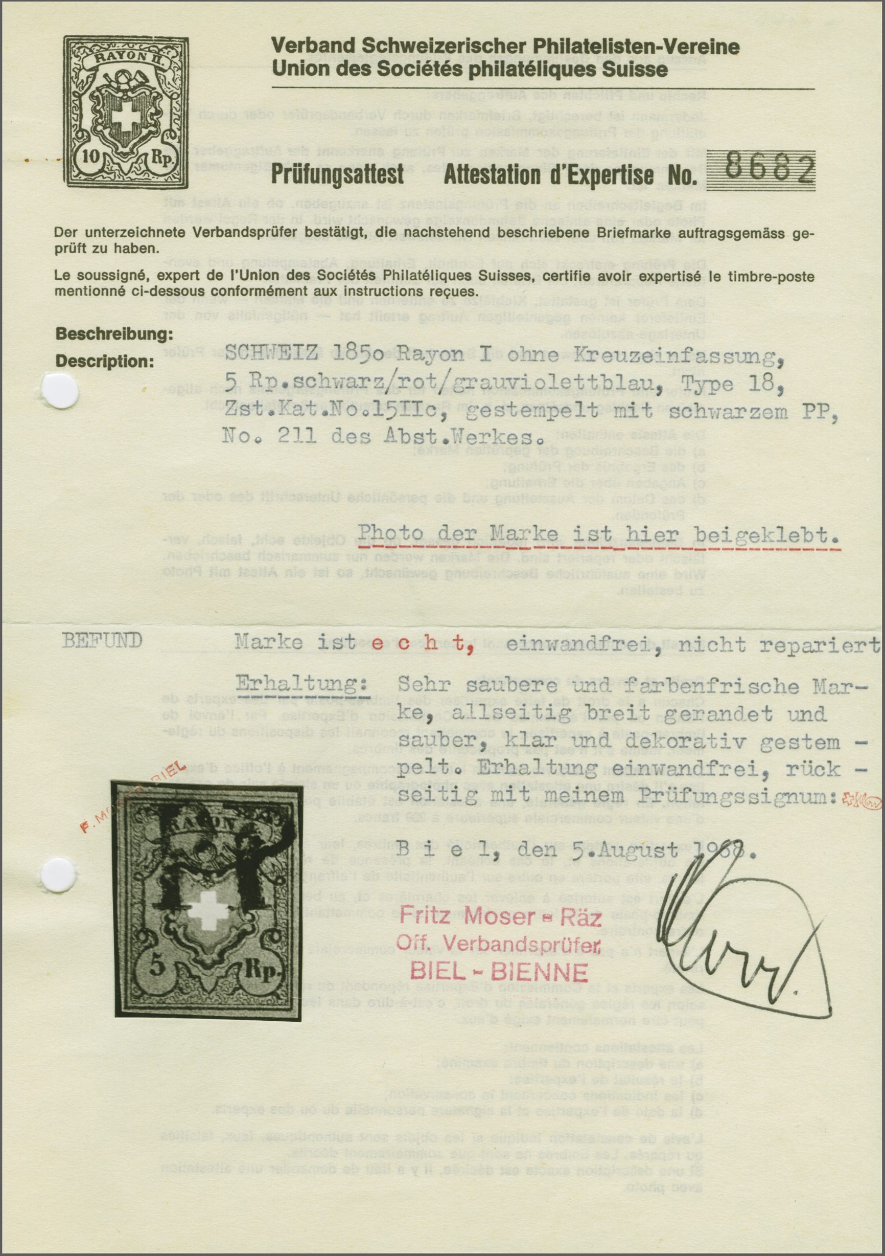 Ohne Kreuzeinfassung: Type 5 mit marmoriertem Blaudruck, farbfr. und breitrandig, klar und zentrisch entw. mit schwarzem "PP." im Oval unbekannter Herkunft (AW 292). Eine seltene Entwertung; Attest von der Weid (1971), Befund