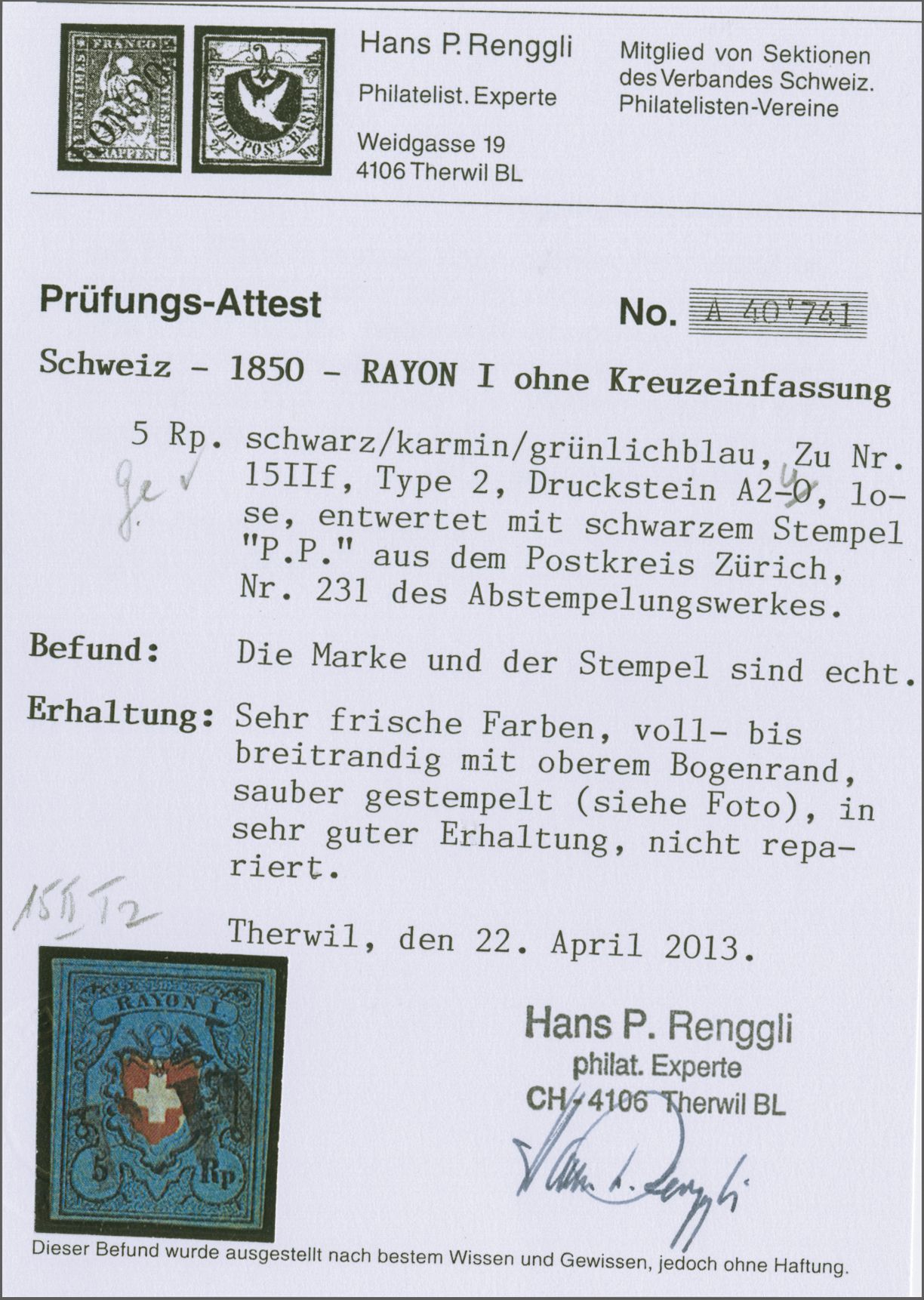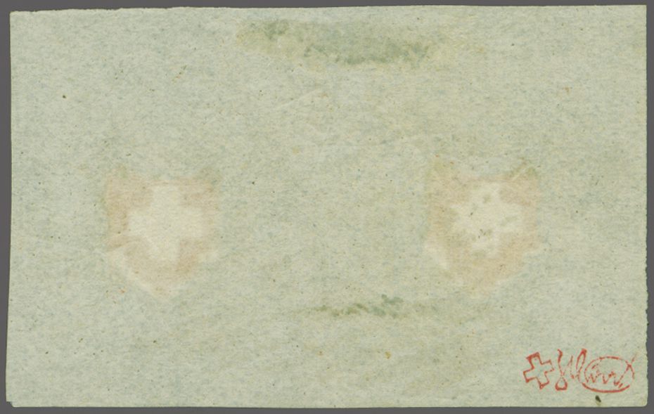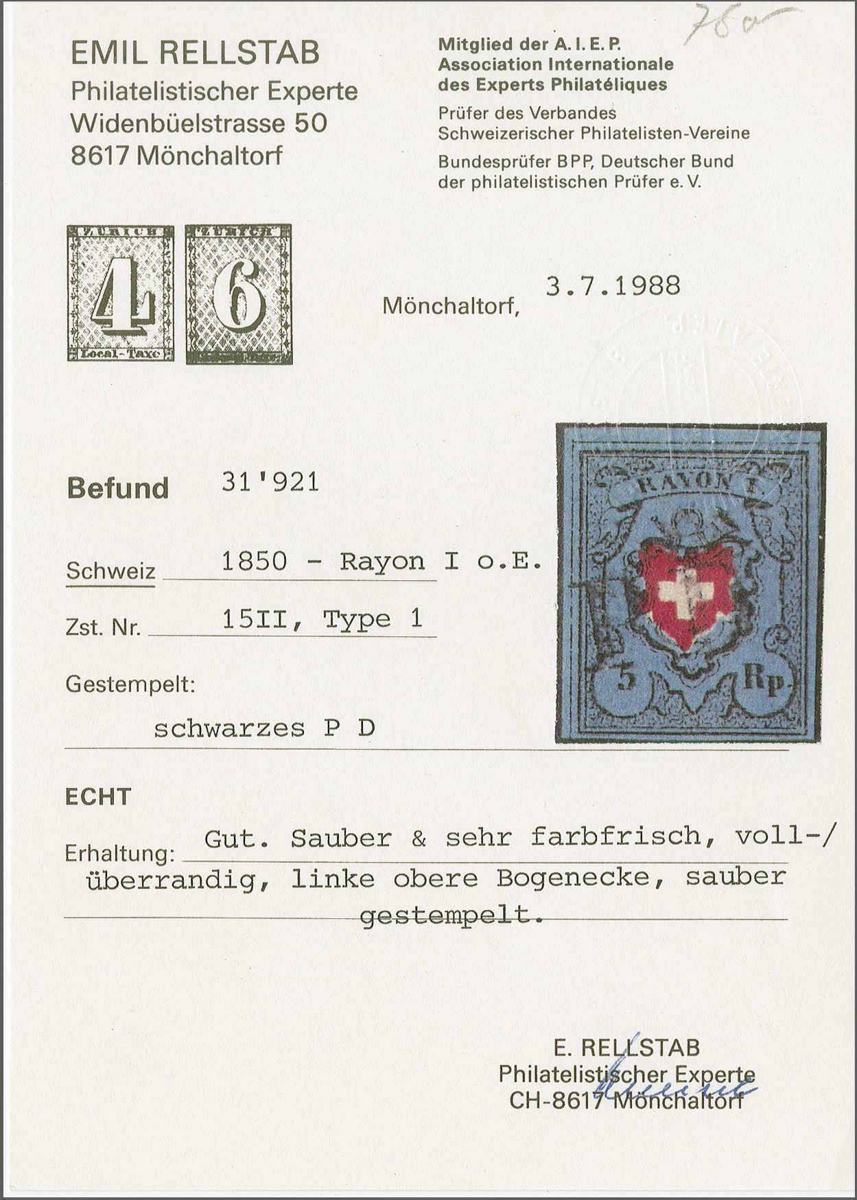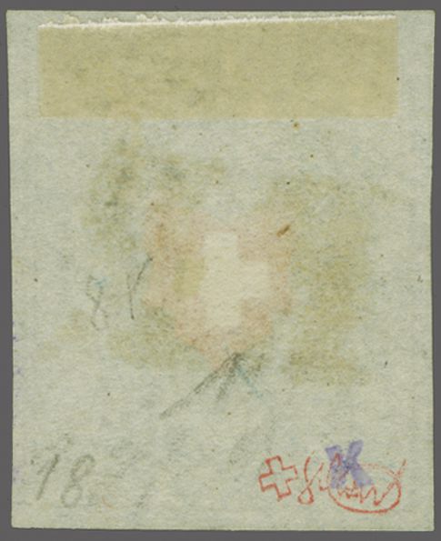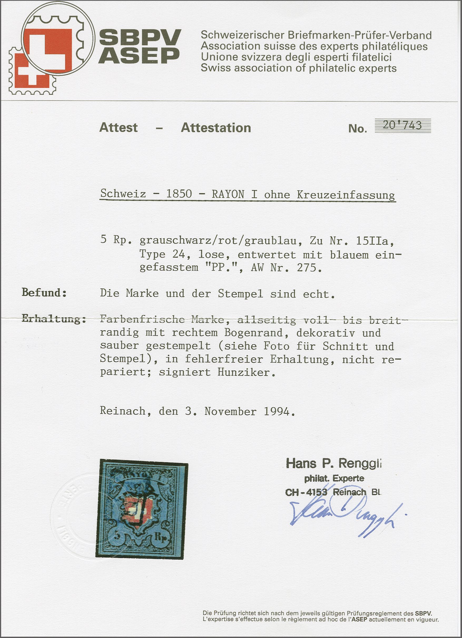 Type 24, farbfr. und gut- bis meist überrandig mit Bogenrand rechts, zart und voll aufgesetzt entw. mit blauem gefasstem "PP." (AW 275). Signiert Hunziker; Attest Renggli (1994) SBK = CHF 750 (Image 1)