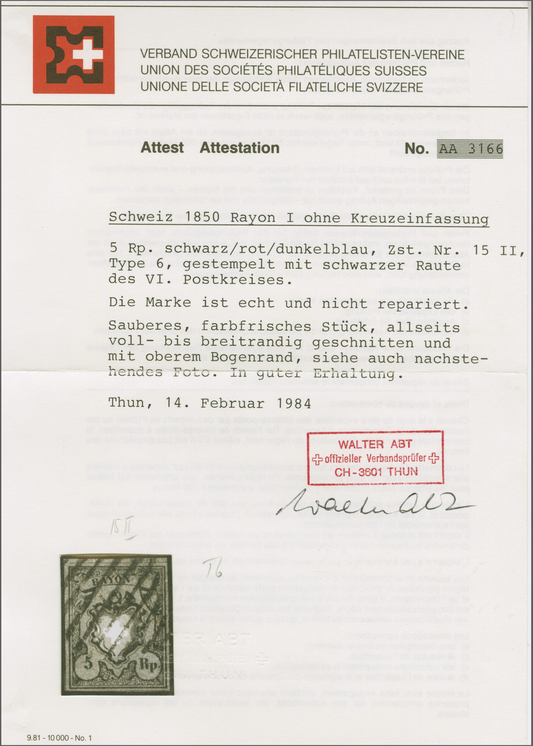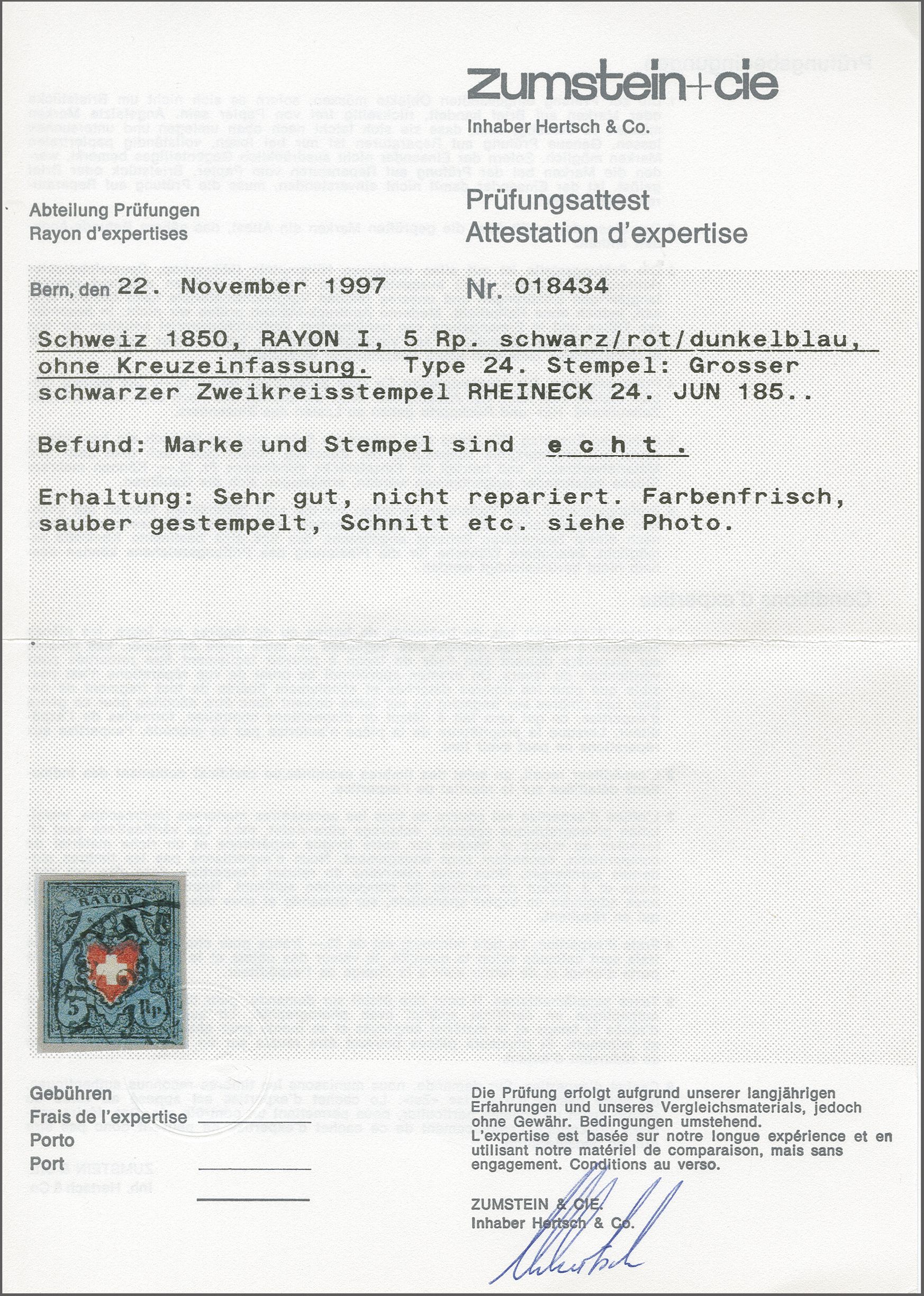 Type 24, farbfr. und gut- bis meist überrandig mit drei kompletten Trennlinien, zartklar entw. mit schwarzem Zierzweikreisstp. "RHEINECK 24 JUN. 185.". Attest Zumstein (1997) SBK = CHF 750 (Image 1)