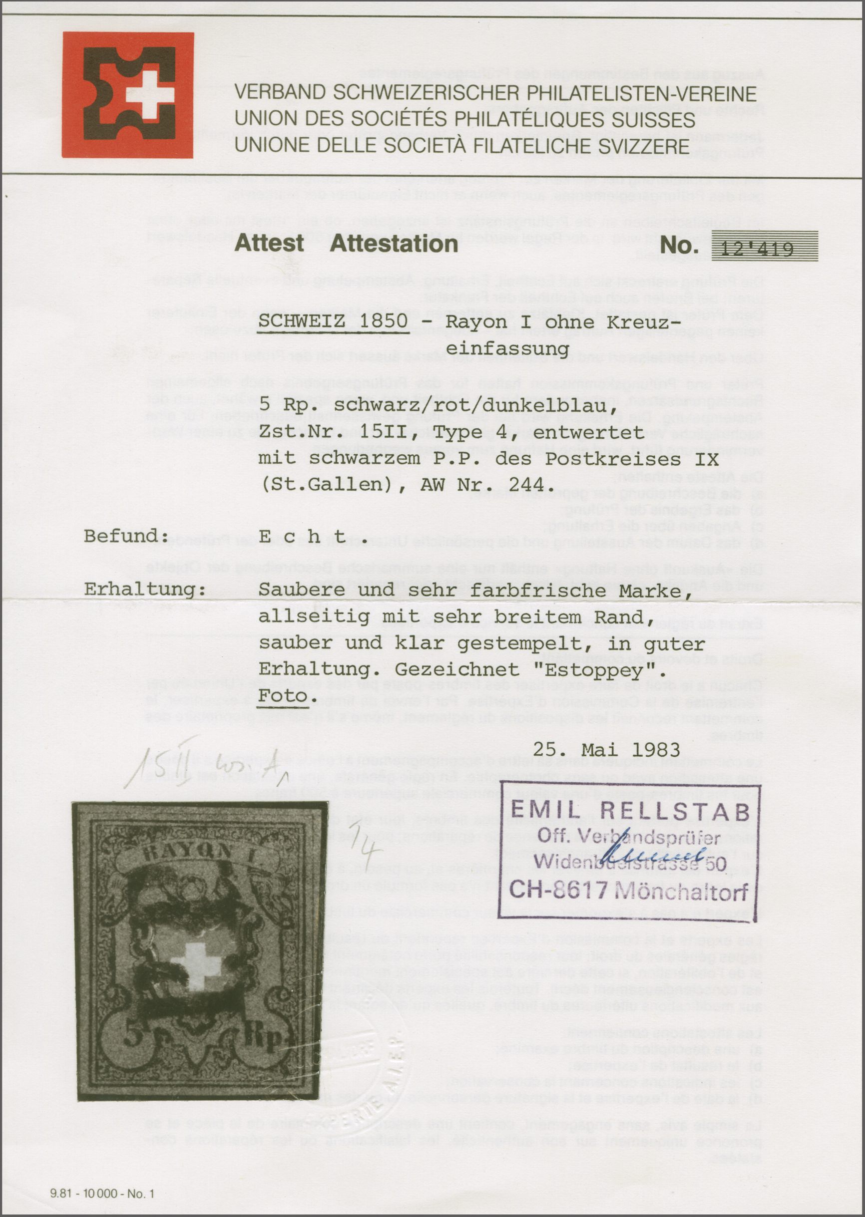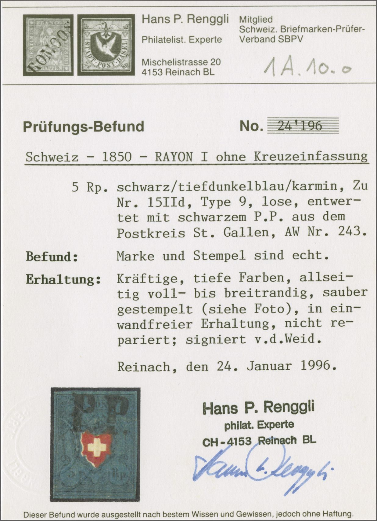 Ohne Kreuzeinfassung: Type 9 in der tiefdunkelblauen Nuance, farbfr. und breit- bis überrandig, klar und kreuzfrei entw. mit oberhalb des Wappens aufgesetztem schwarzem "P.P." des Postkreis St. Gallen (AW 243). Signiert von
