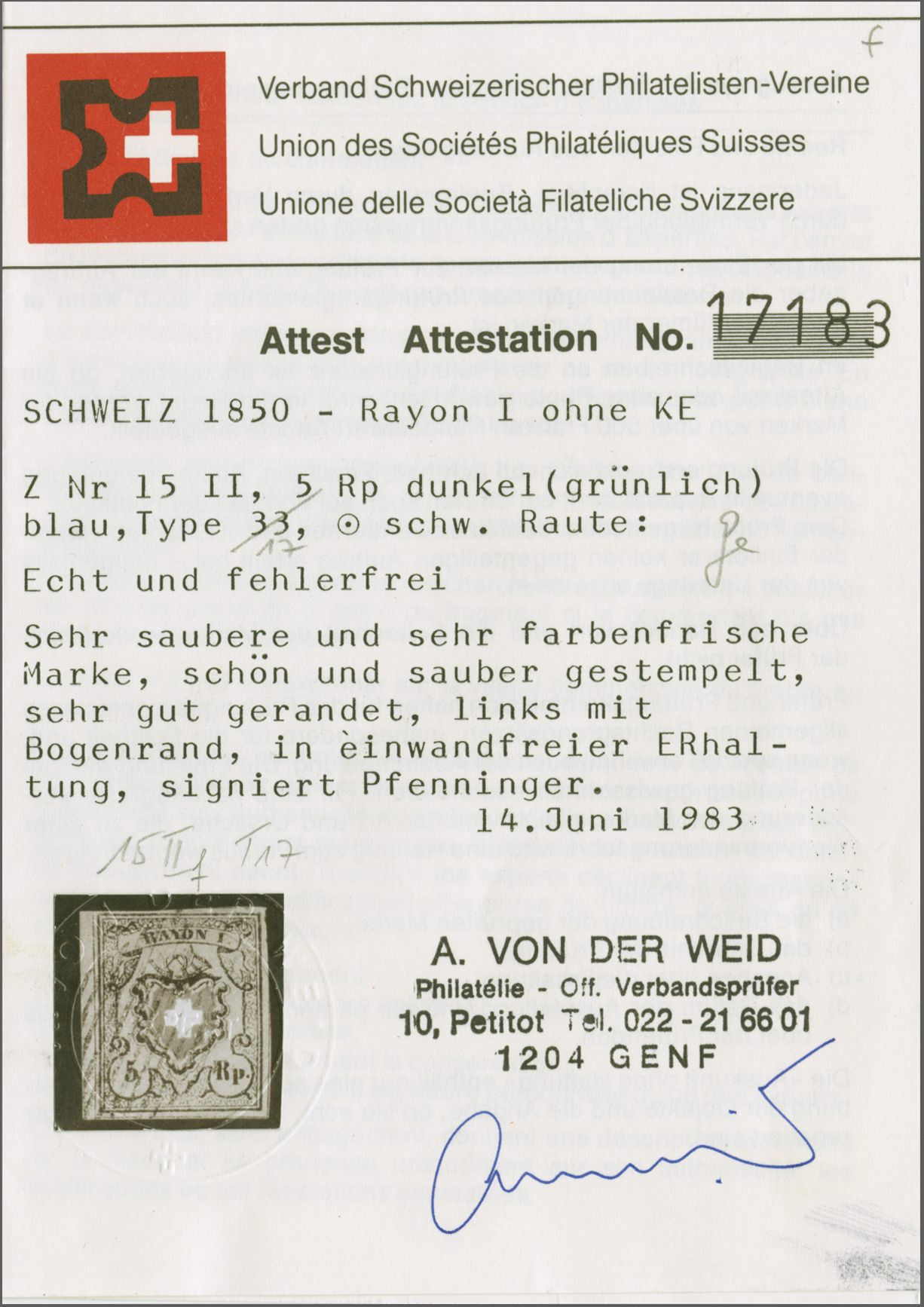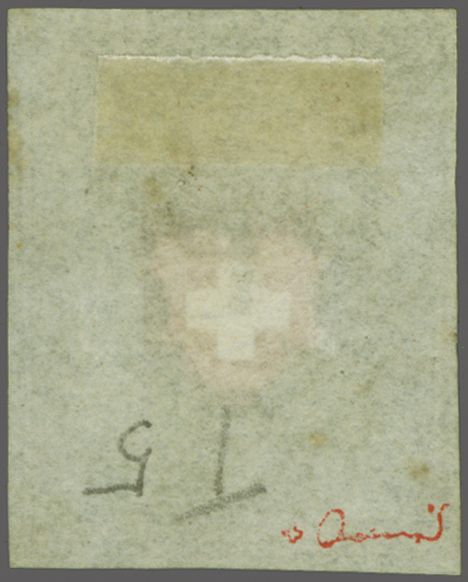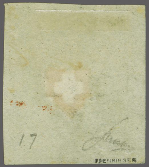 Ohne Kreuzeinfassung: Type 17 in der grünlichblauen Nuance, farbfr. und breit bis überrandig mit breitem Bogenrand links, zart entw. mit schwarzer eidg. Raute. Signiert Pfenninger, Attest von der Weid (1983). SBK=CHF 850 (Image 1)
