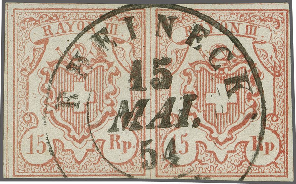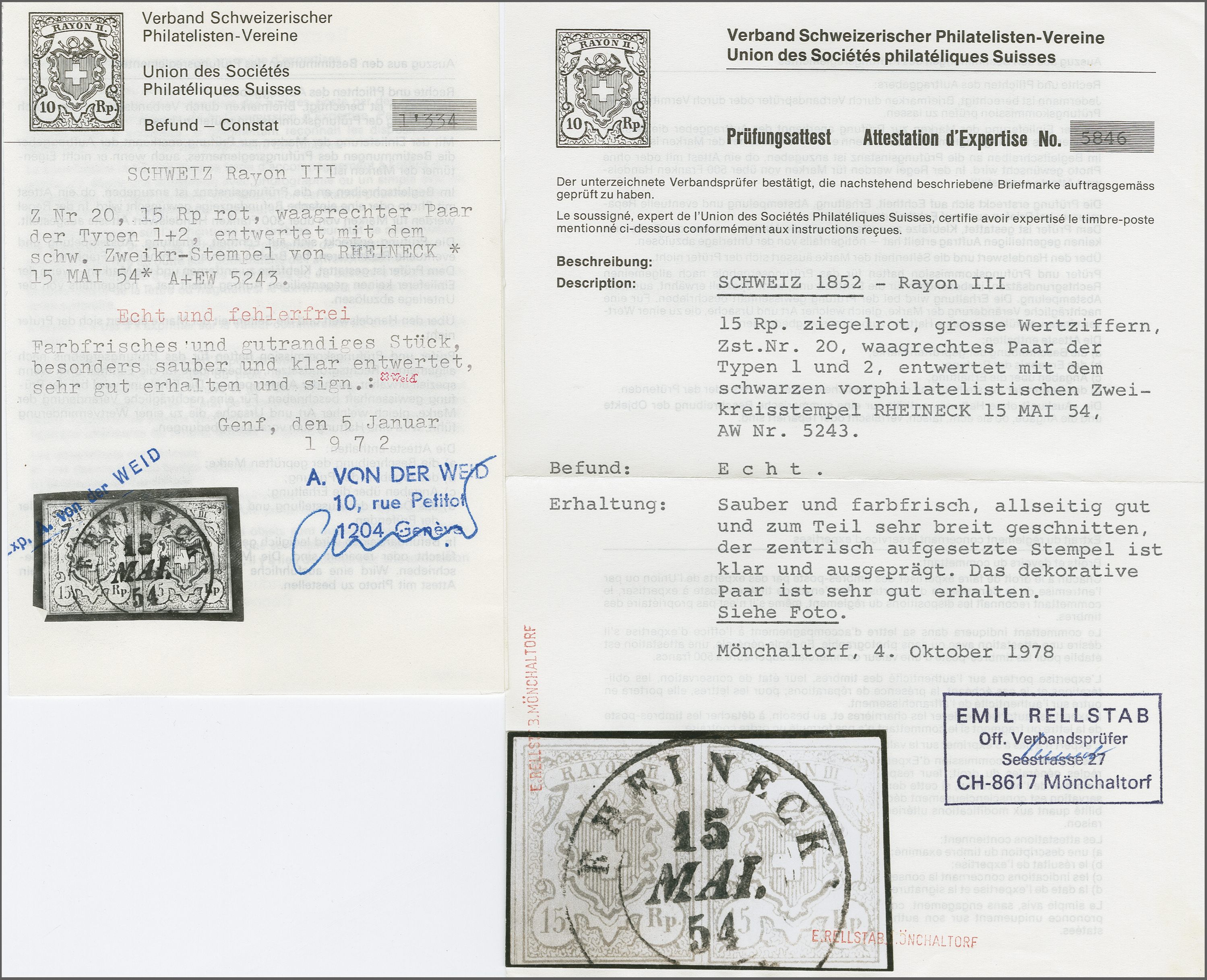 Gr. Wertziffer: Typen 1+2 im waagr. Paar, farbfr. und gut- bis überrandig, zus. klar und zentr. entw. mit schwarzem Zierzweikreisstp. "RHEINECK 15 MAI 54" (AW 5244). Eine attraktive Einheit, Befund von der Weid (1972); Atteste