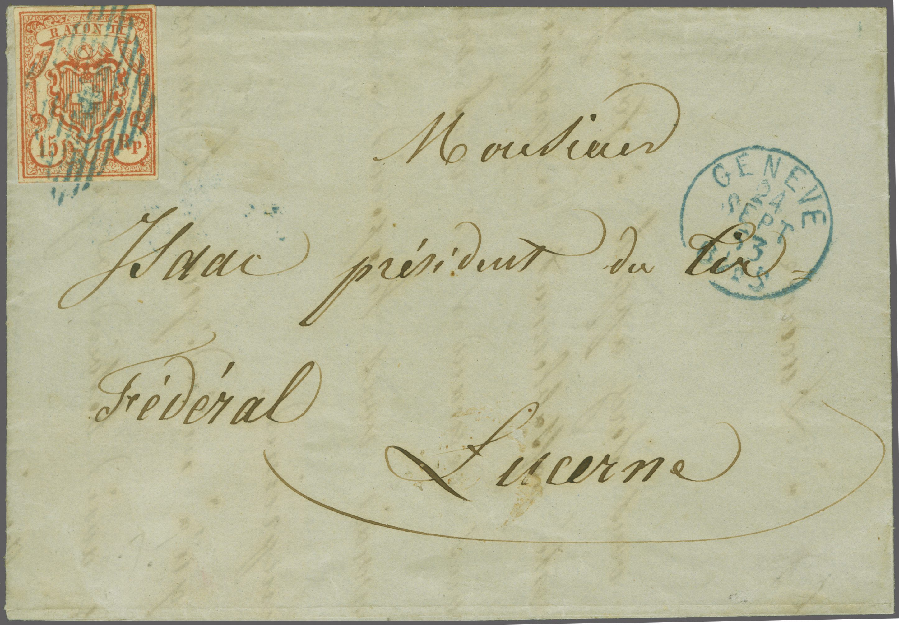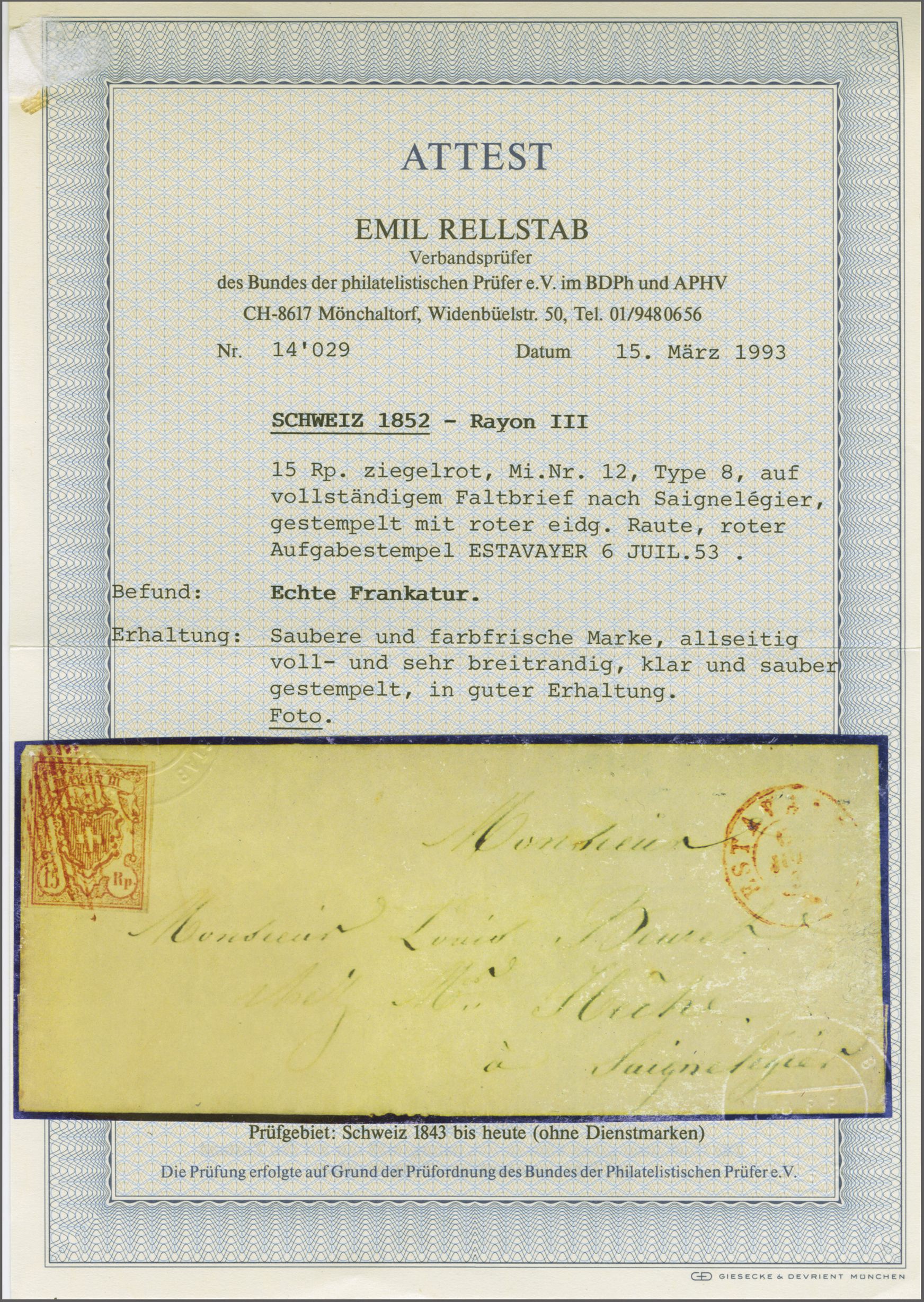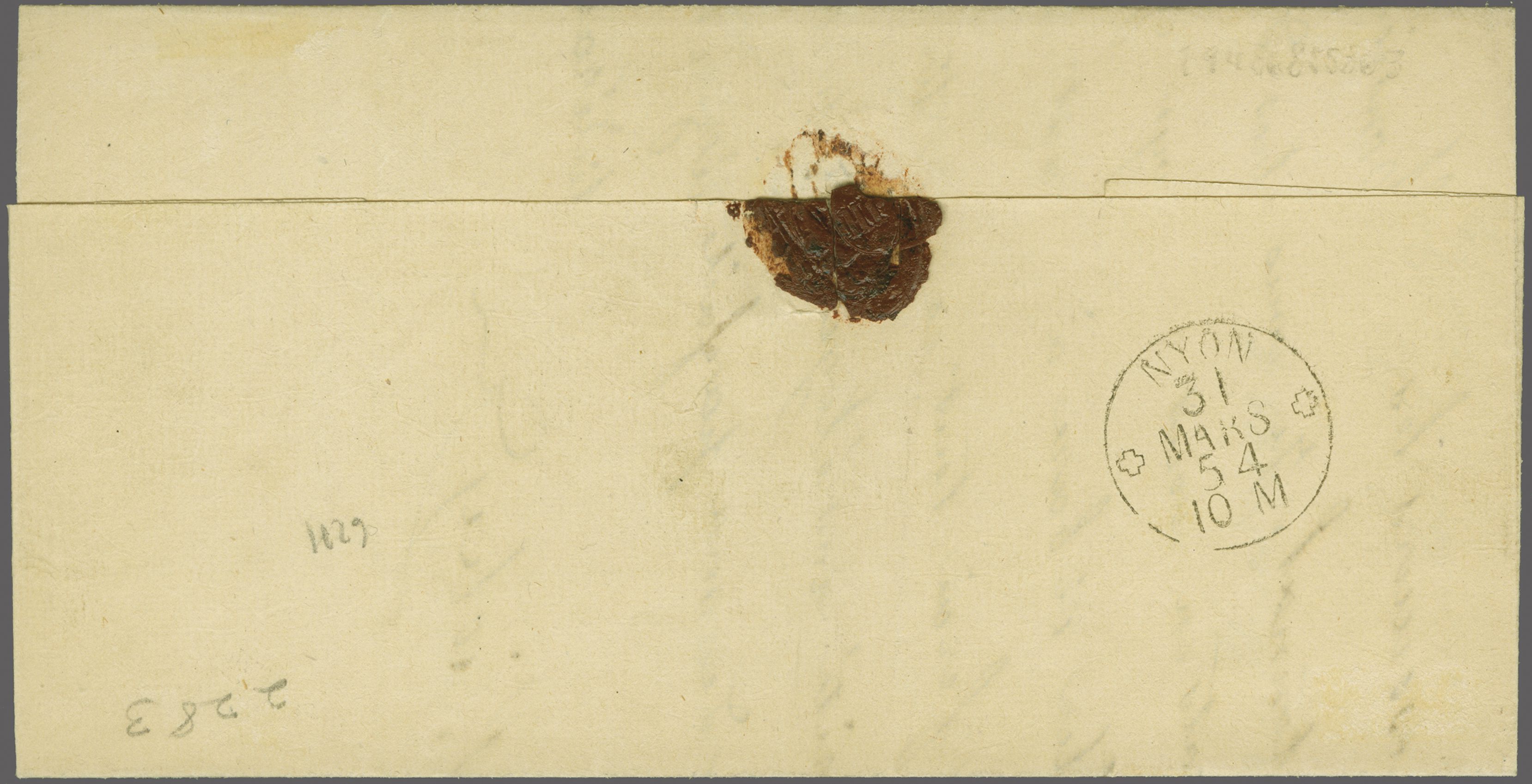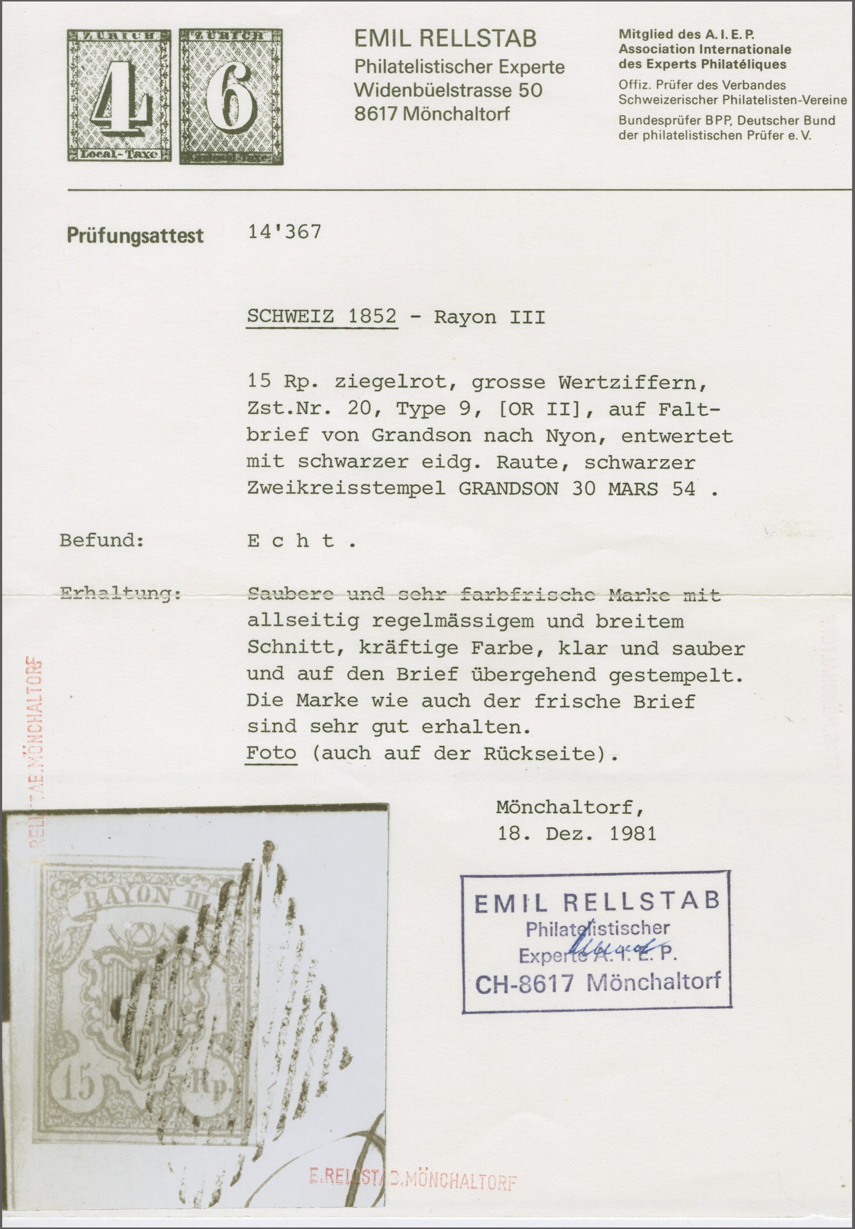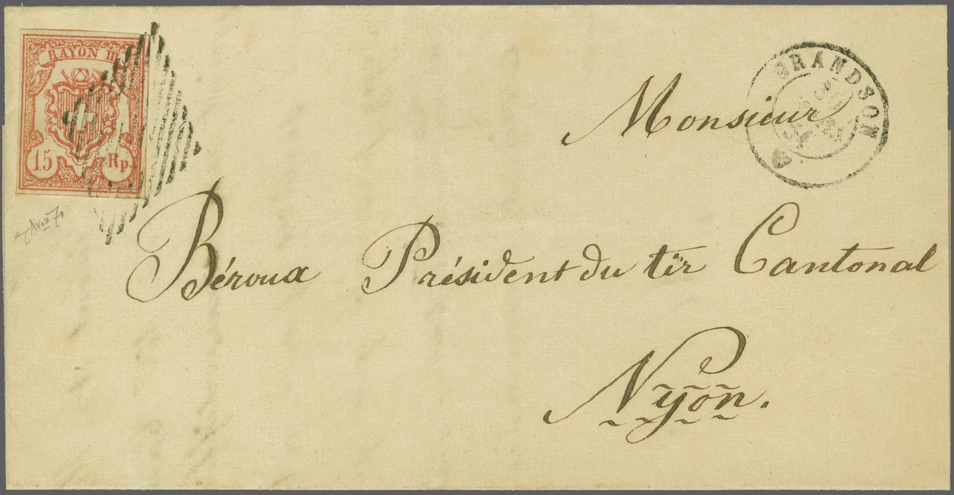 Schützenfestes in Nyon. Rücks. Ankunftsstp. vom Folgetag. Ein frischer und ursprünglicher Brief; Attest Rellstab (1981). Provenienz: 107. Corinphila-Auktion, Zürich September 1998, Los 6271; Sammlung Jack Luder, 219. Corinphila-Auktion, Zürich
