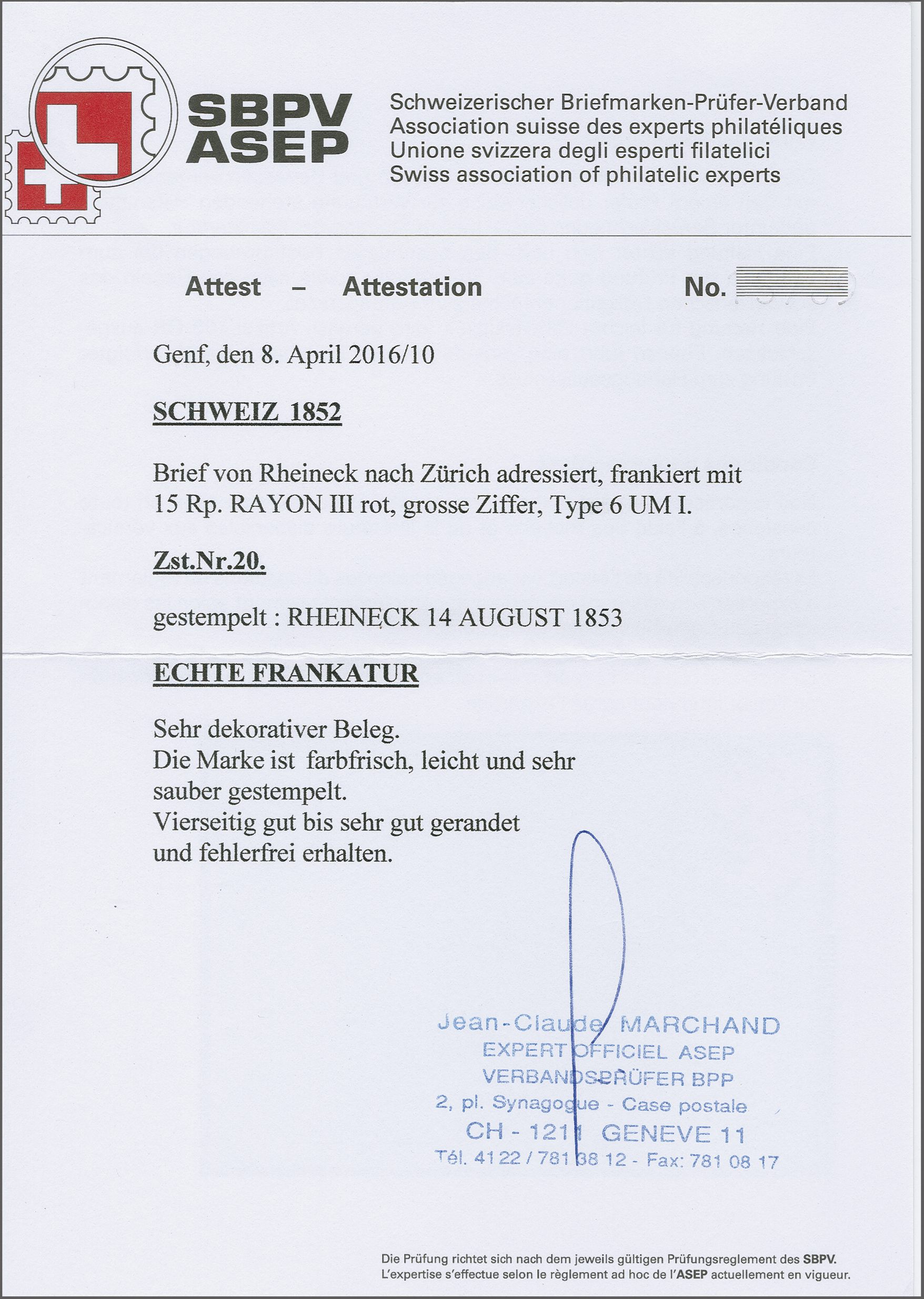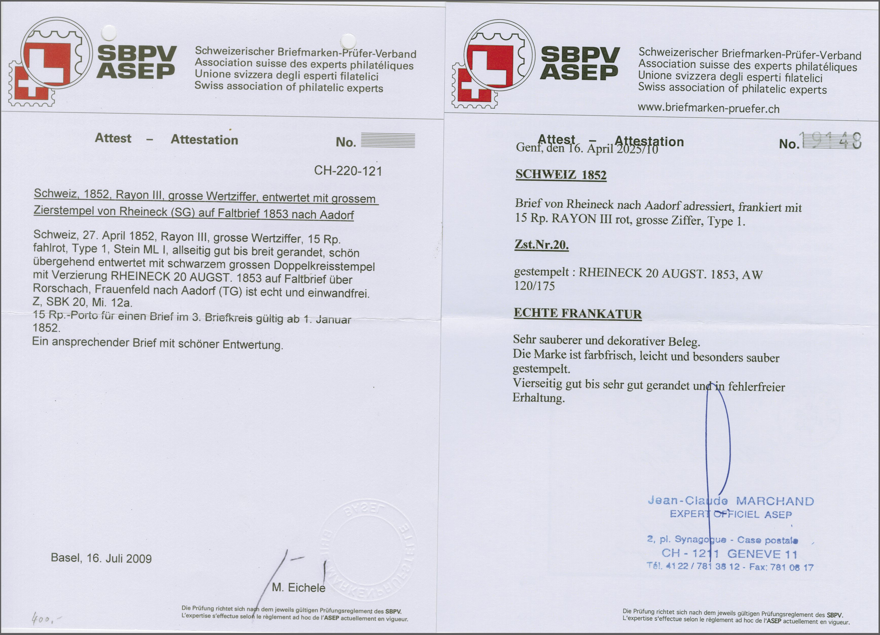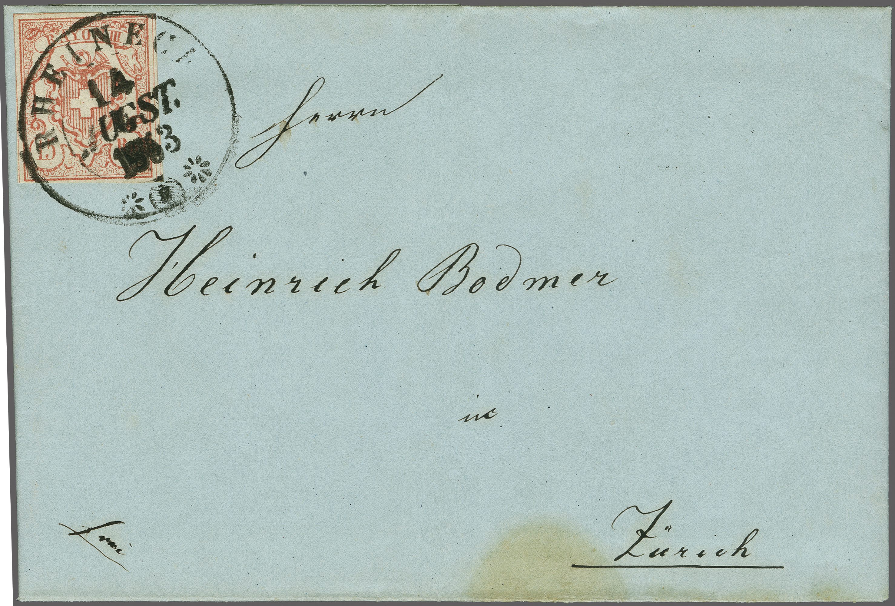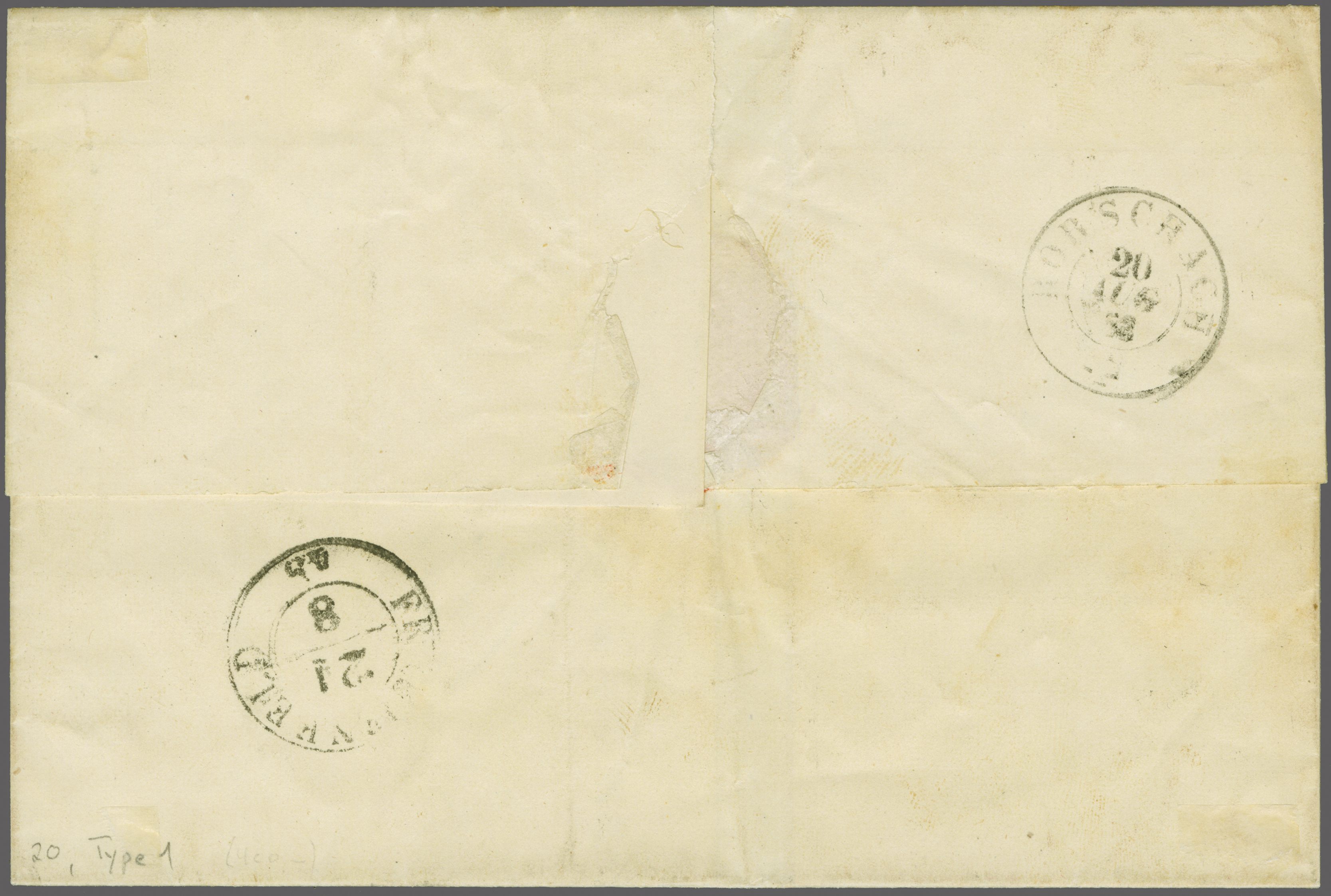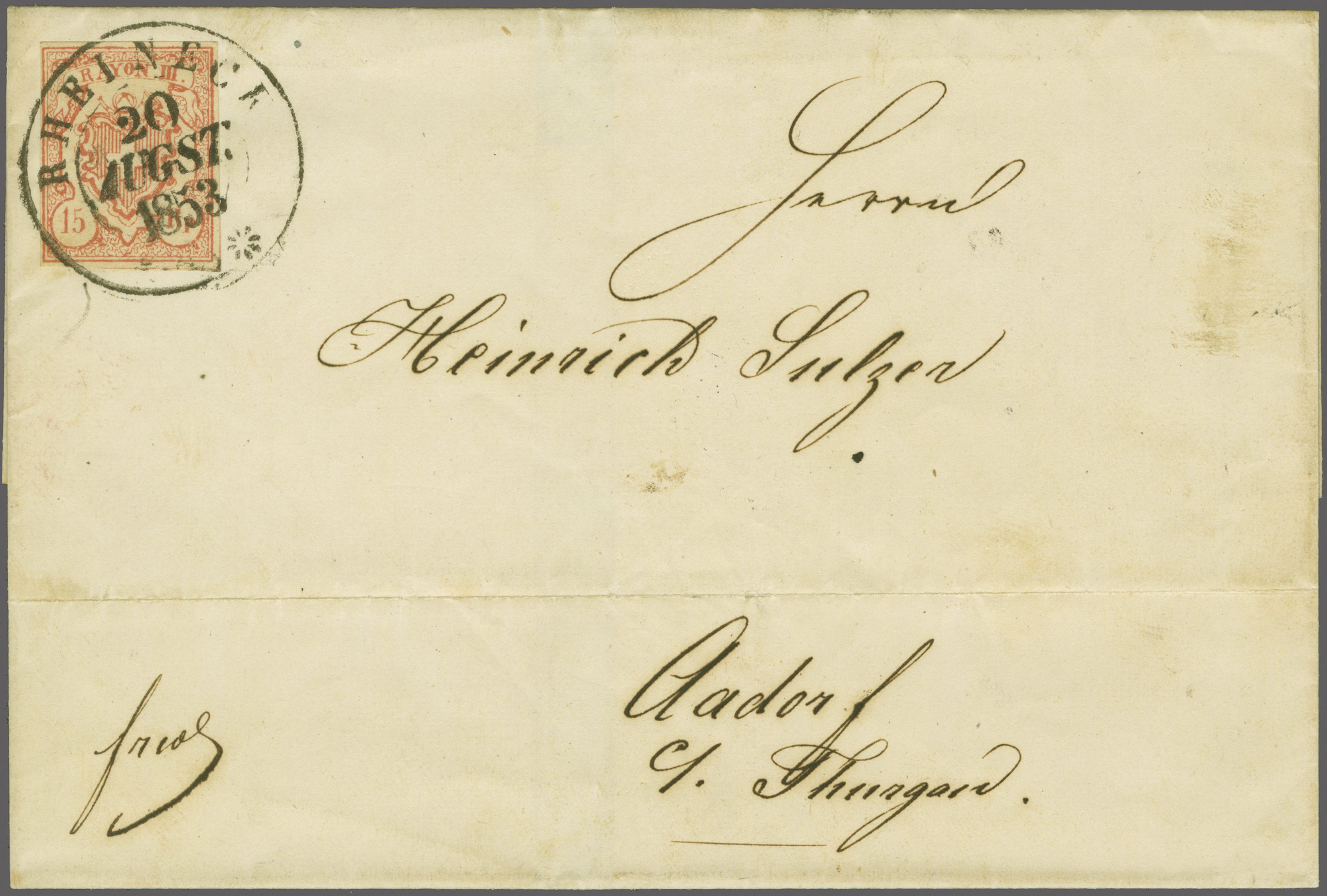 Gr. Wertziffer: Type 1, farbfr. und voll- bis dreiseitig breitrandig, schön klar und übergehend entw. mit grossem Zierkreisstempel "RHEINECK 20 AUGST. 1853" (AW 5244) in schwarz auf Faltbriefhülle datiert "Hard 20. Aug. 1853"