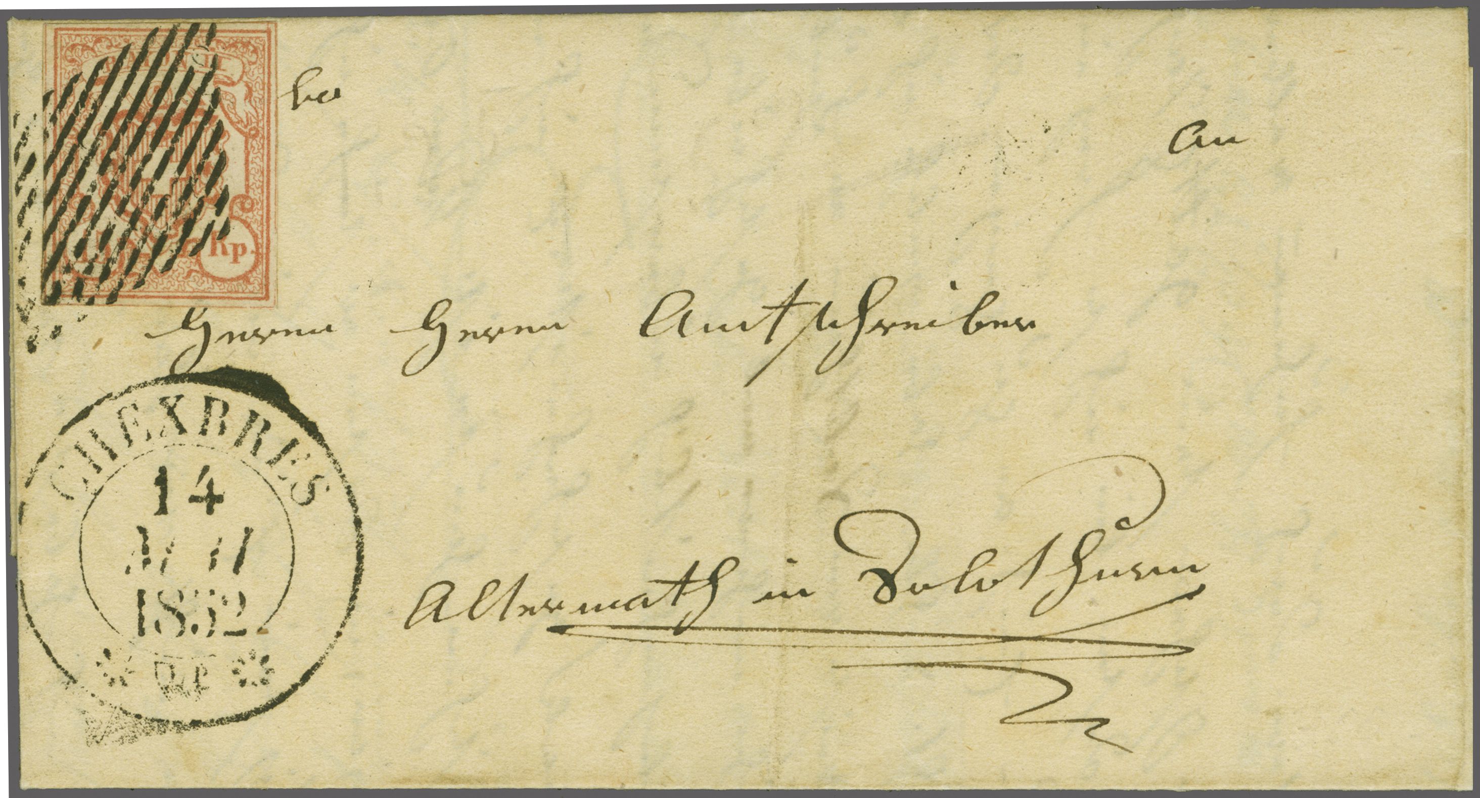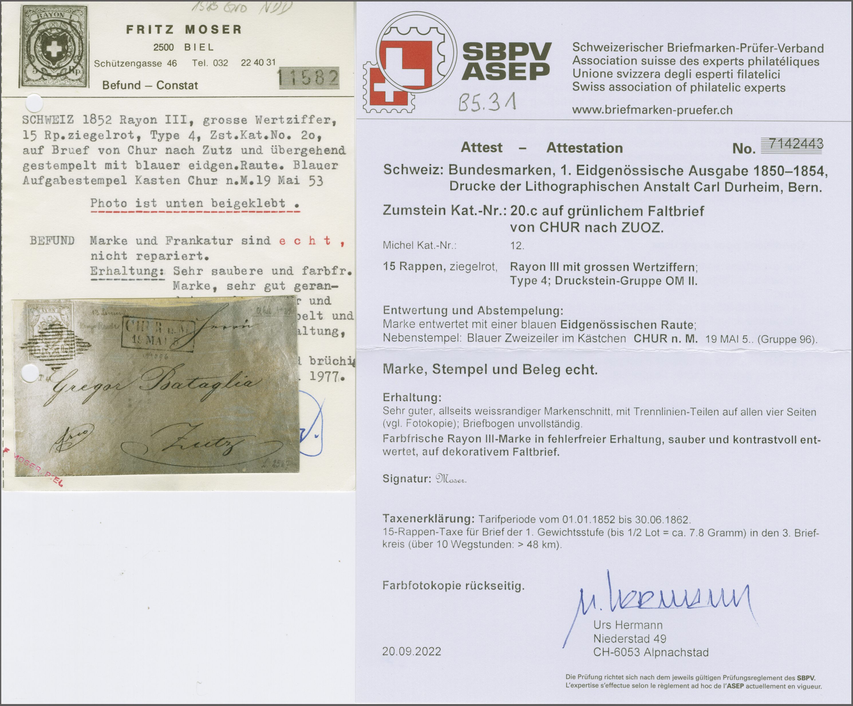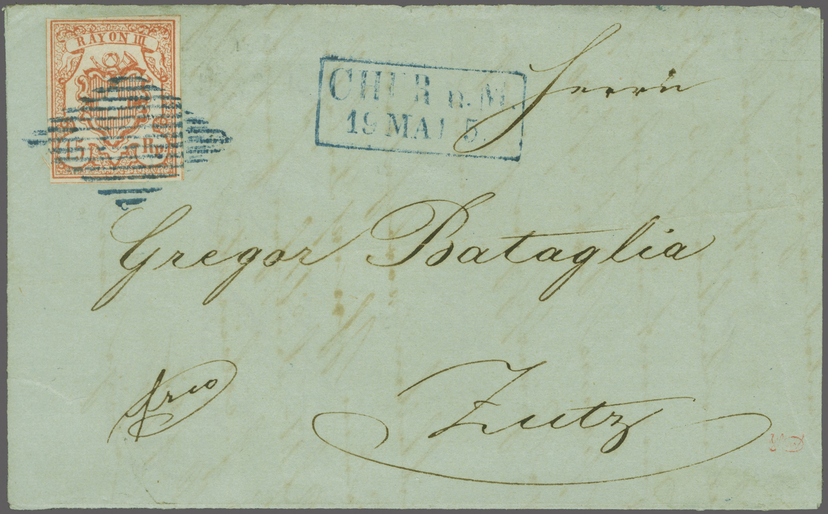 Briefkreis nach Zuoz. Ein bestechend frischer und ausgewogener Bündner Brief; Befund Moser (1977), Attest Hermann (2022). Provenienz: 87. Corinphila-Auktion, Zürich Oktober 1993, Los 1030 (Image 1)