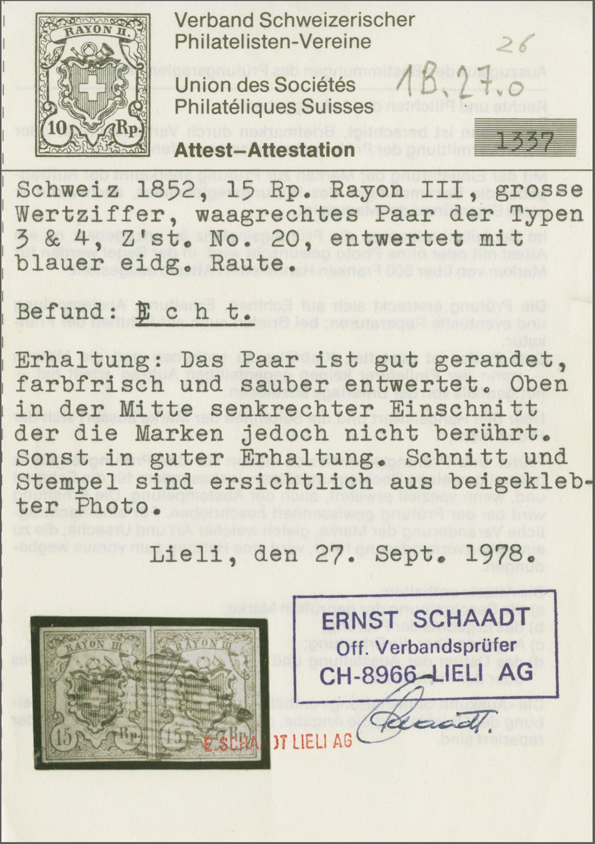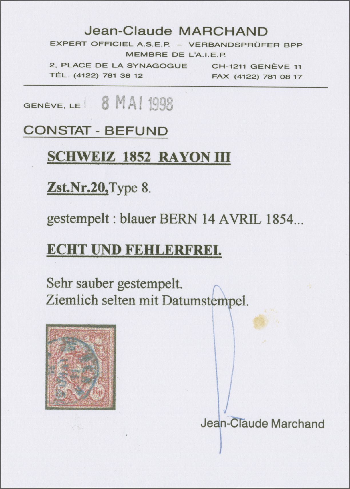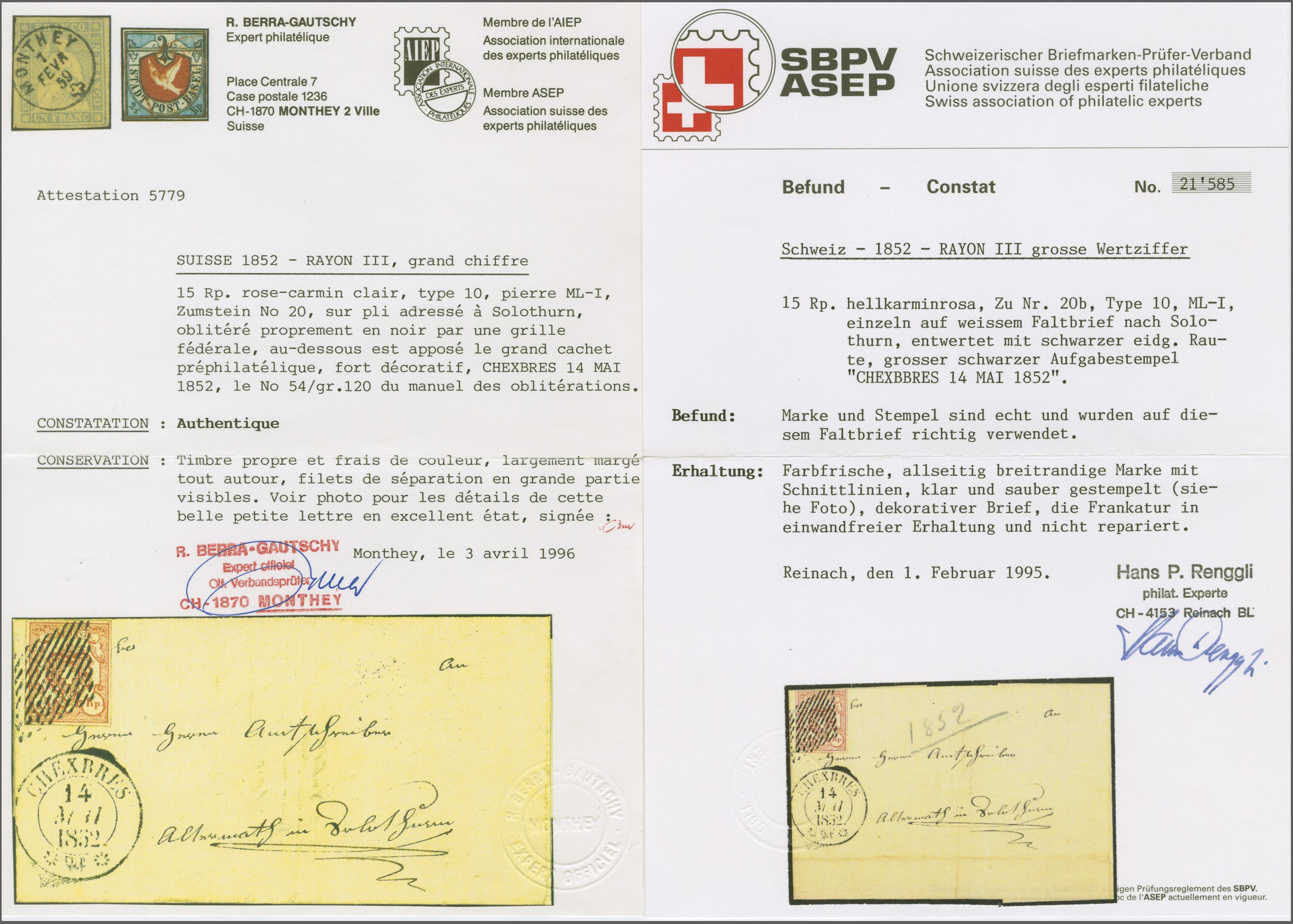 Gr. Wertziffer, Type 10, farbfrisch und breitrandig, schön klar, kontrastreich und übergehend entw. mit schwarzer eidg. Raute mit nebenbes. grossem Zierkreisstempel "CHEXBRES 14 MAI 1852" in der selben Farbe auf frischem und