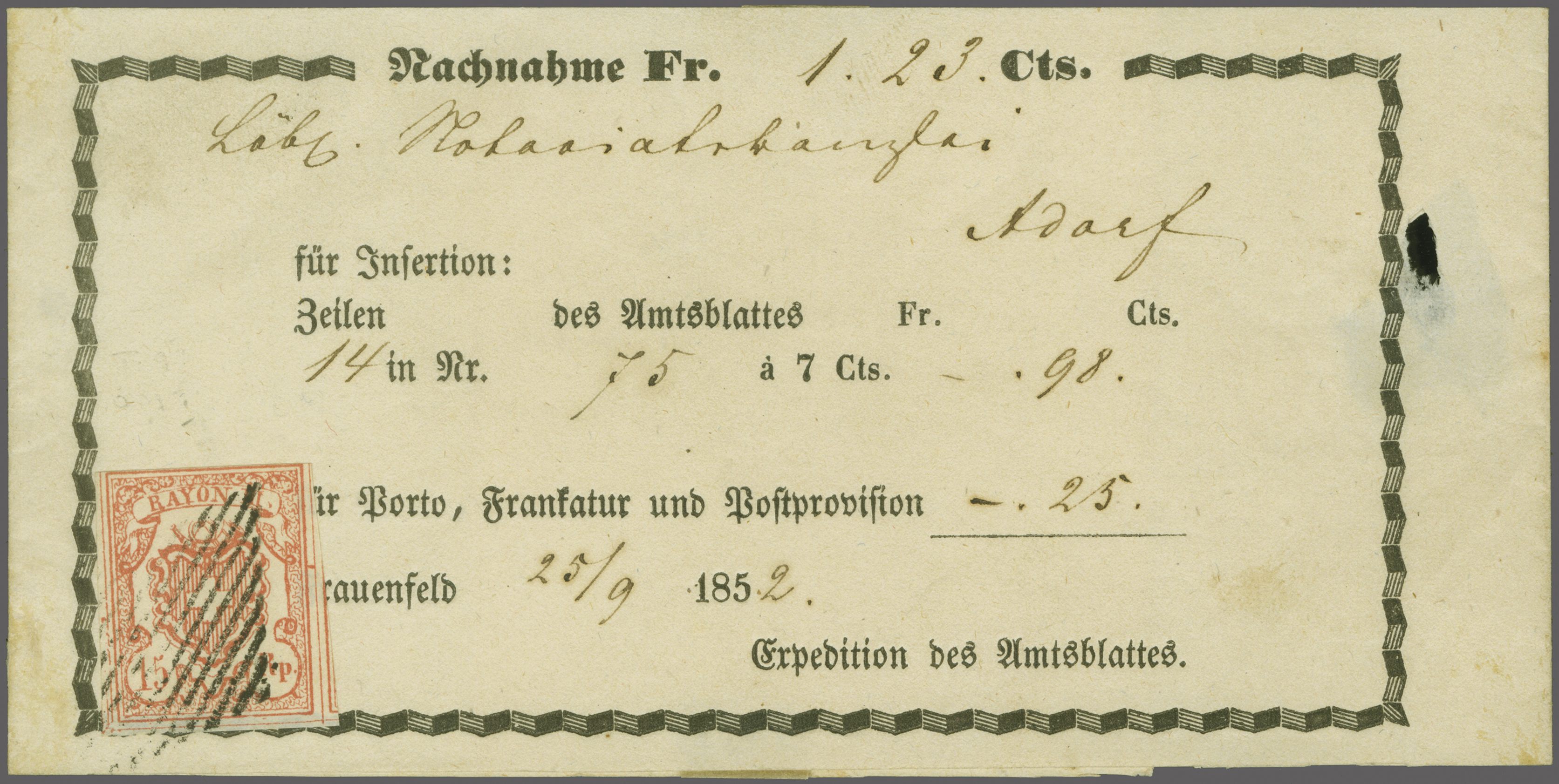 1. & 2. Briefkreis plus 10 Rp. Nachnahme-Mindestprovision laut Tarif vom 1. Januar 1852. Eine attraktive und interessante Nachnahmefrankatur (Image