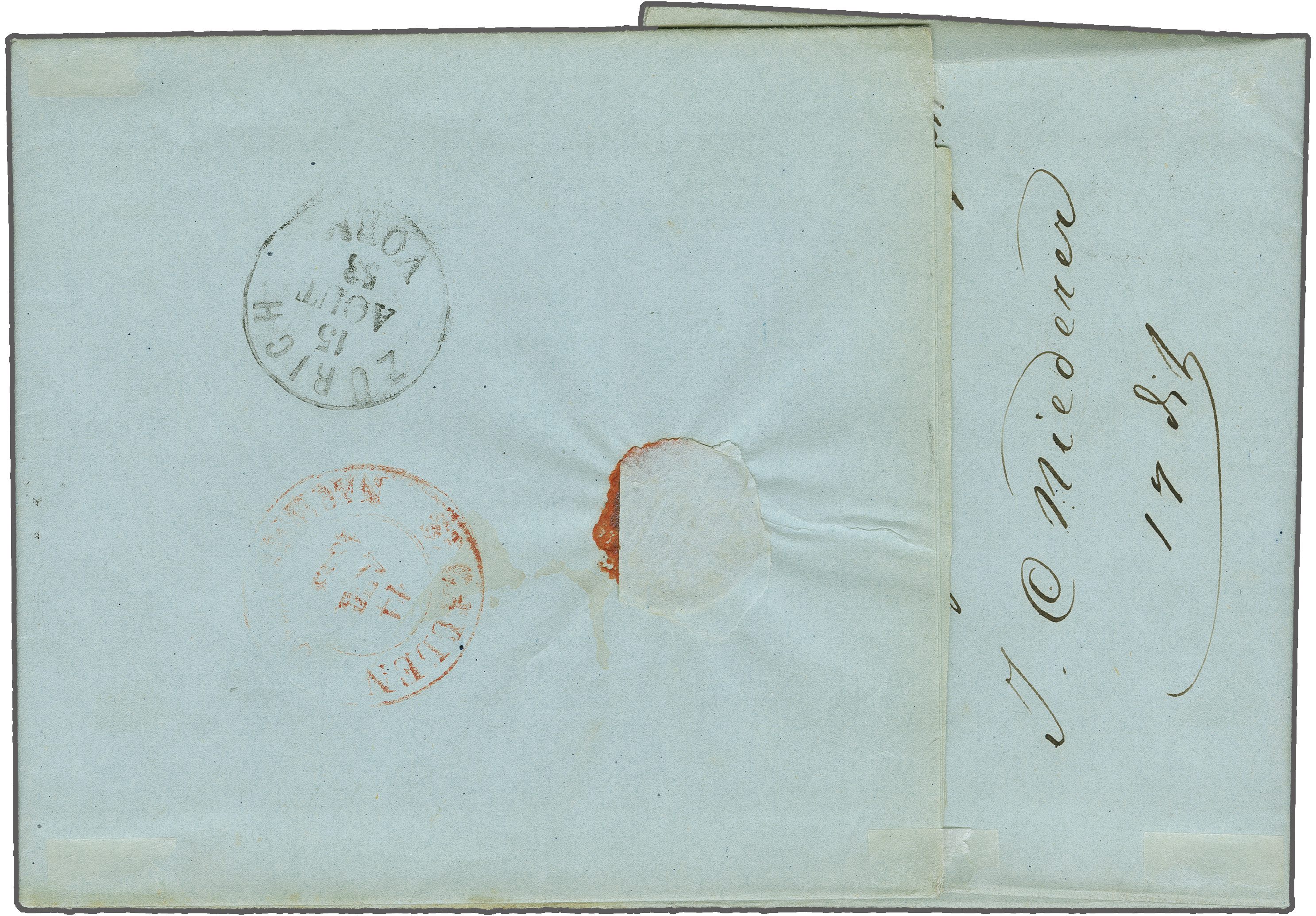 Faltbrief datiert "Lutzenberg den 13ten Augst. 1853" und im 3. Briefkreis an den Kaufmann Heinrich Bodmer in Zürich adressiert. Rücks. Transitstp. "ST. GALLEN 14. AUG. 1853 NACHMITTAG" und Ankunftsstp. vom Folgetag. Ein schöner Brief; Attest Marchand