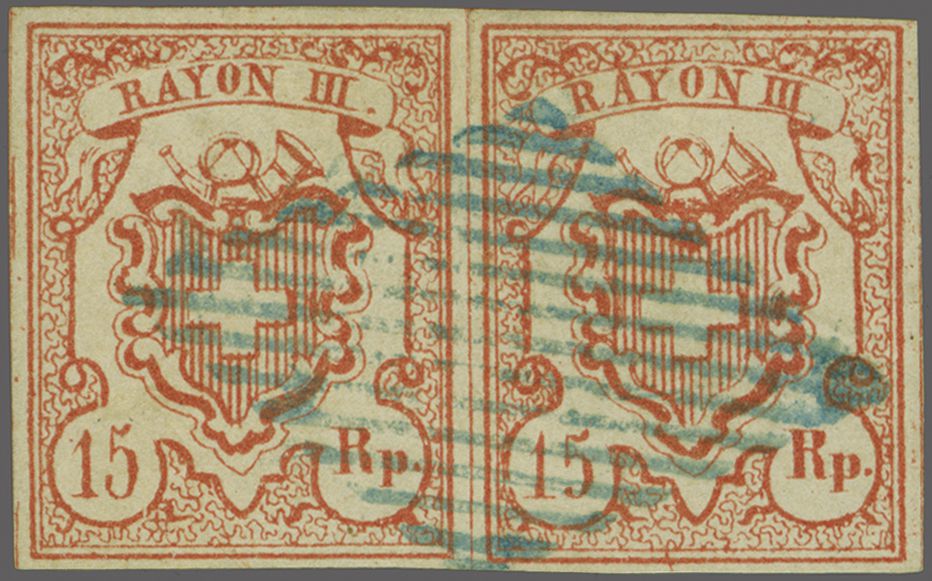 Gr. Wertziffer: Typen 3+4 im waagr. Paar, farbr. und breitrandig (Vortrennschnitt zwischen den Marken), zusammen klar und kontrastreich entw. mit blauer eidg. Raute. Befund Schaadt (1978) (Image 1)
