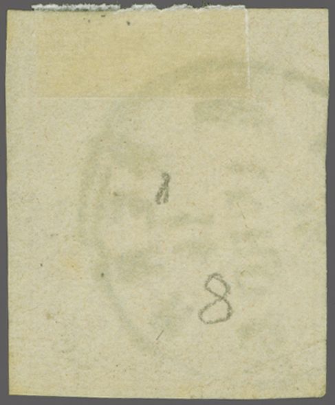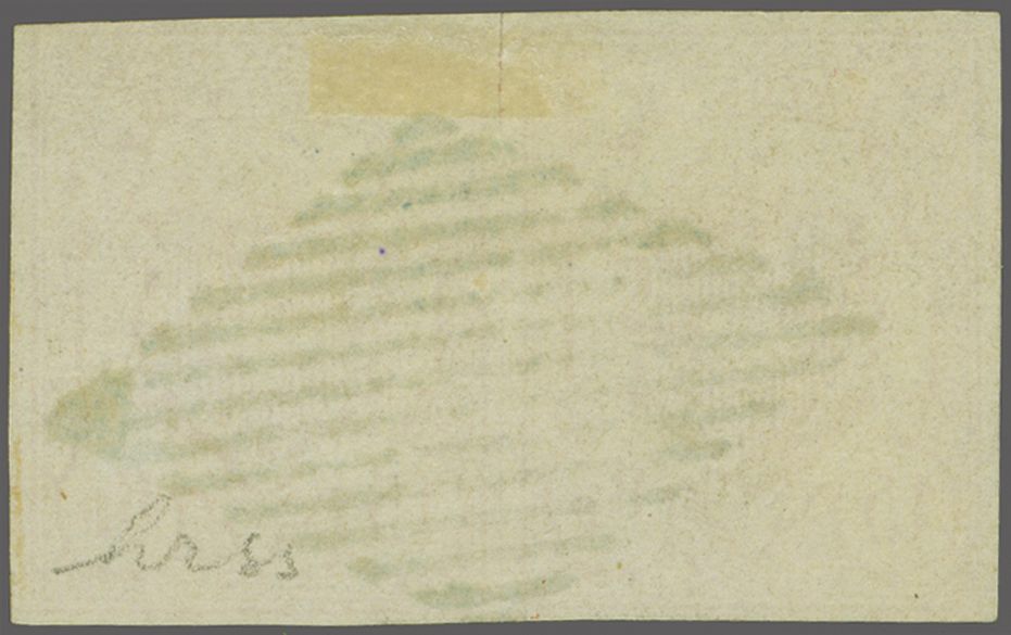 Gr. Wertziffer: Type 6 mit Plattenfehler "halbkreisförmige Linie im unteren Rand", farbfr. und breit- bis überrandig mit vierseitig sichtbaren Trennlinien und Ansatz der linken Nebenmarke, schön zart und übergehend entw. mit