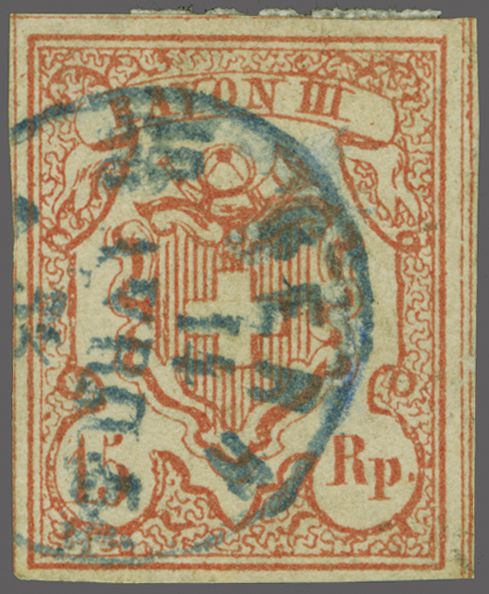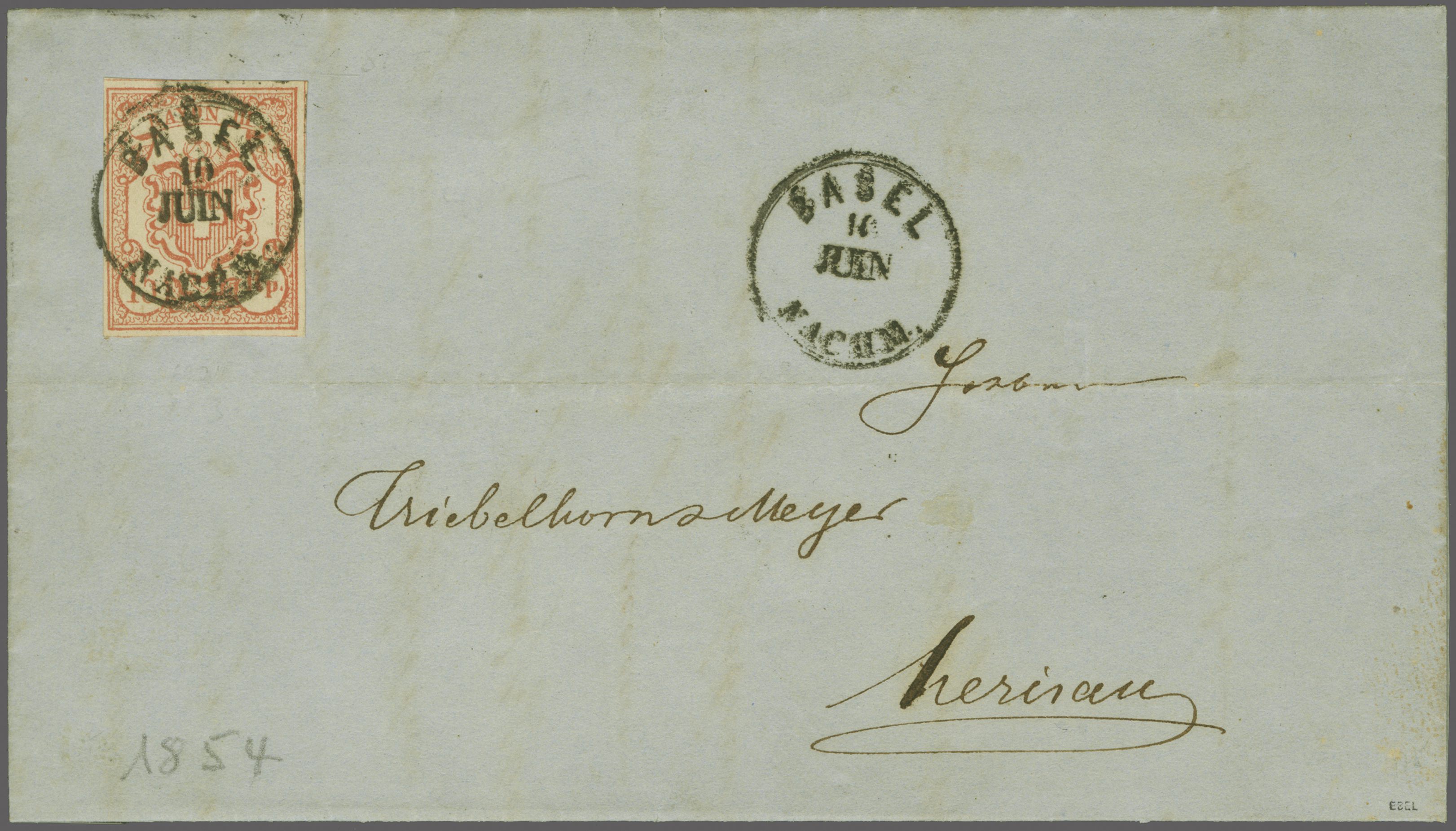 Gr. Wertziffer: Type 3, farbfr. und gut- bis dreiseitig breitrandig, klar, zentrisch und doch leicht übergehend entw. mit Blockschrift-Einkreisstp. "BASEL 10 JUIN NACHM" ohne Jahreszahl (AW 4876), dieser nebenstehend nochmals