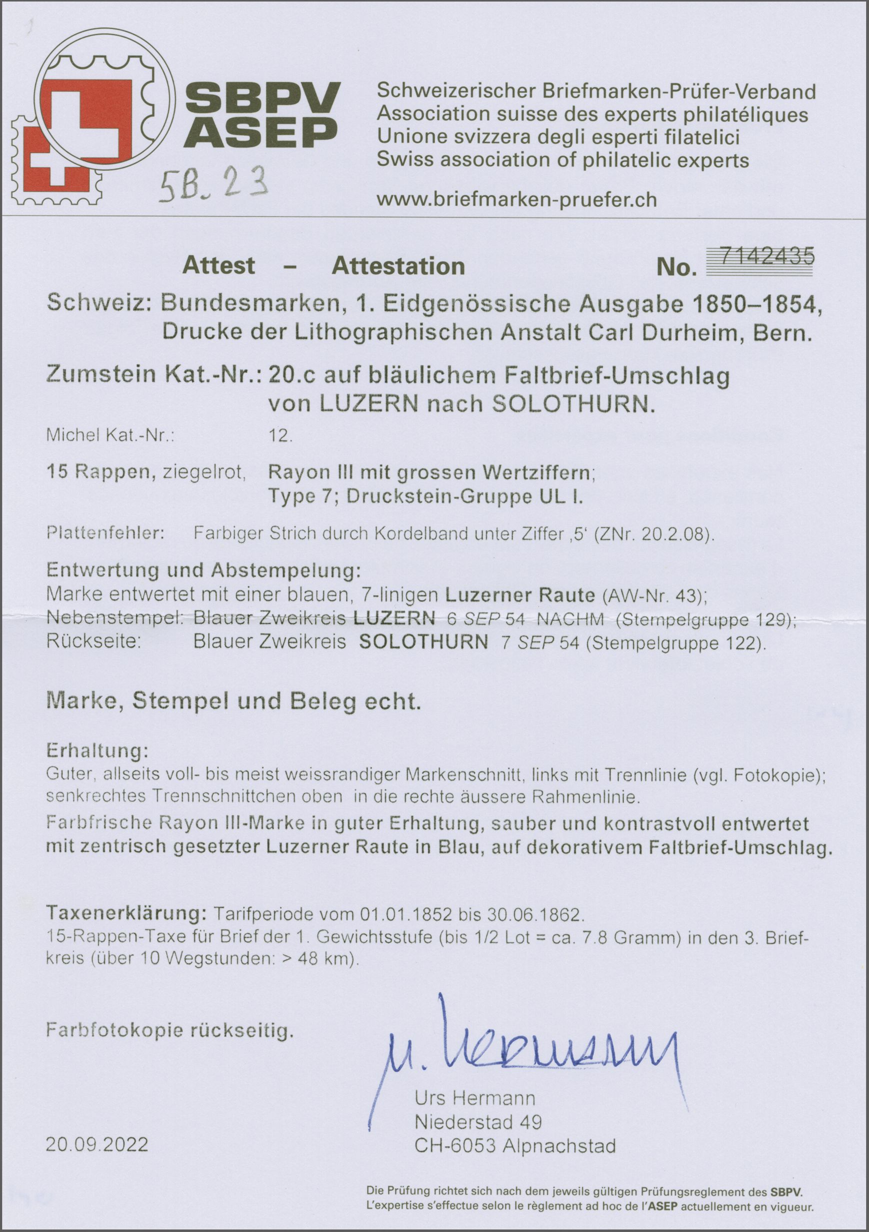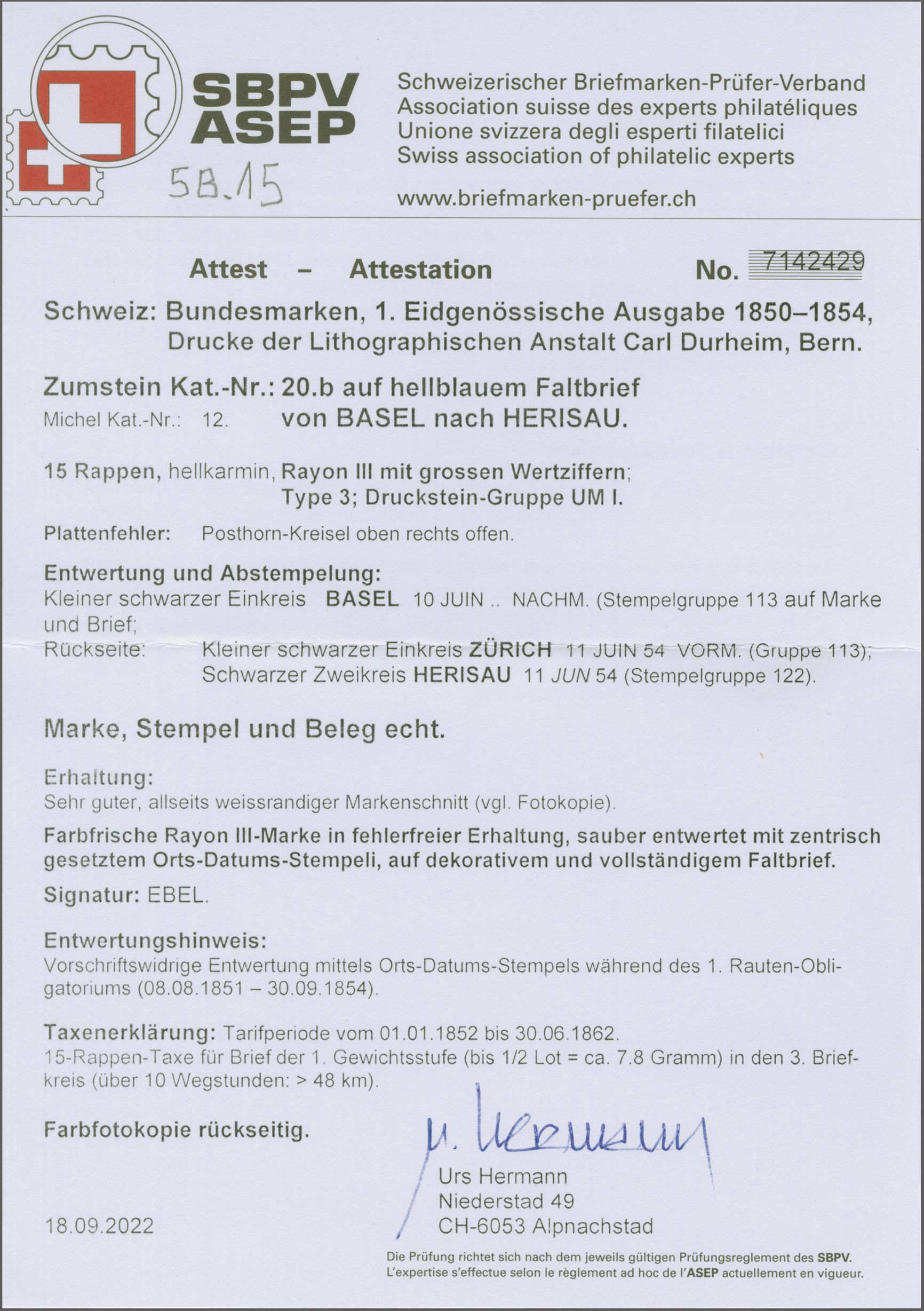 ausgewogener Brief mit dieser vorschriftswidrigen Basler Datumstempel-Entwertung während des ersten Rautenobligatoriums; signiert Ebel und Hunziker, Attest Hermann (2022) (Image 1)