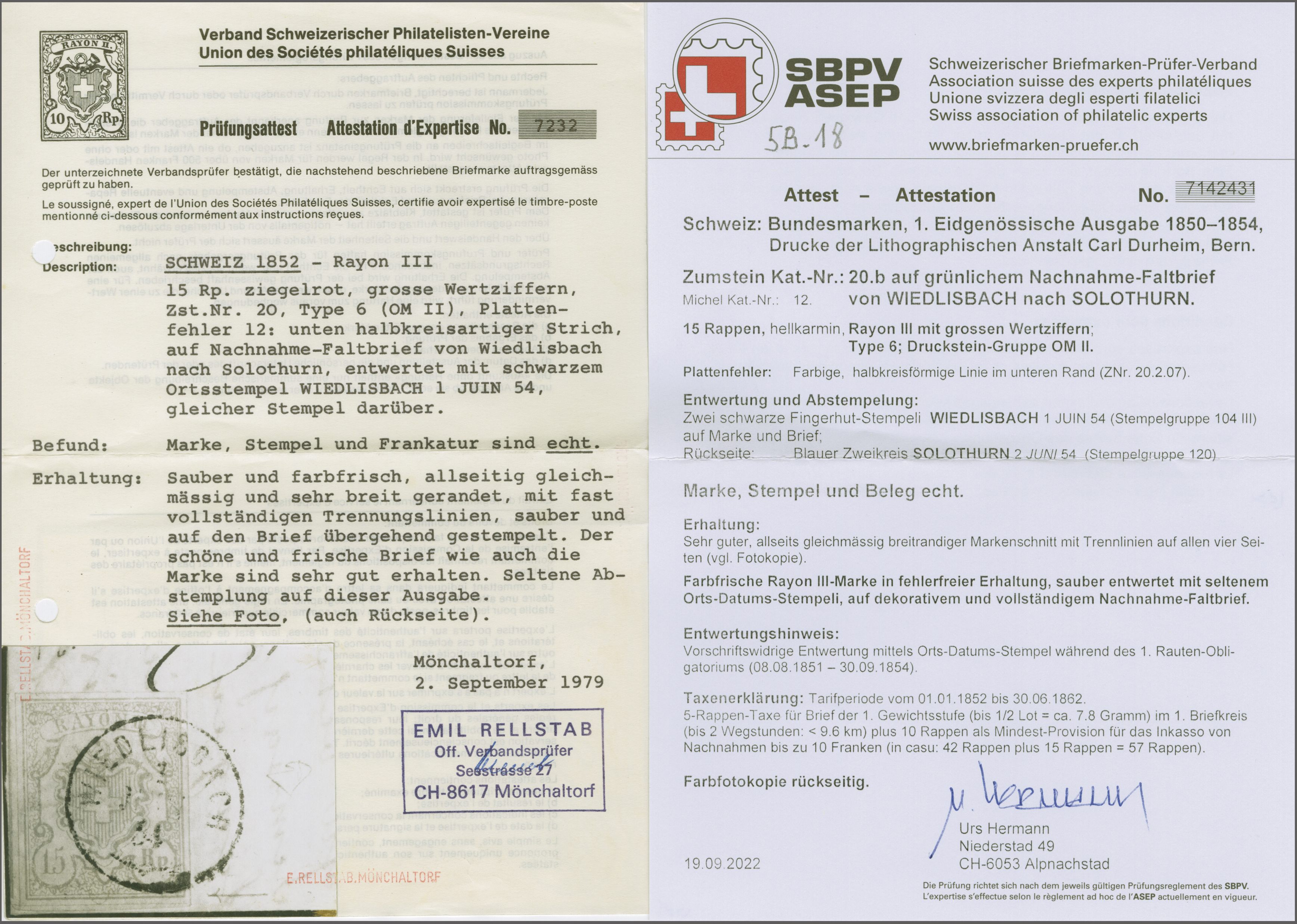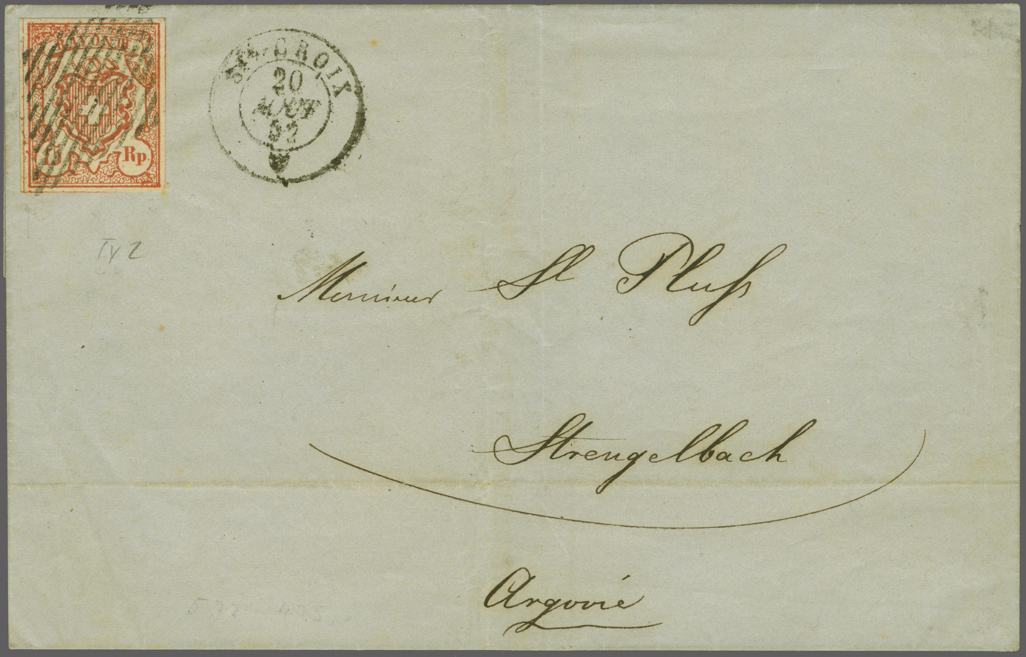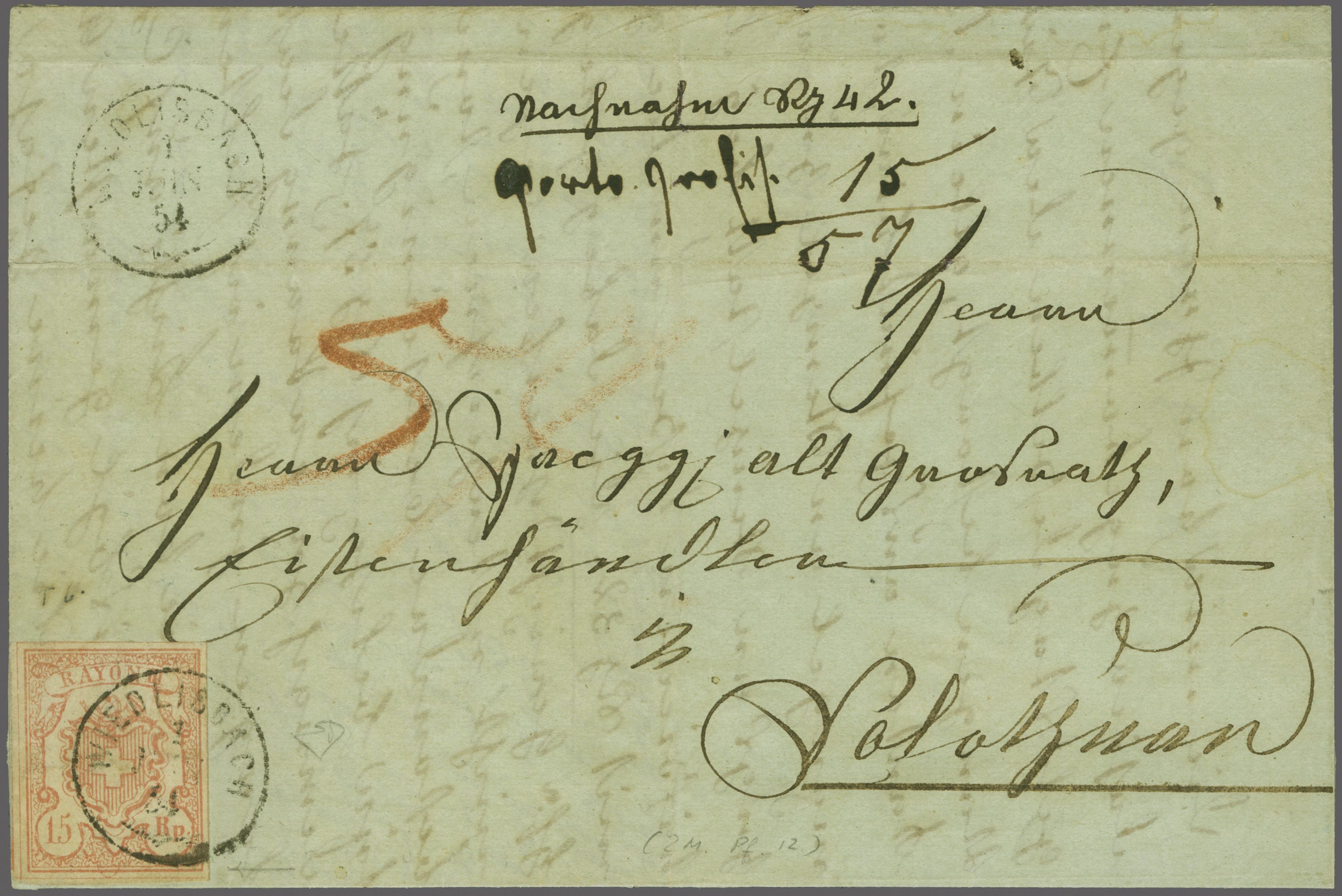 Rücks. Ankunftsstp. vom Folgetag. Korrekt frankiert mit 5 Rp. im 1. Briefkreis plus 10 Rp. Nachnahme-Mindestprovision im zweiten eidg. Tarif von Januar 1852. Eine dezente und sehr seltene Oberaargauer Entwertung; Atteste Rellstab (1979) und Hermann