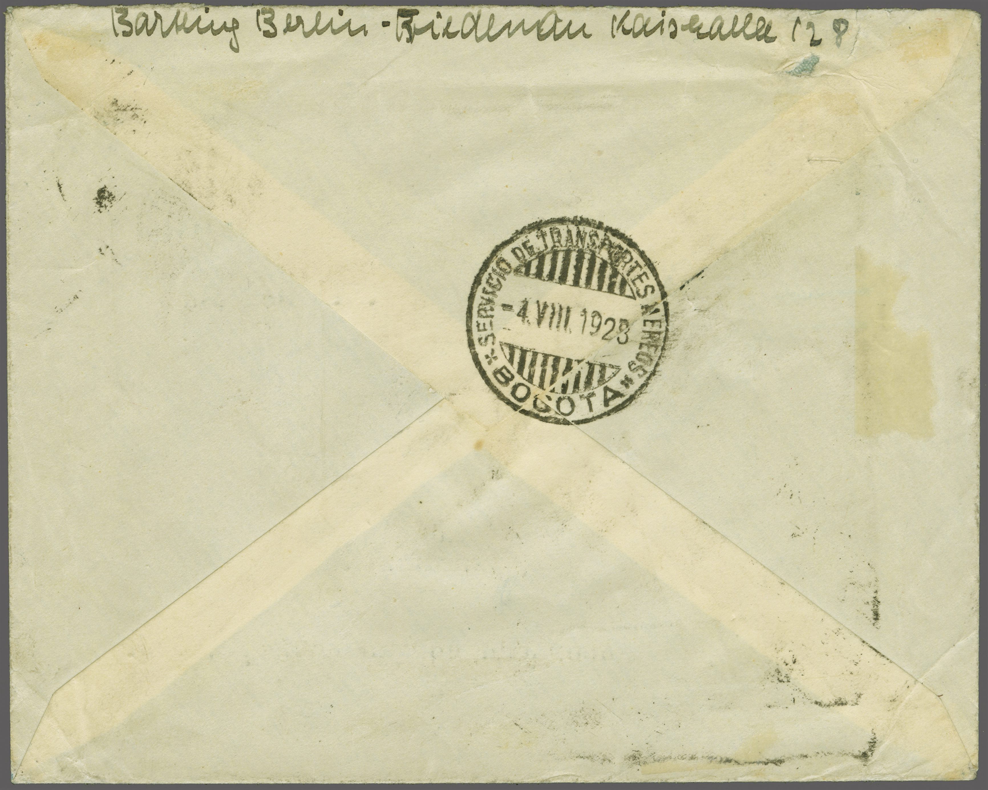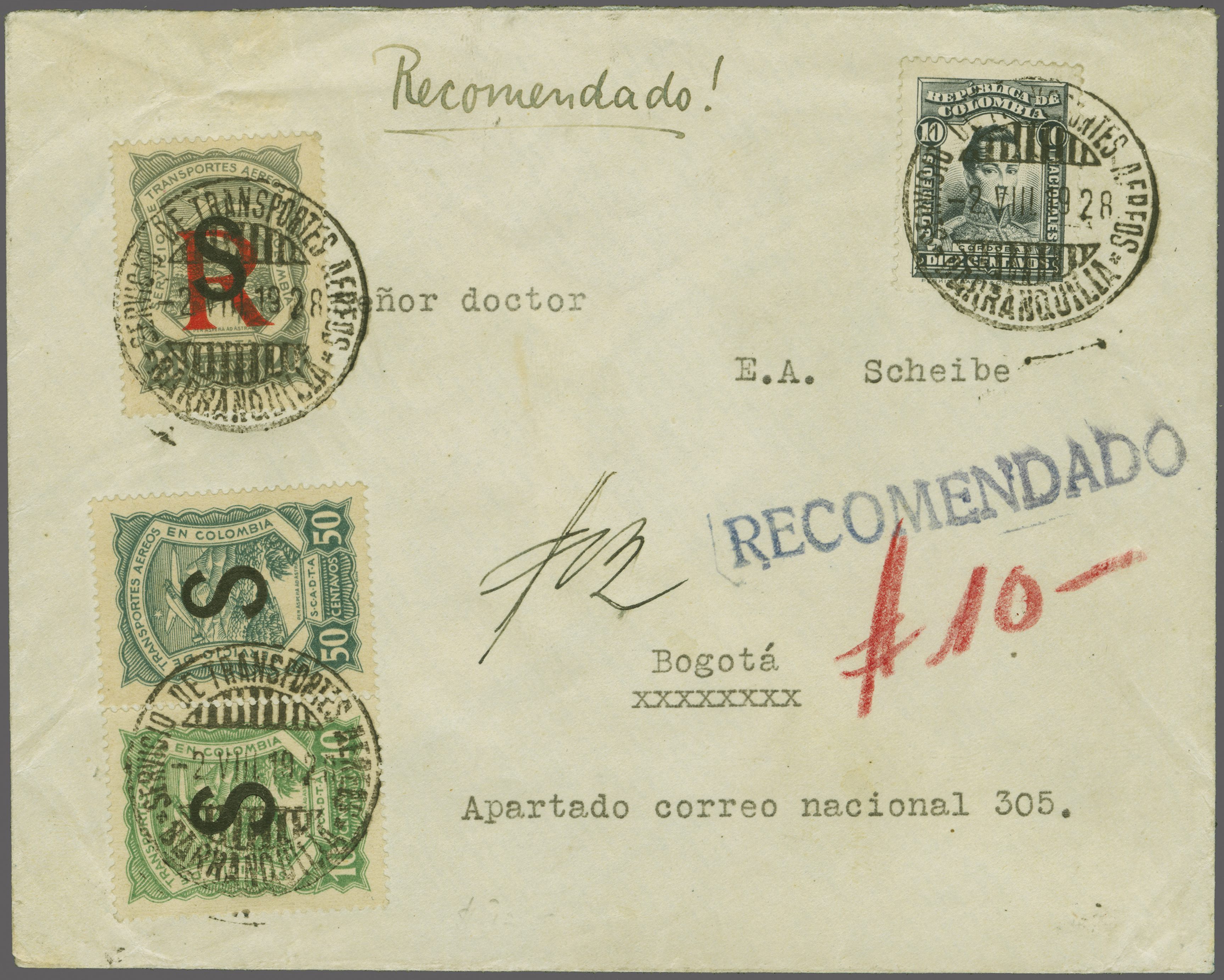 Scadta Konsularpost 1928 (2. Aug.): Einschreibebrief mit Absender von Berlin-Friedemann Kaiserallee nach Bogotà, frankiert mit Maschinenstp. 'S' auf Scadta 1923/28 10 c. gelbgrün, 50 c. grünblau und Einschreibemarke kleines