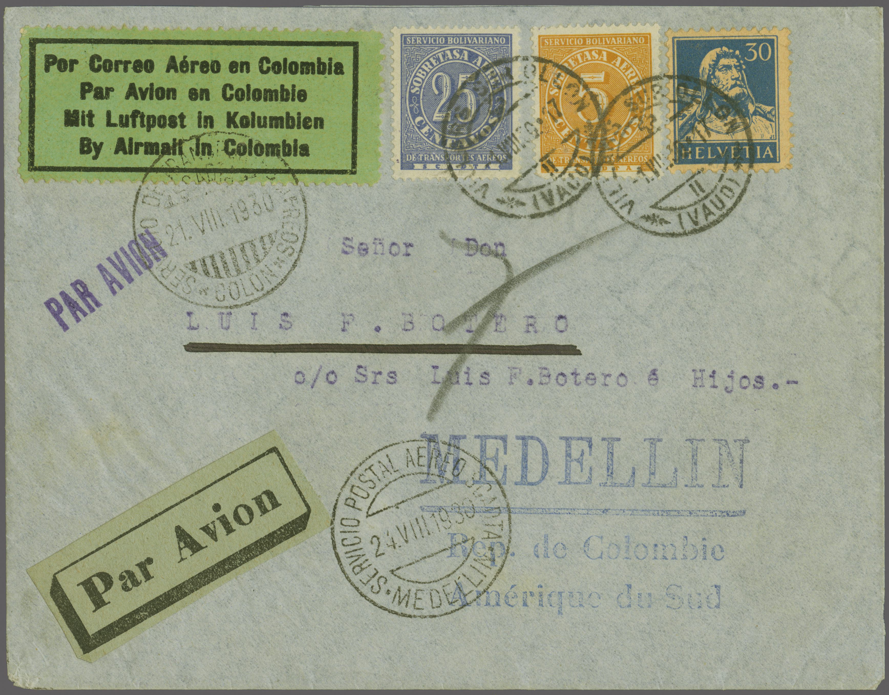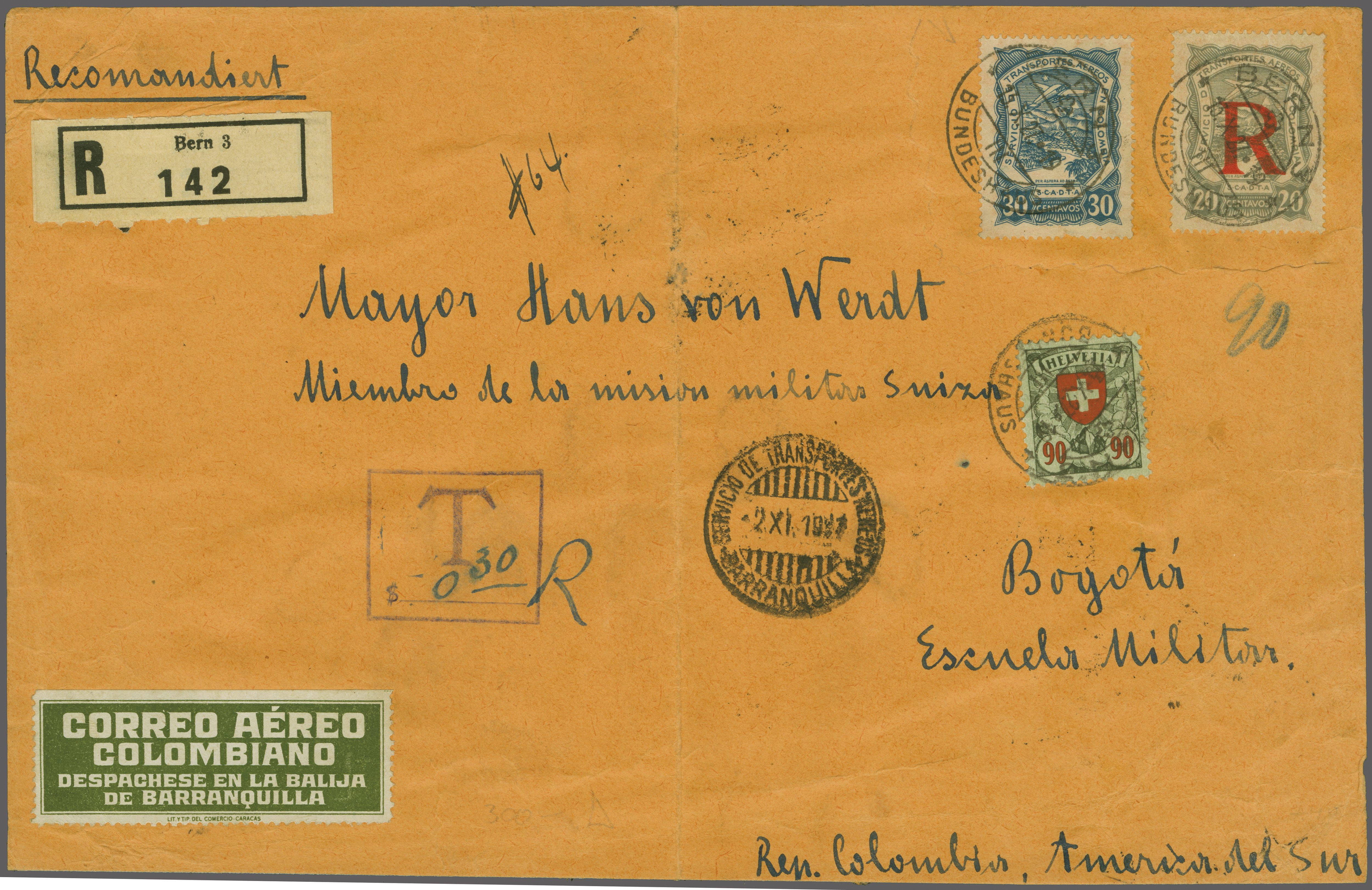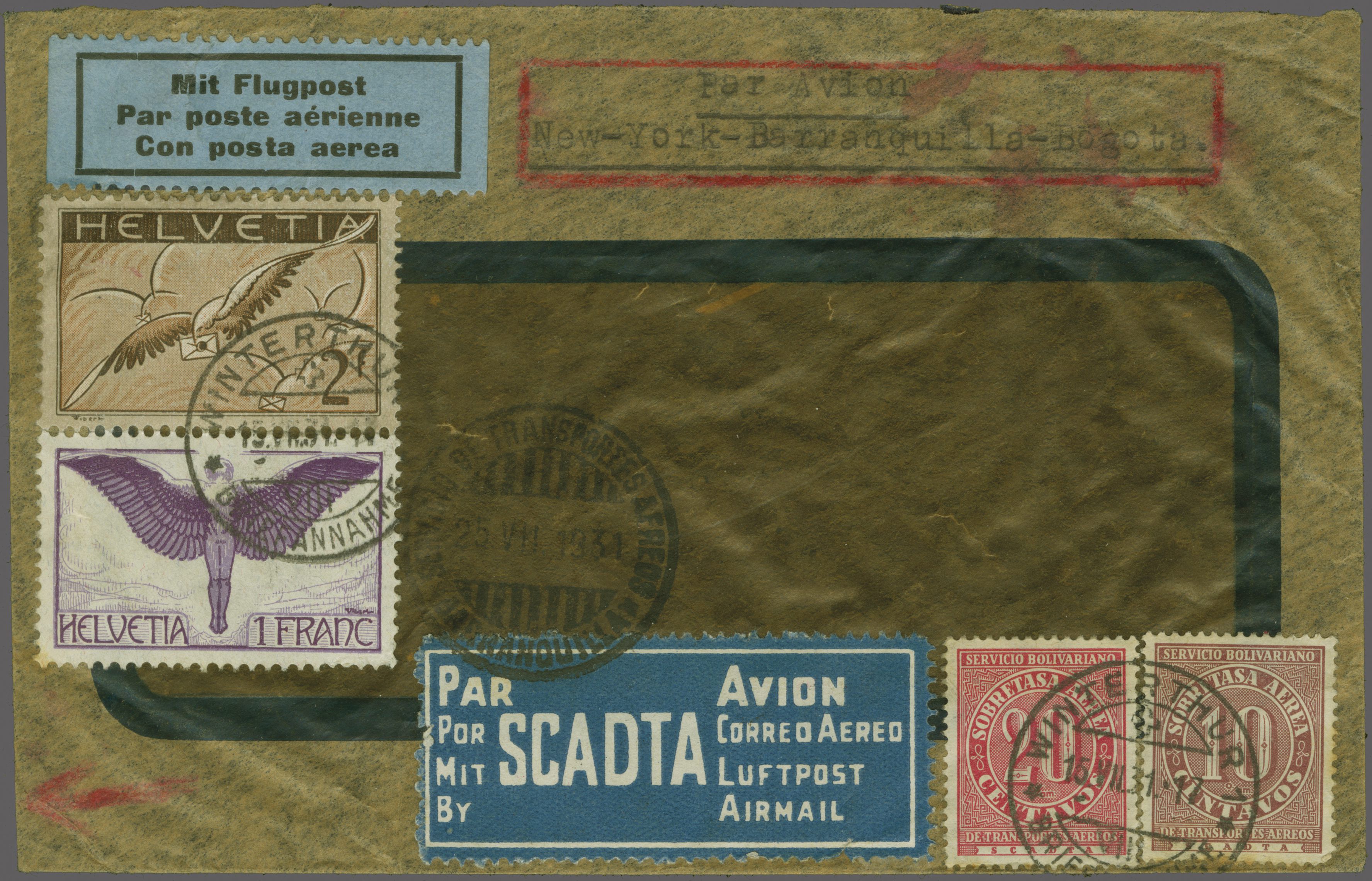 Fr. 3.85, via "Barranquilla 25.VII.1931" nach "Bogotà 26.VII.1931". Das Porto betrug 30 Rp. plus Luftpostzuschlag Fr. 3.50 bis 20 Gramm Gewicht. SLH = CHF 2'500 (Image 1)