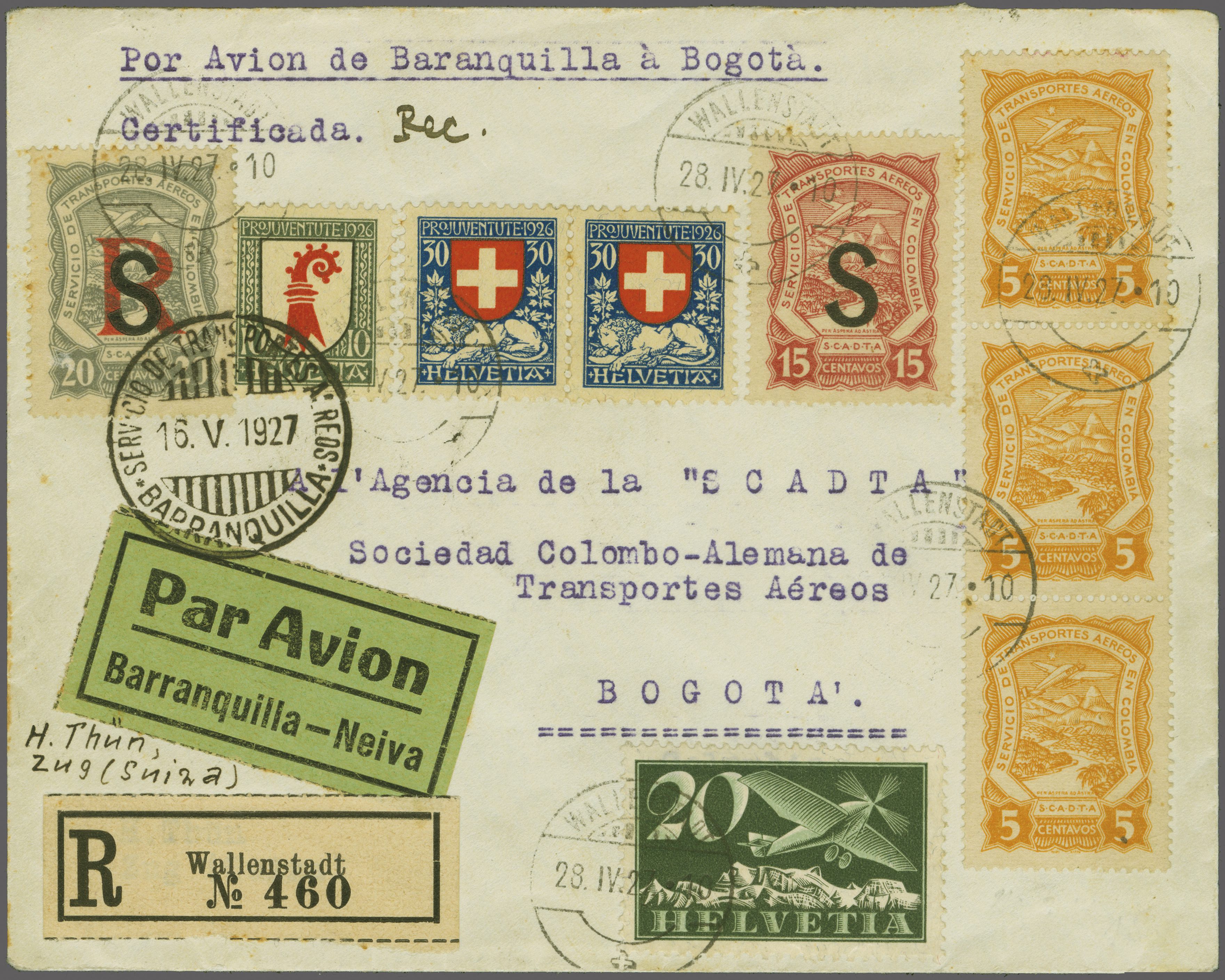 Scadta Konsularpost 1927 (28. April): Einschreibebrief von Wallenstadt frankiert mit Pro Juventute 1926 10 Rp. plus 30 Rp im Paar und CH-Flugpost 20 Rp., dazu Maschinenaufdruck 'S' auf 15 c. karmin mit Einschreibemarke zu 20