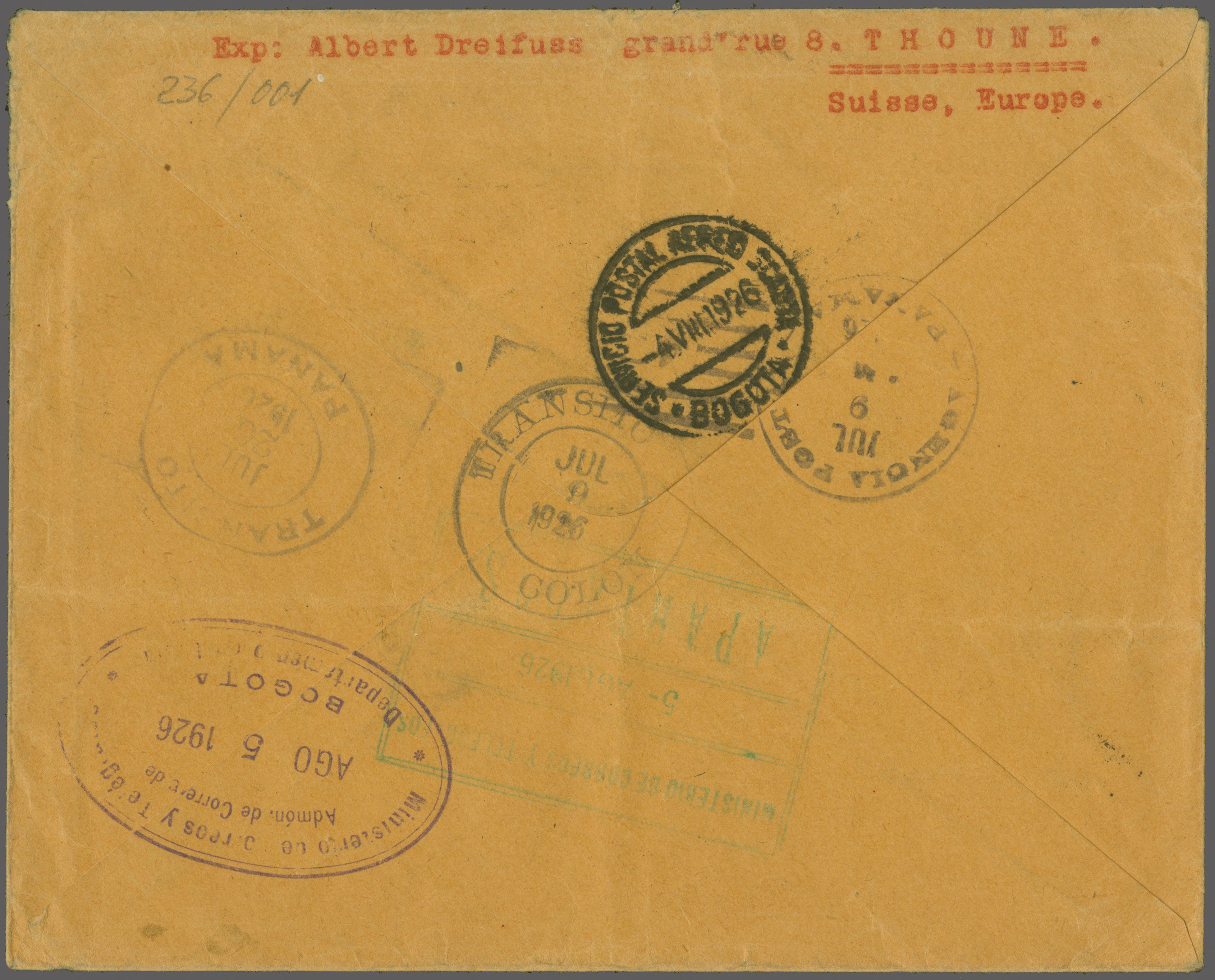 auf 30 c. blau in Transit gest. "Barranquilla 2.VIII. 1926" zur Weiterleitung per Scadta nach Bogotà, mit rücks. AStp. vom 4. August. Ein seltener Beleg mit allen Transitstp. via Panama nach Kolumbien SLH = CHF 1'200 (Image 1)