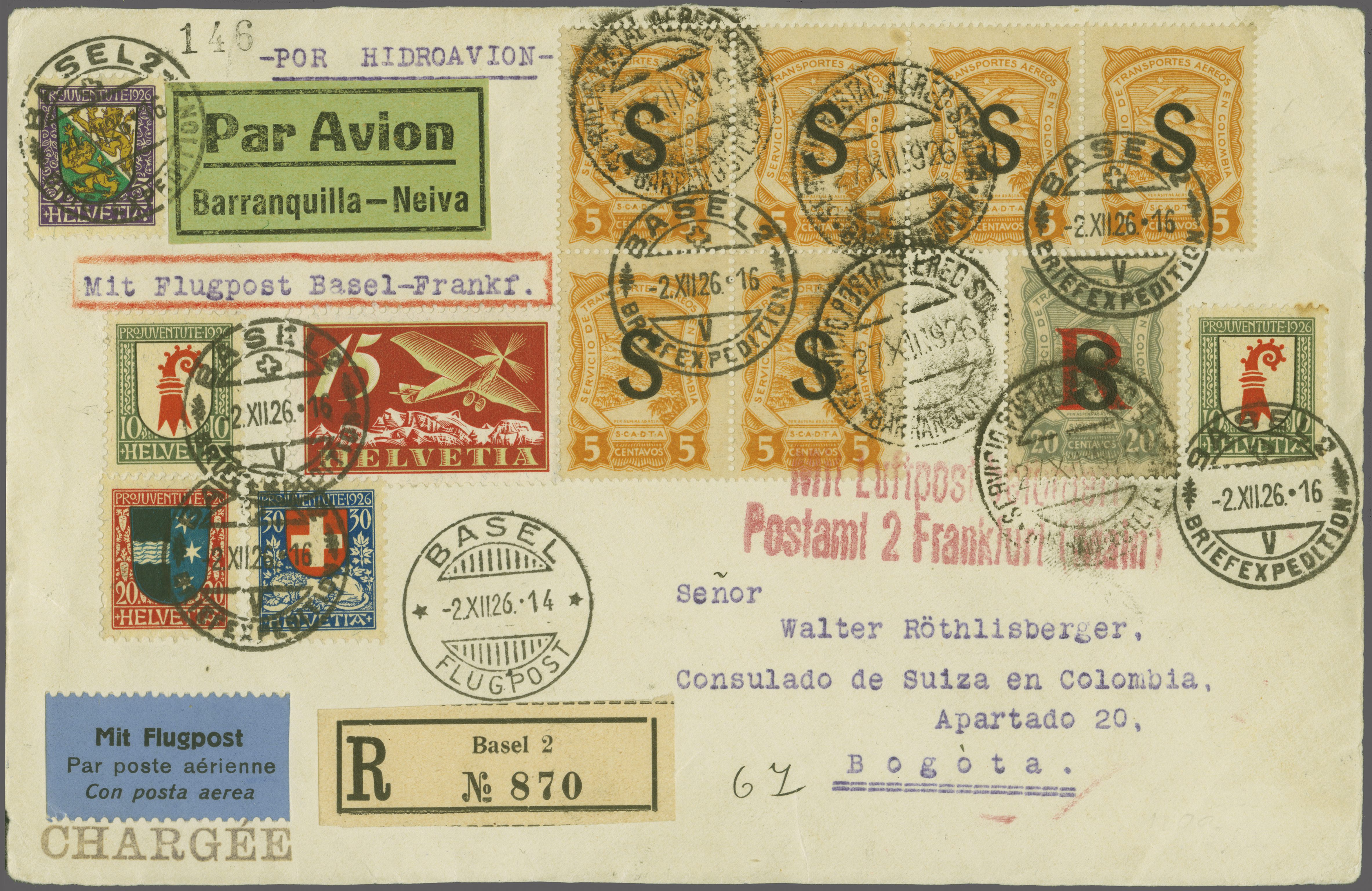 unregelm. Sechserblock 5 c. gelborange und Einscheibemarke 20 c., alle sauber entw. "Basel 2 Brief Expedition 2.XII.26.16" mit dt. Leitvermerk "Mit Luftpost befördert / Postamt 2 Frankfurt (Main"), adressiert an Konsul Röthlisberger in Bogotà mit