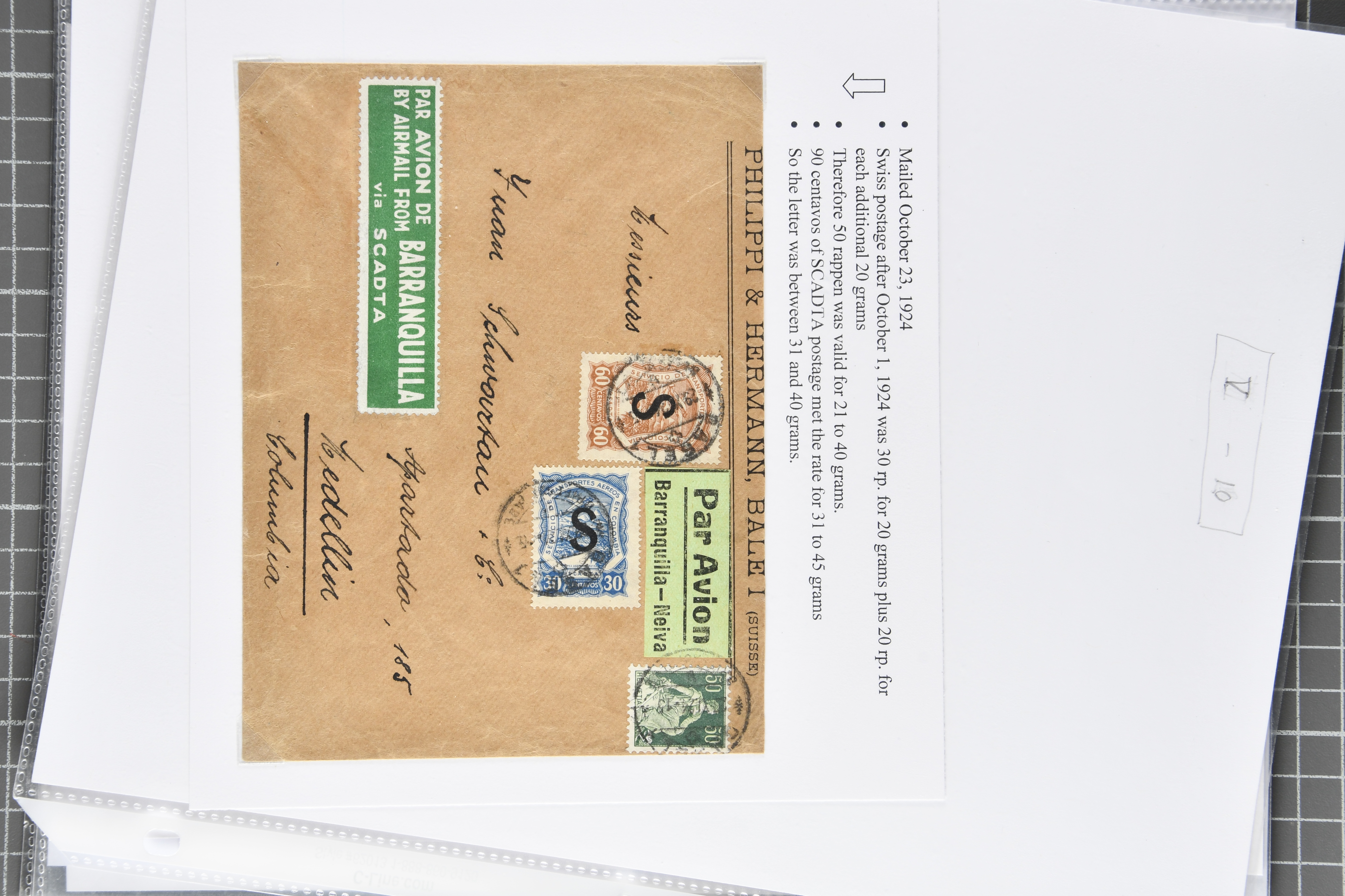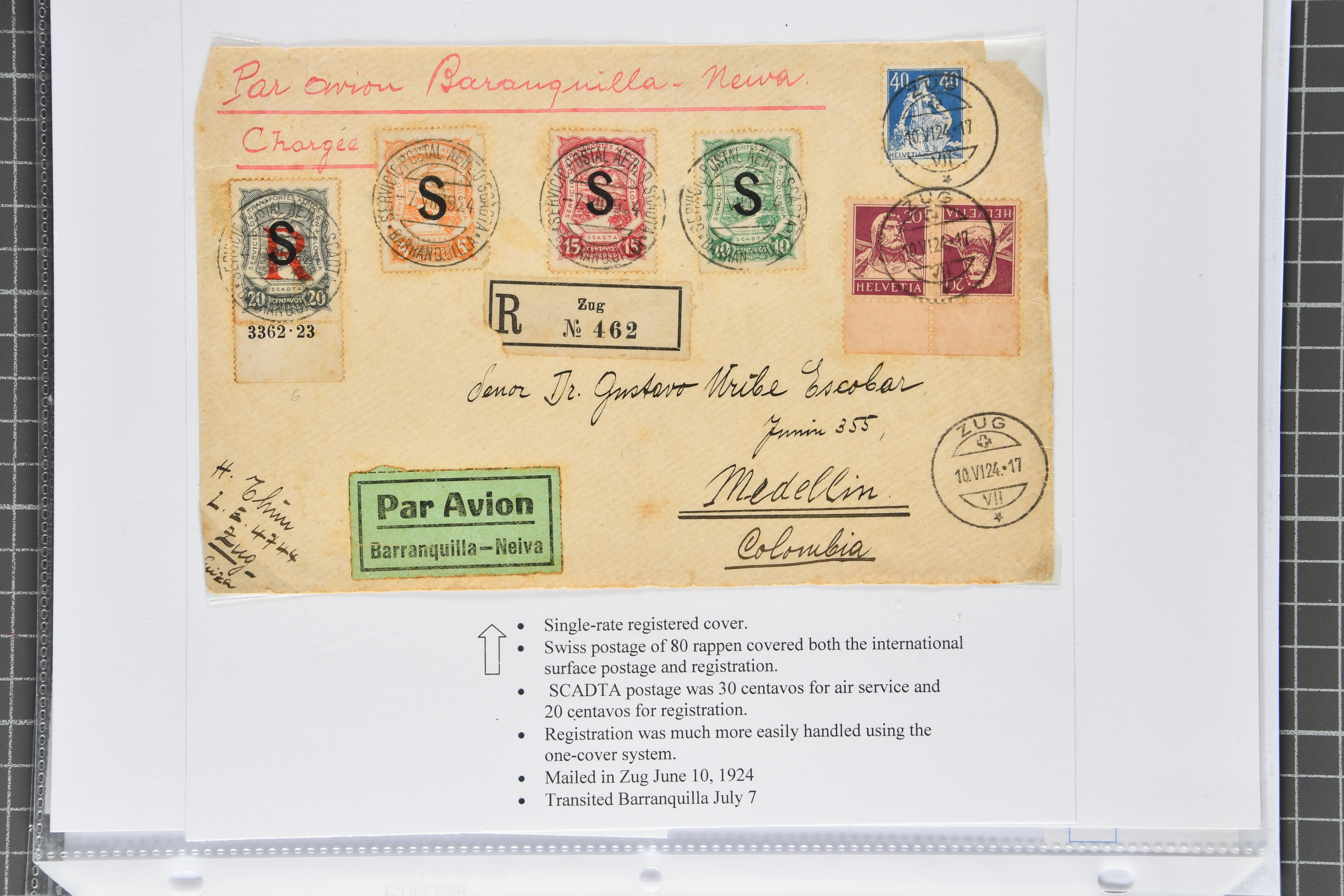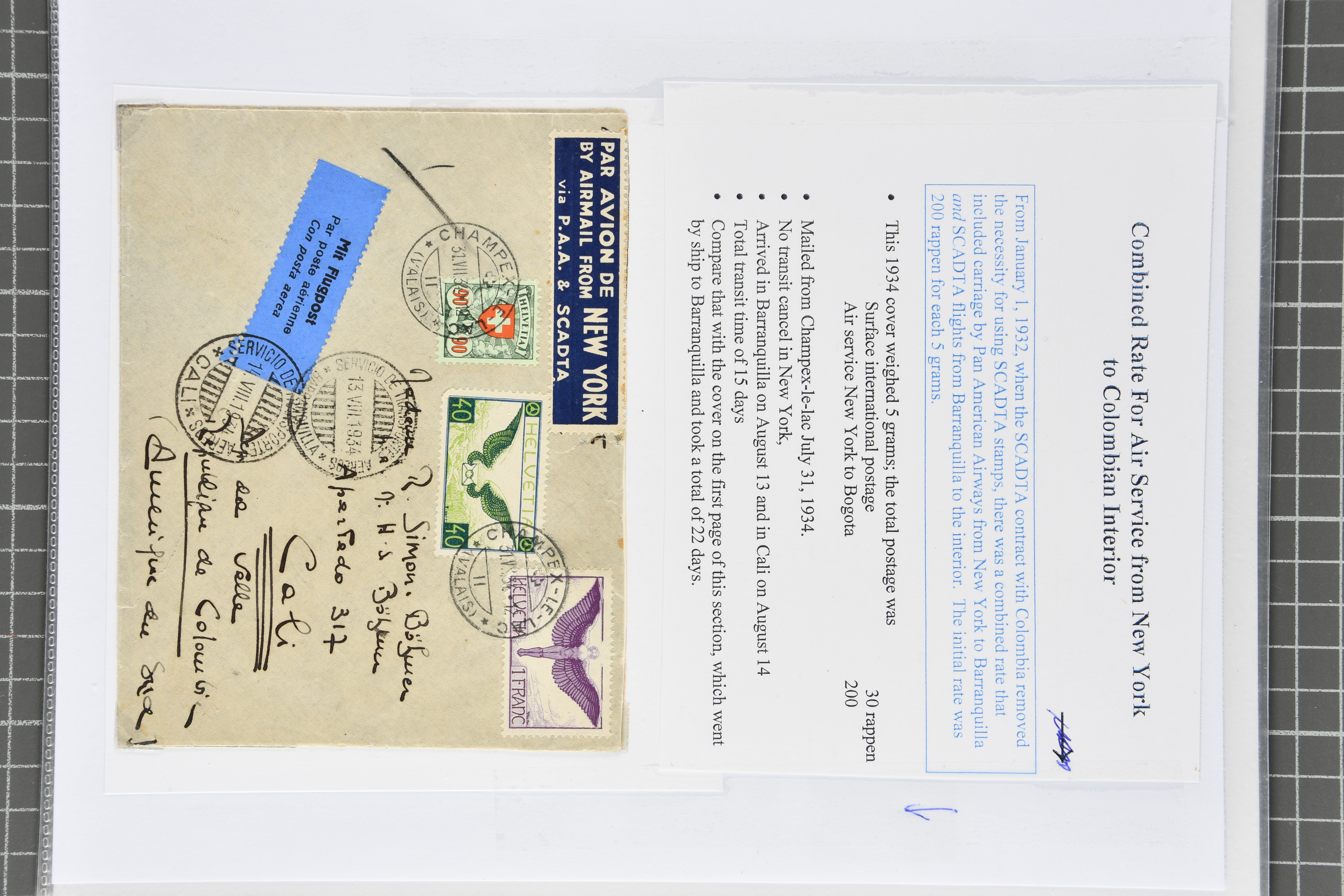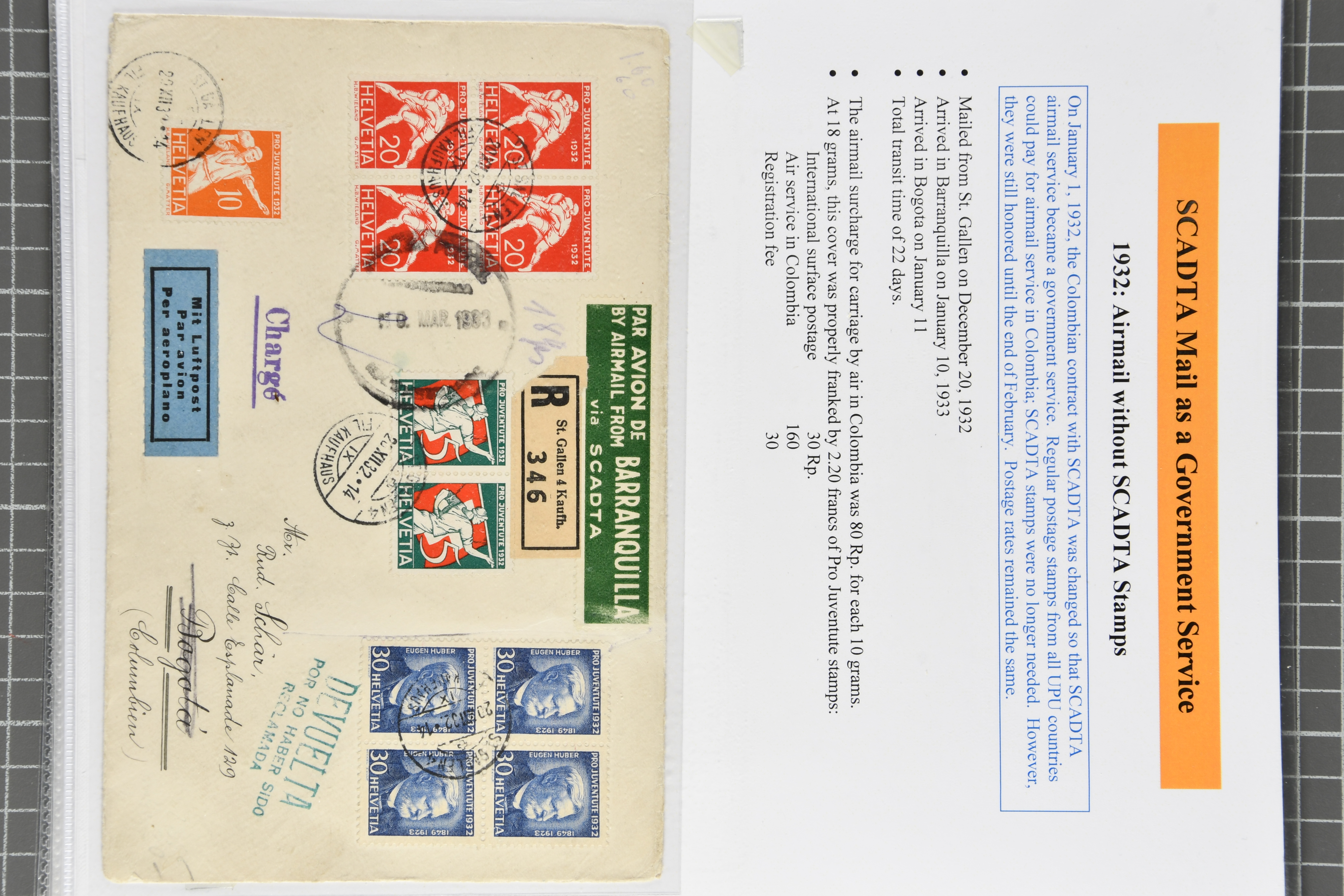 Scadta Zusatzfrankatur von St. Gallen (20.12.32) aus der späteren Zeit als keine Scadtamarken mehr erforderlich waren, drei Belege 1934/37 via New York und 'P.A.A. & SCADTA' nach Kolumbien sowie ein AVIANCA Brief von Cali (28.10.40) 'PER AVION