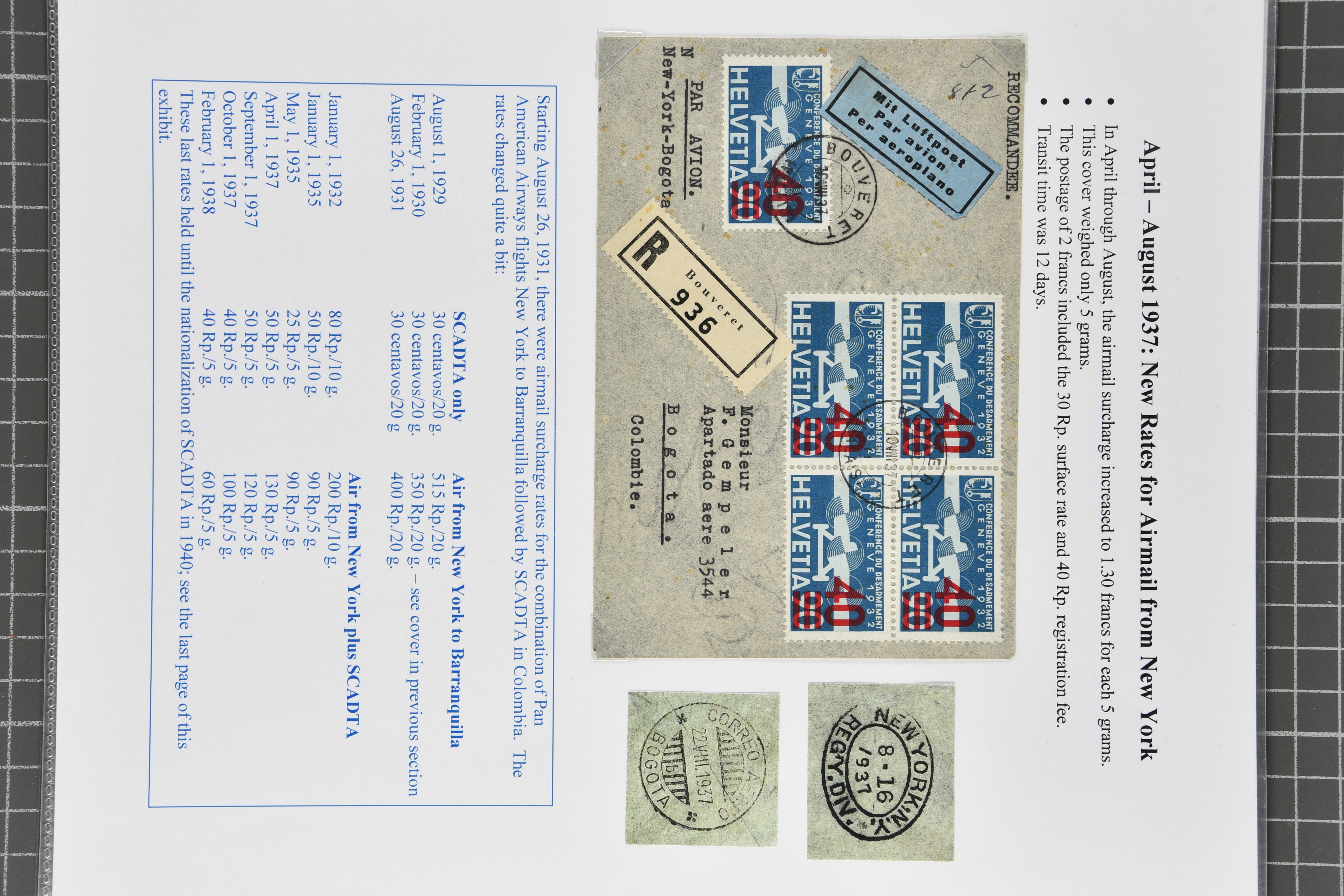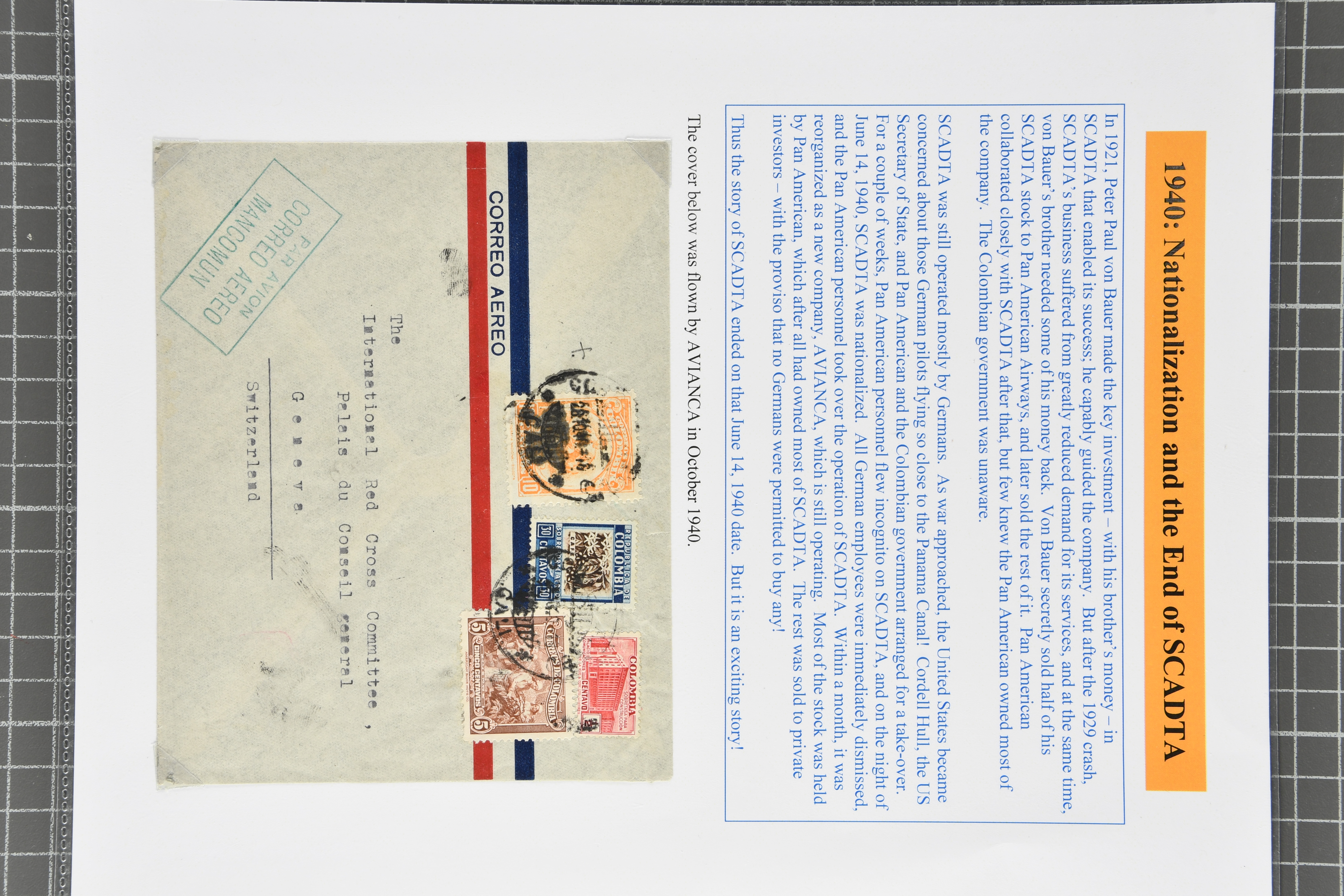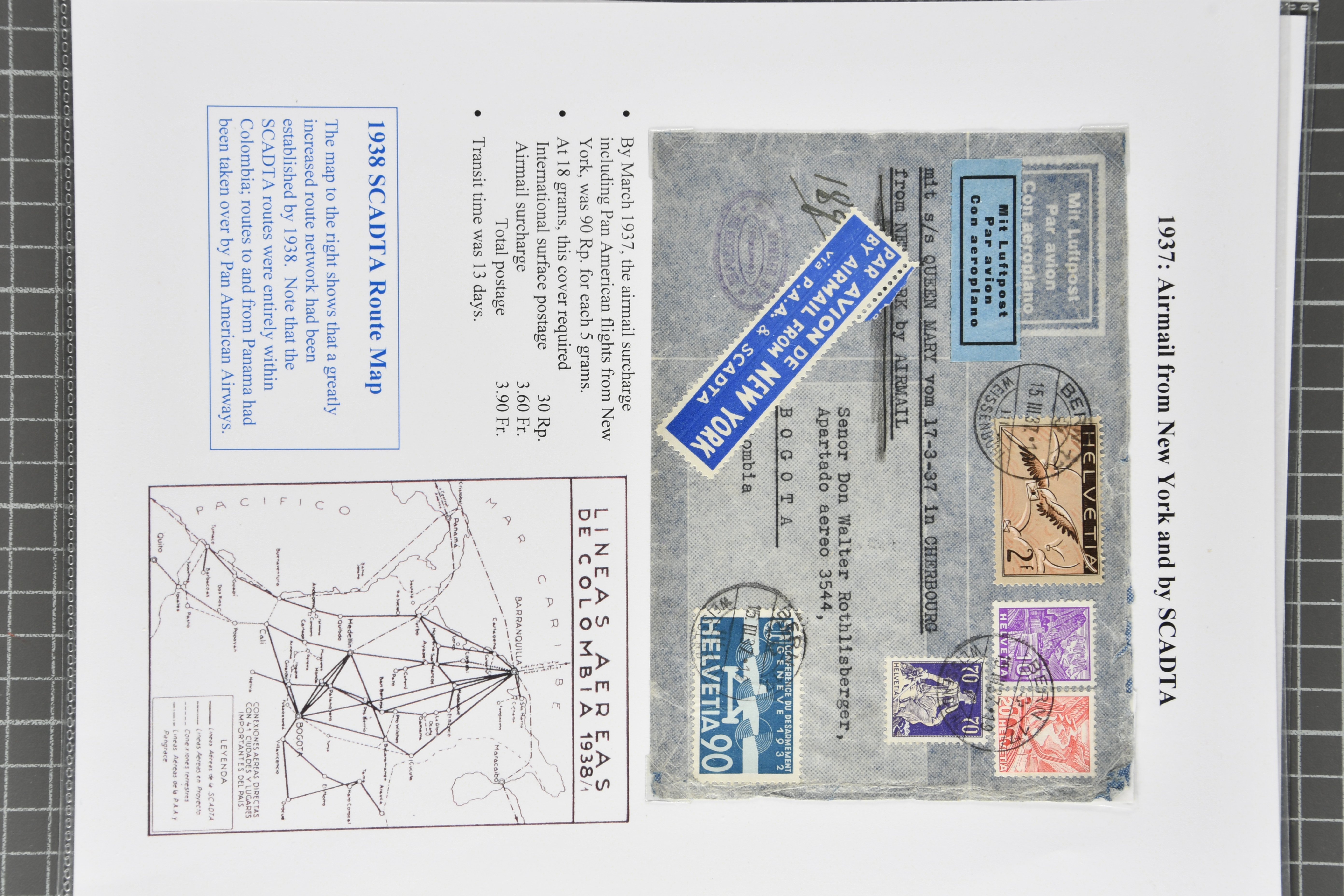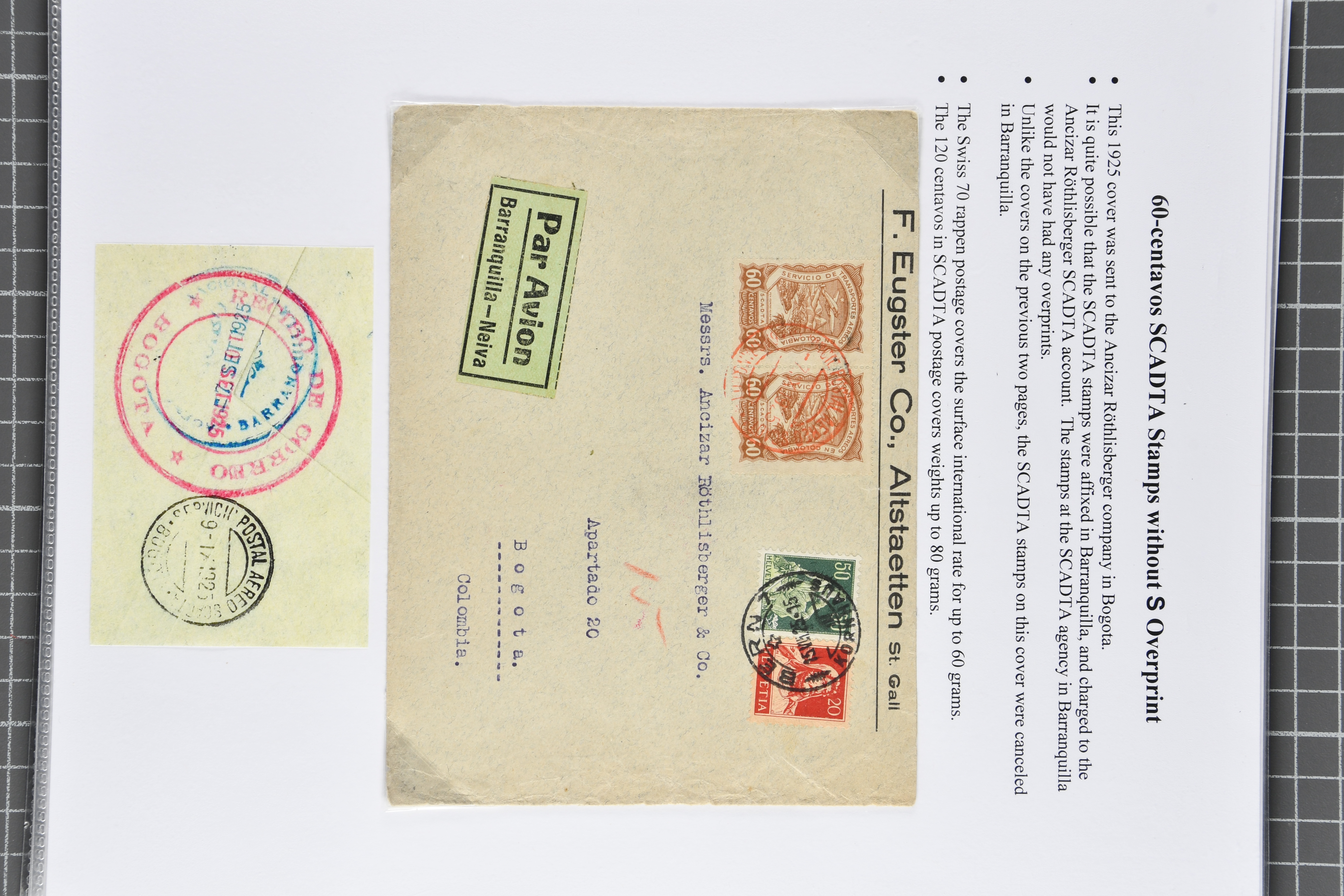 Scadta Zusatzfrankatur von St. Gallen (20.12.32) aus der späteren Zeit als keine Scadtamarken mehr erforderlich waren, drei Belege 1934/37 via New York und 'P.A.A. & SCADTA' nach Kolumbien sowie ein AVIANCA Brief von Cali (28.10.40) 'PER AVION