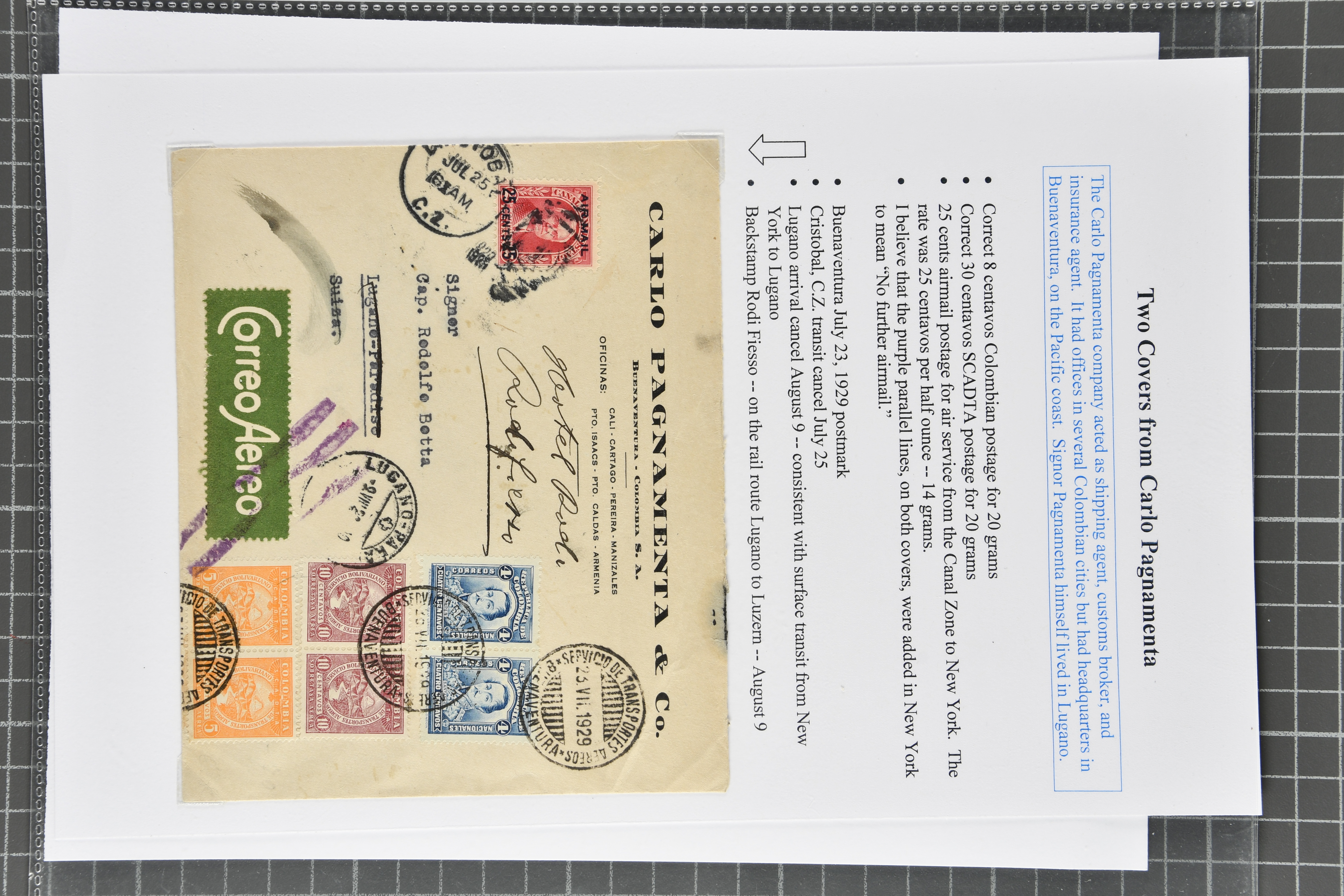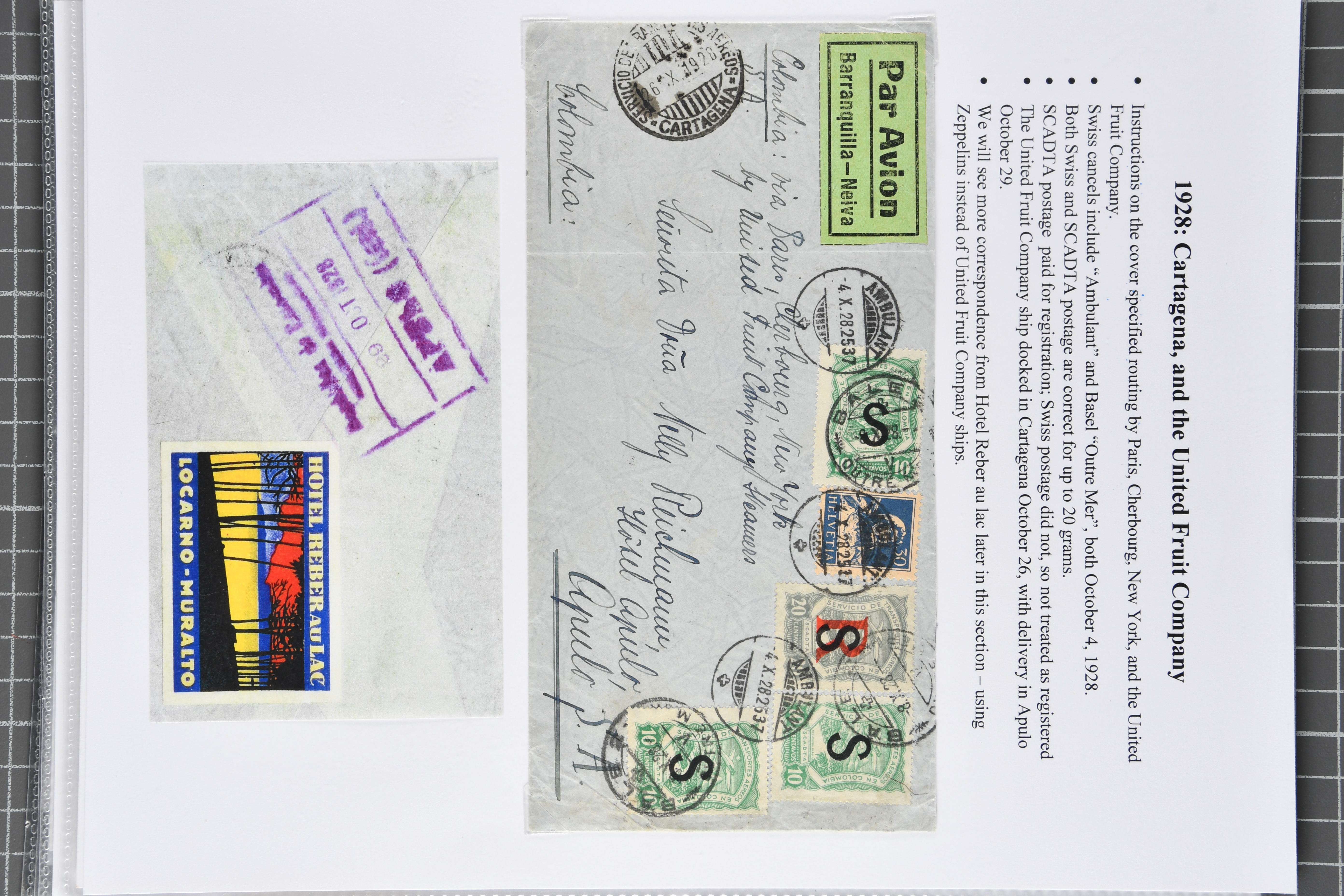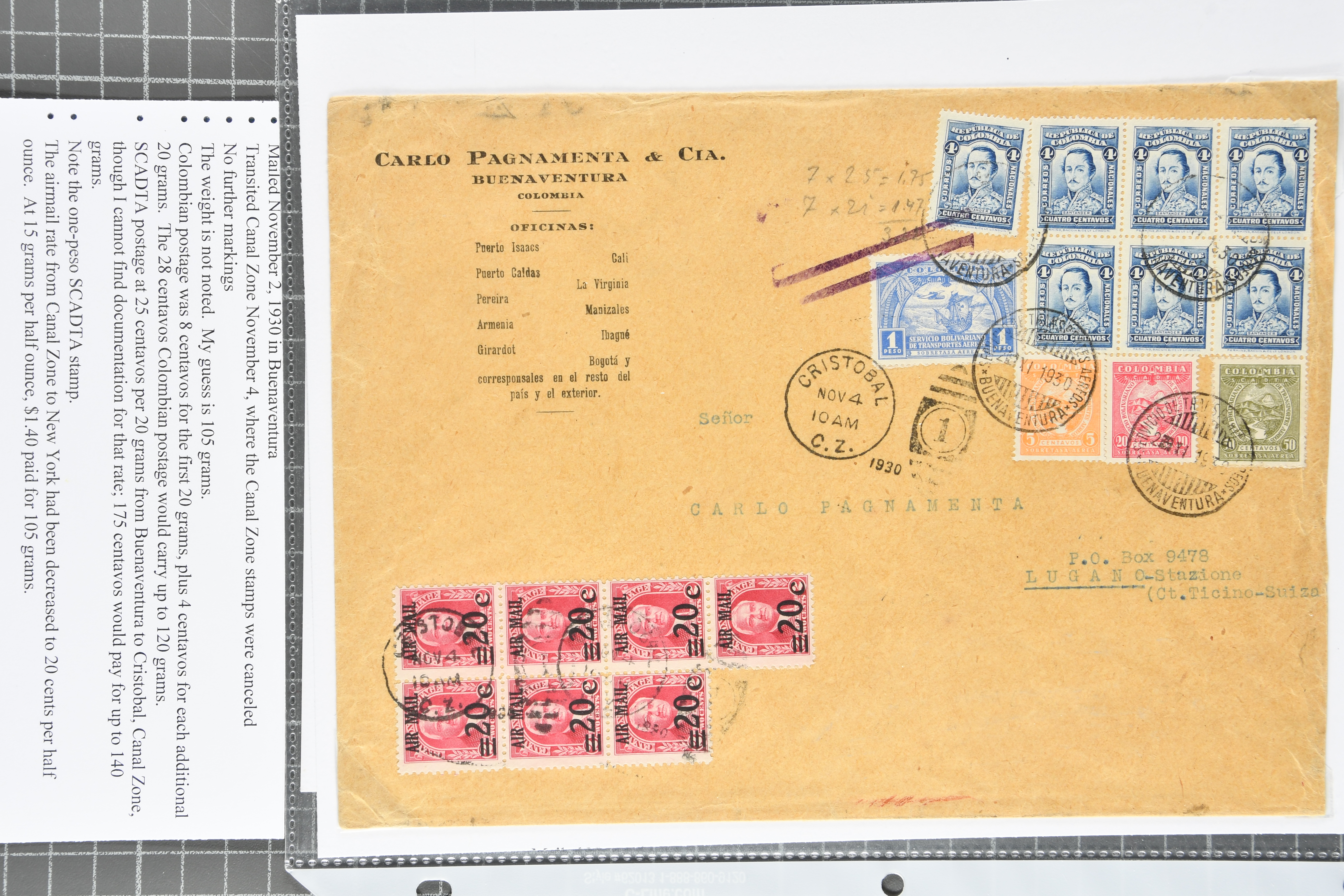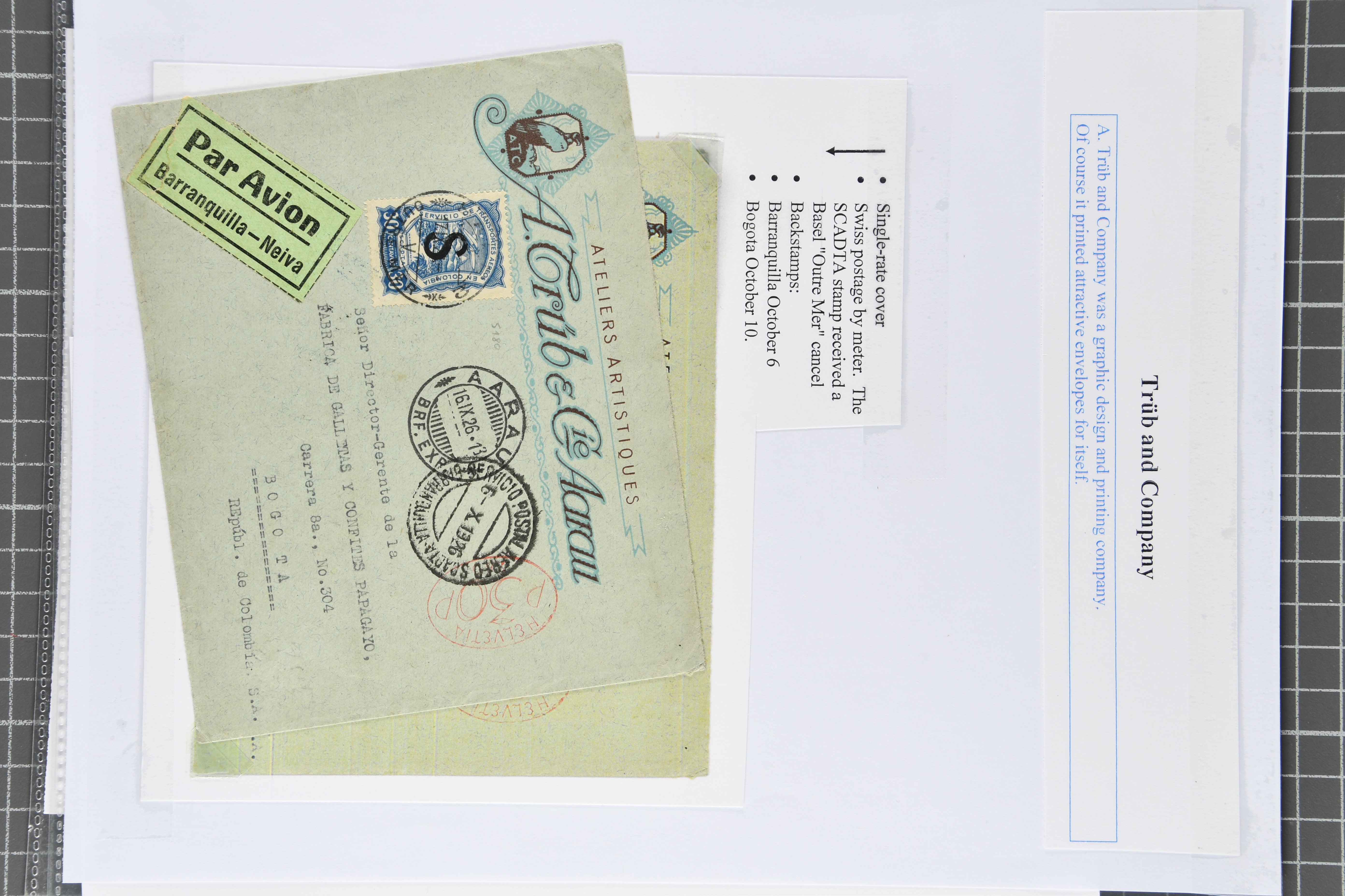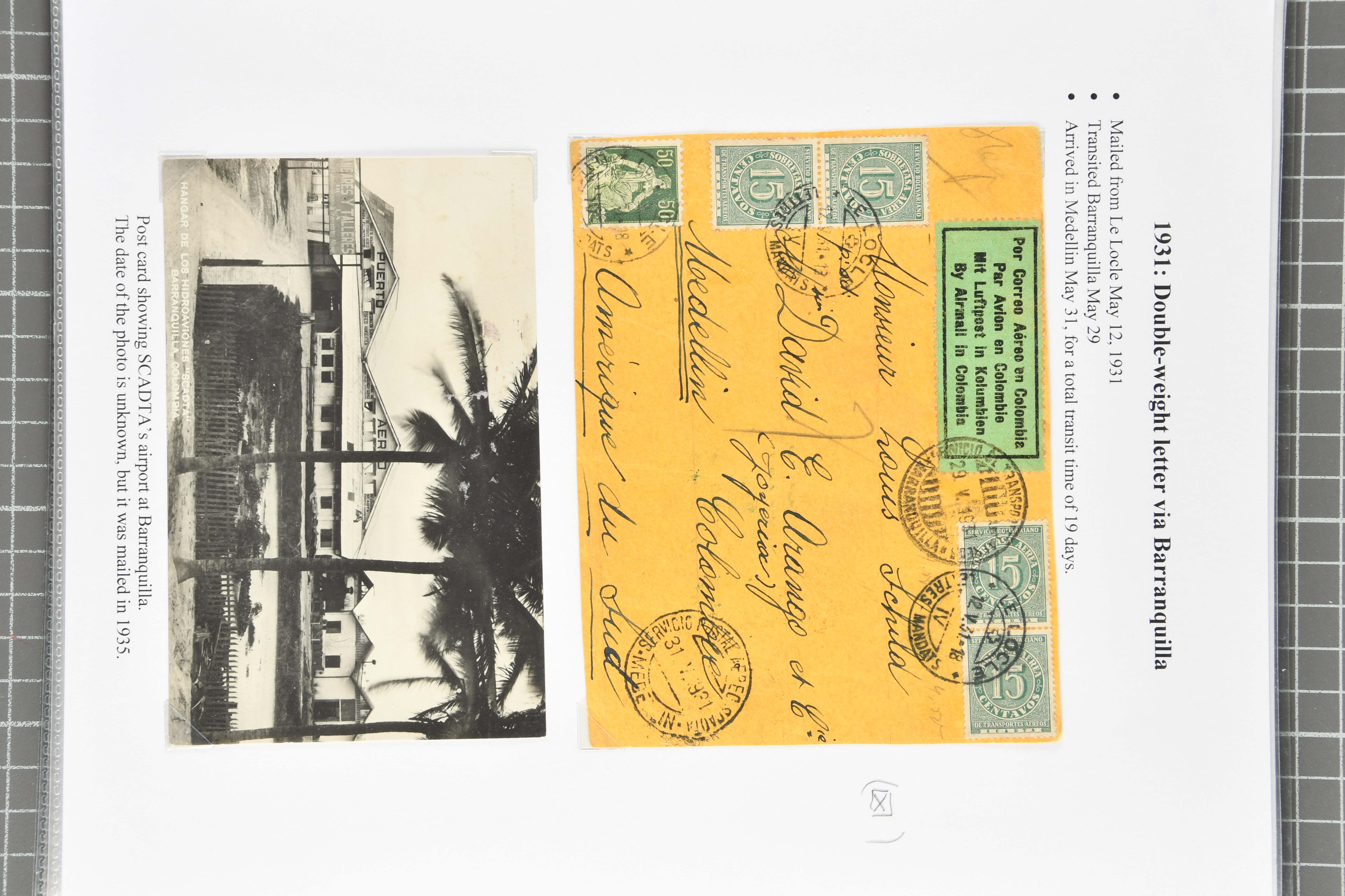 Scadta Zusatzfrankatur von St. Gallen (20.12.32) aus der späteren Zeit als keine Scadtamarken mehr erforderlich waren, drei Belege 1934/37 via New York und 'P.A.A. & SCADTA' nach Kolumbien sowie ein AVIANCA Brief von Cali (28.10.40) 'PER AVION