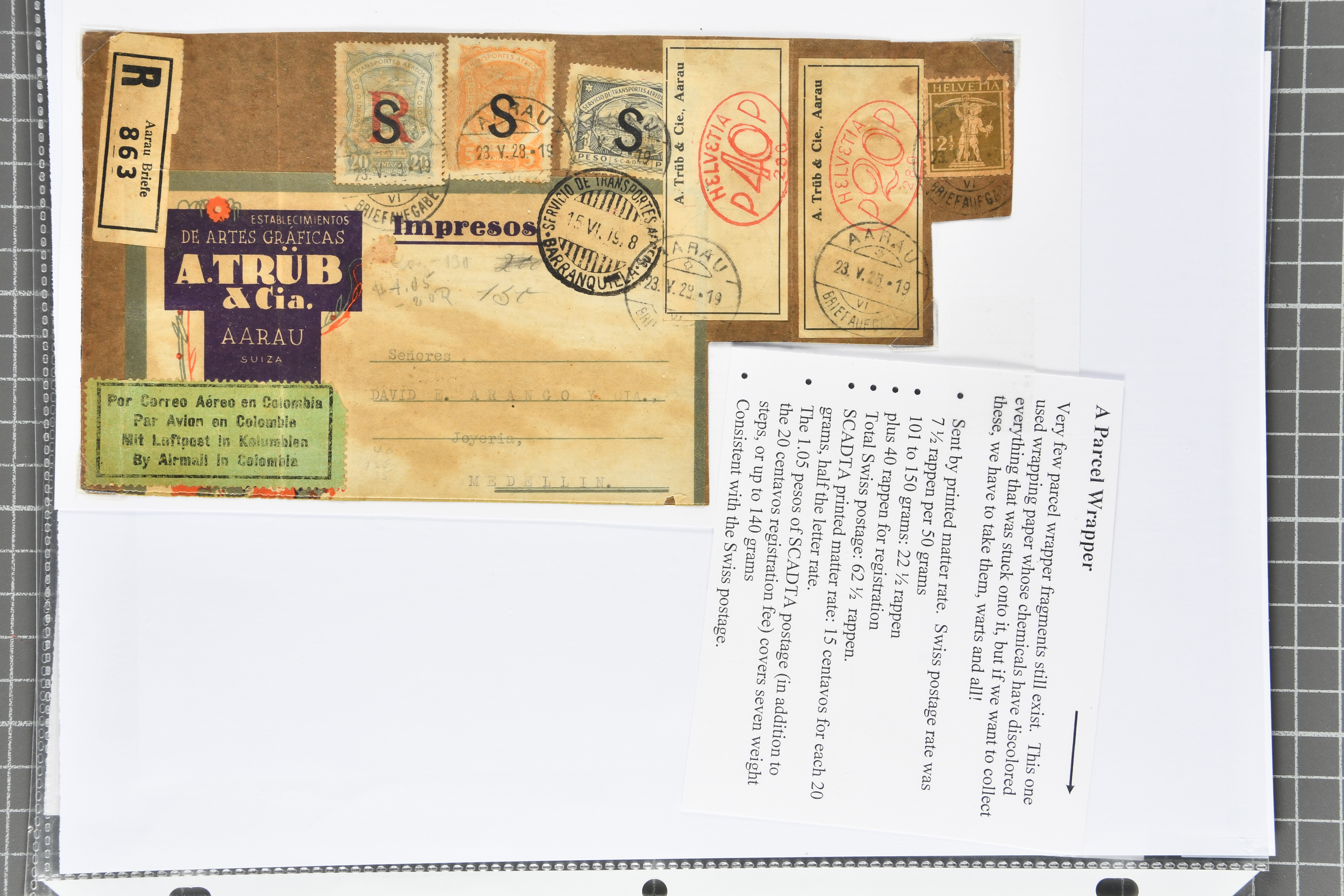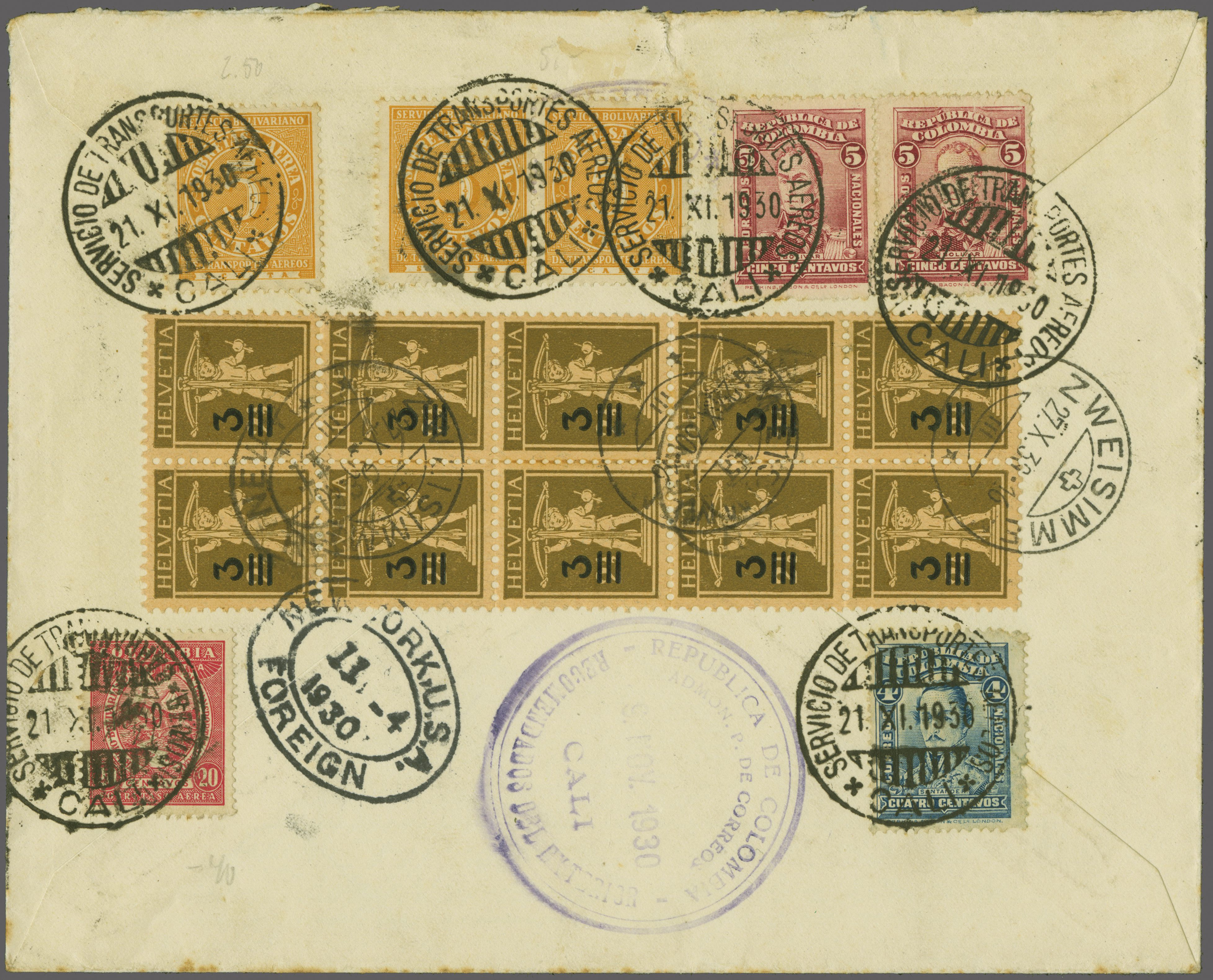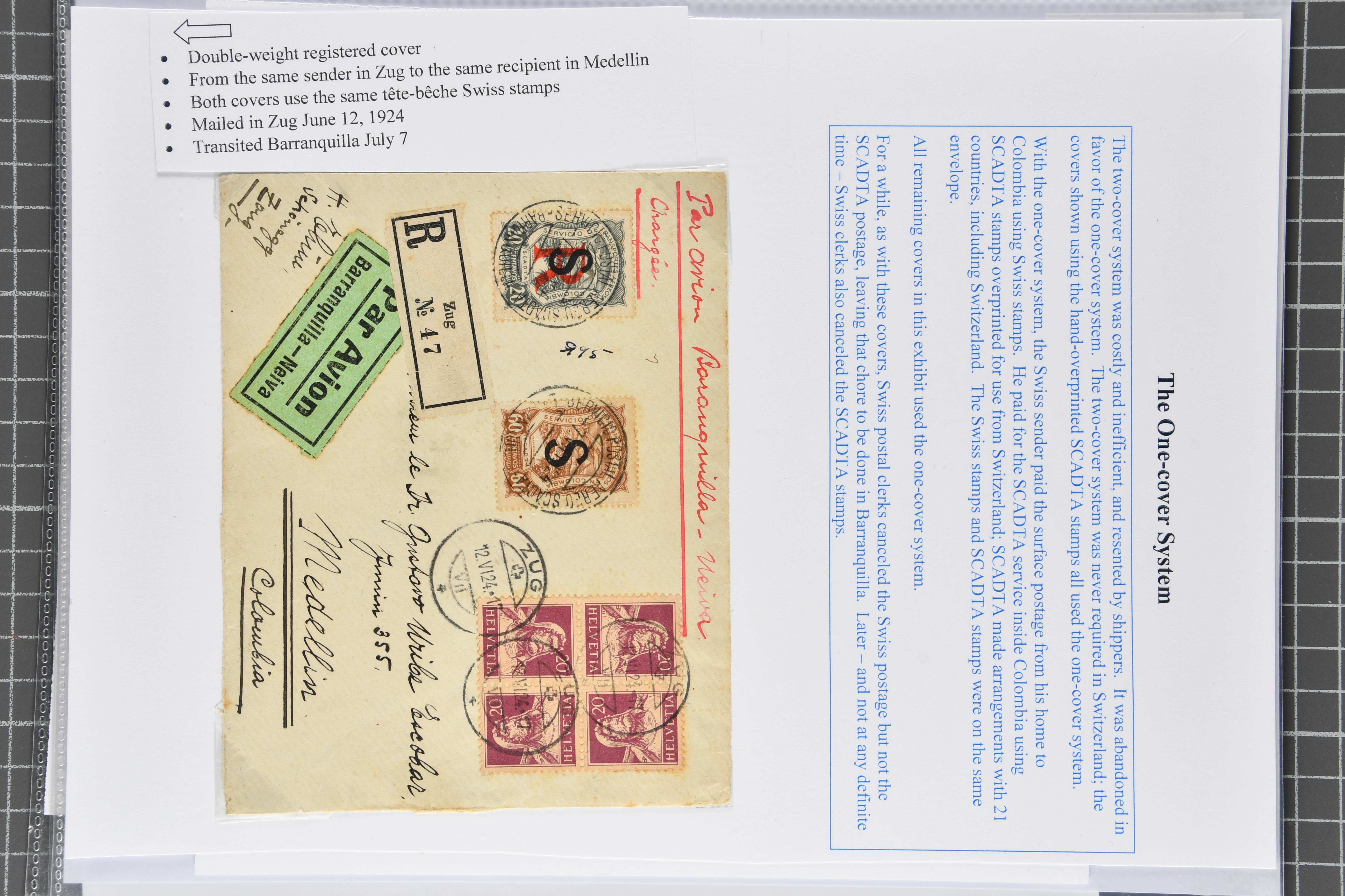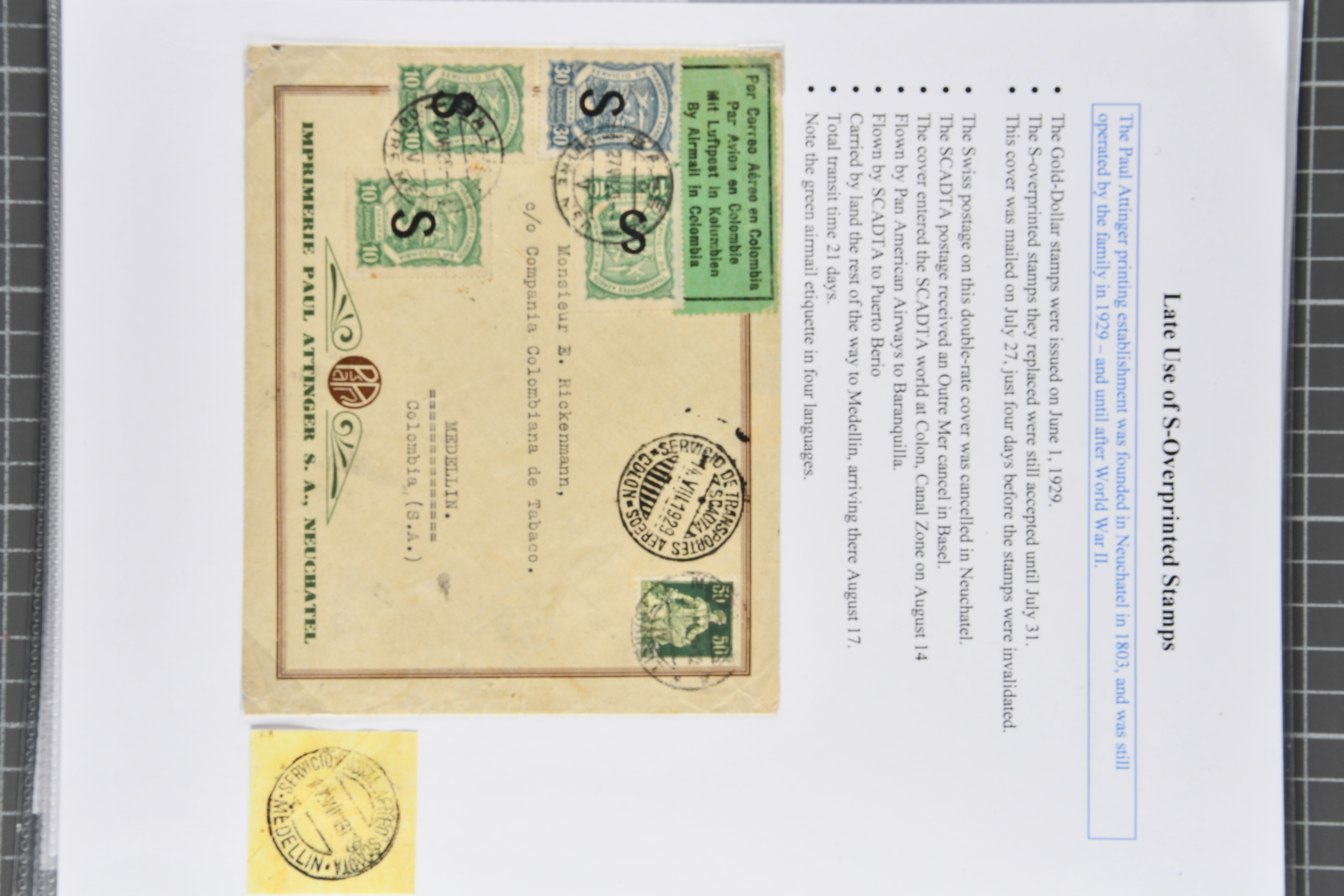 Scadta Zusatzfrankatur von St. Gallen (20.12.32) aus der späteren Zeit als keine Scadtamarken mehr erforderlich waren, drei Belege 1934/37 via New York und 'P.A.A. & SCADTA' nach Kolumbien sowie ein AVIANCA Brief von Cali (28.10.40) 'PER AVION