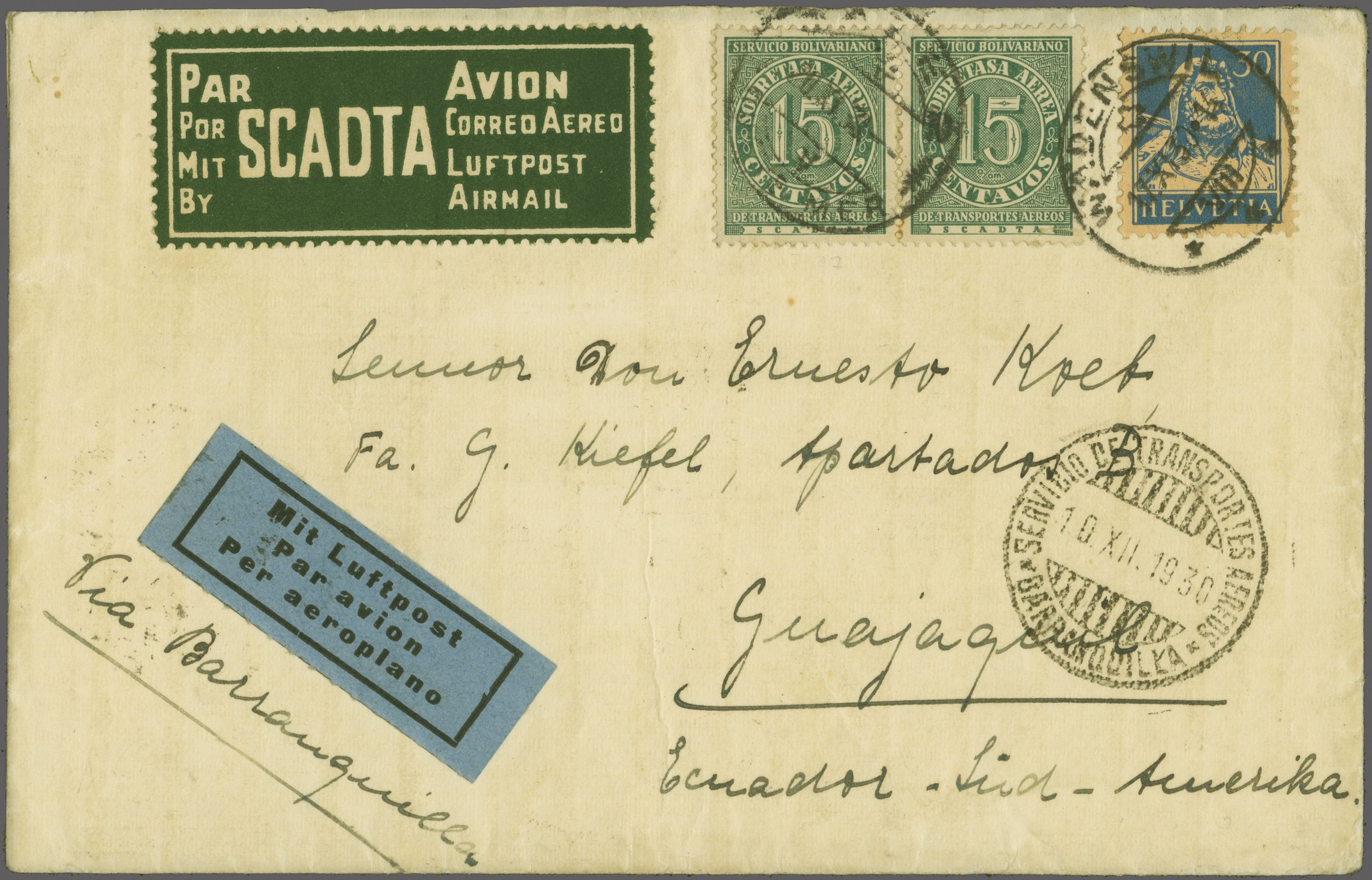 Scadta Konsularpost nach Ecuador 1930 (17. Nov.): Brief frankiert mit Golddollar 15 c. im waagr. Paar zusammen mit Tellbrustschild 30 Rp. blau gest. "Basel 17.XI.31.14" nach Guayaquil, Ecuador, mit SCADTA Barranquilla