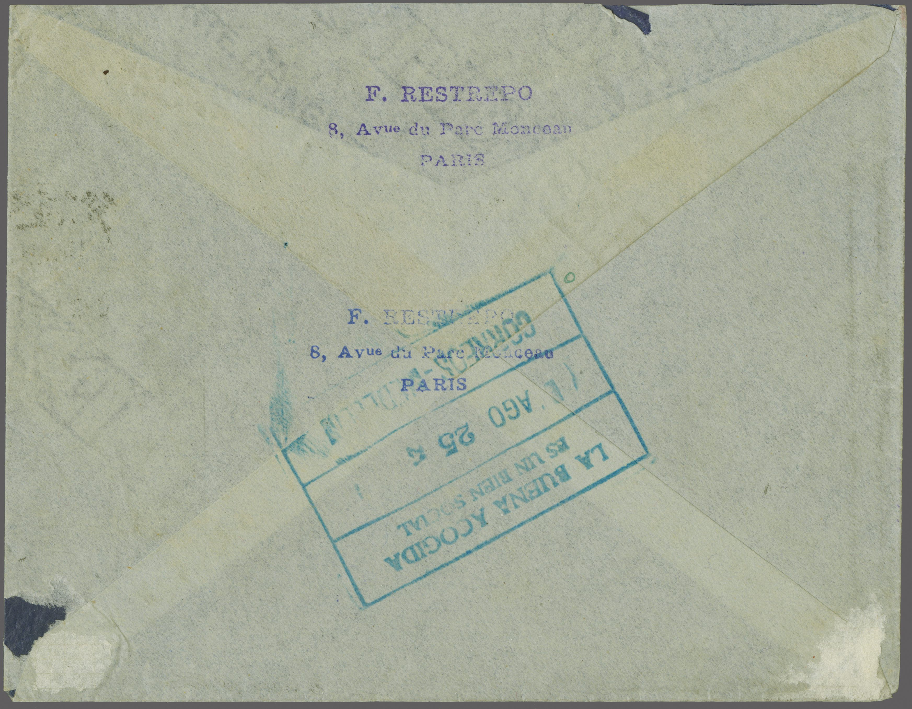 von Medellin am 24. August. Umschlagrückseite mit leichten Haftungsspuren ehem. Montierung auf Albumblatt, vorderseitig in tadelloser und frischer Erhaltung. Eine sehr seltene Golddollar Frankatur mit Scadta 25 c., gem. dem Sammler nur zwei Belege