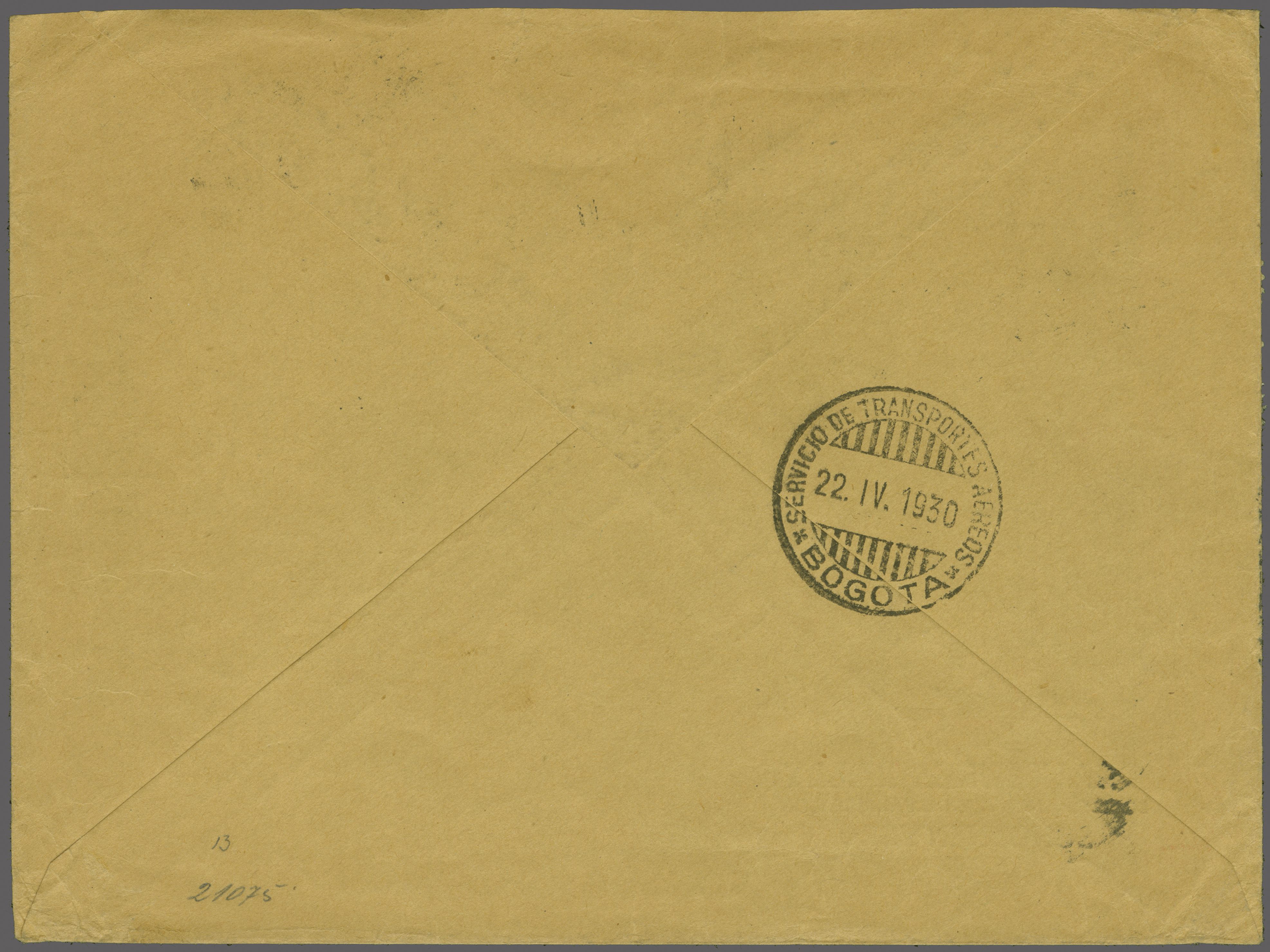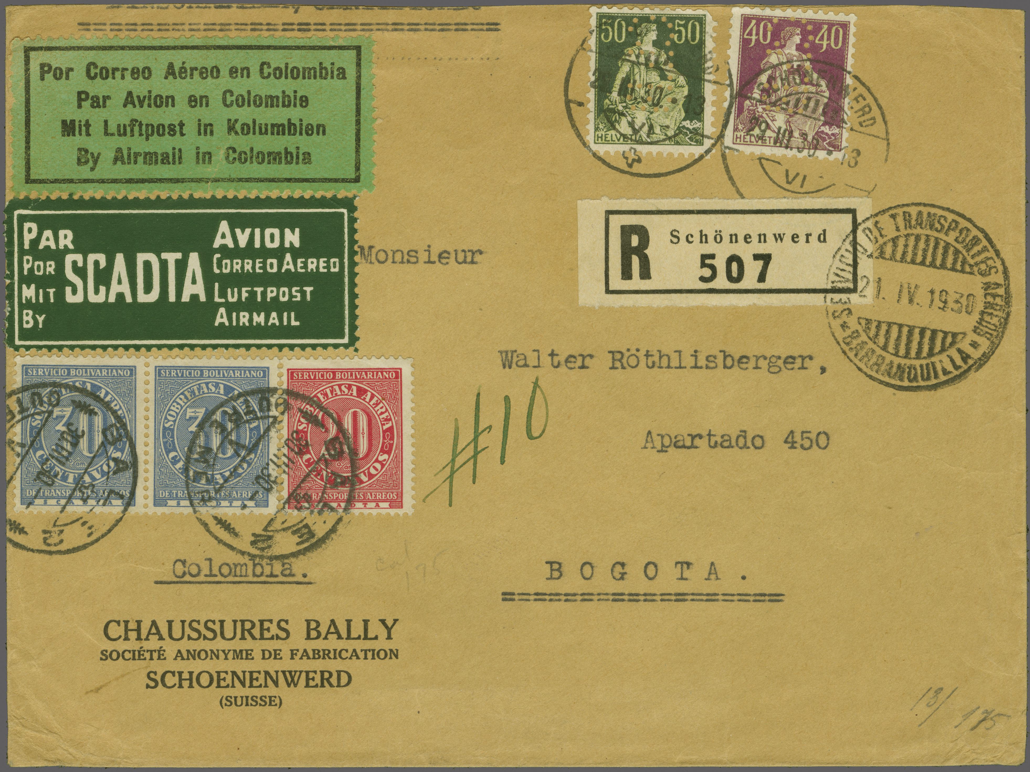 30.III.30" nach Bogotà mit vorders. Transitstp. "Barranquilla 21.IV.1930" und rücks. AStp. "BOGOTA 22.IV.1930". Brief an Oberkante leicht reduziert, Frankatur nicht beeinträchtigt. Seltener Frimenbrief mit Perfinmarken. SLH = CHF 3'000 (Image 1)