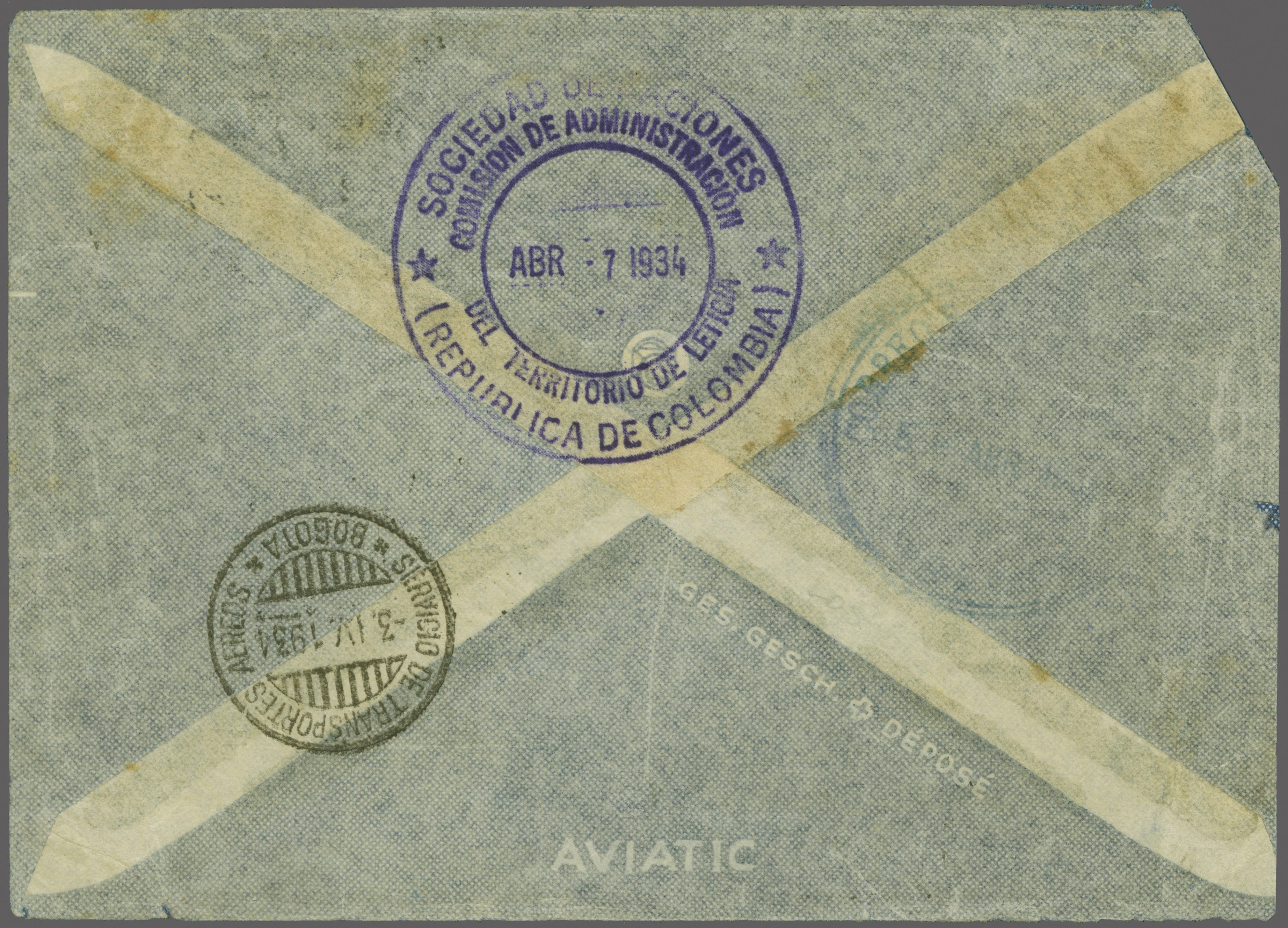 Amazones mit rücks. amtl. Stp. "SOCIEDAD DE NACIONES / COMISION DE ADMINISTRACION DEL TERRITORIO DE LETICIA (REPUBLICA DE COLOMBIA) ABR.7 1934". Linke obere Ecke vom Umschlag fehlend. Insgesamt gibt es sieben Belege adressiert an das Büro in Leticia,