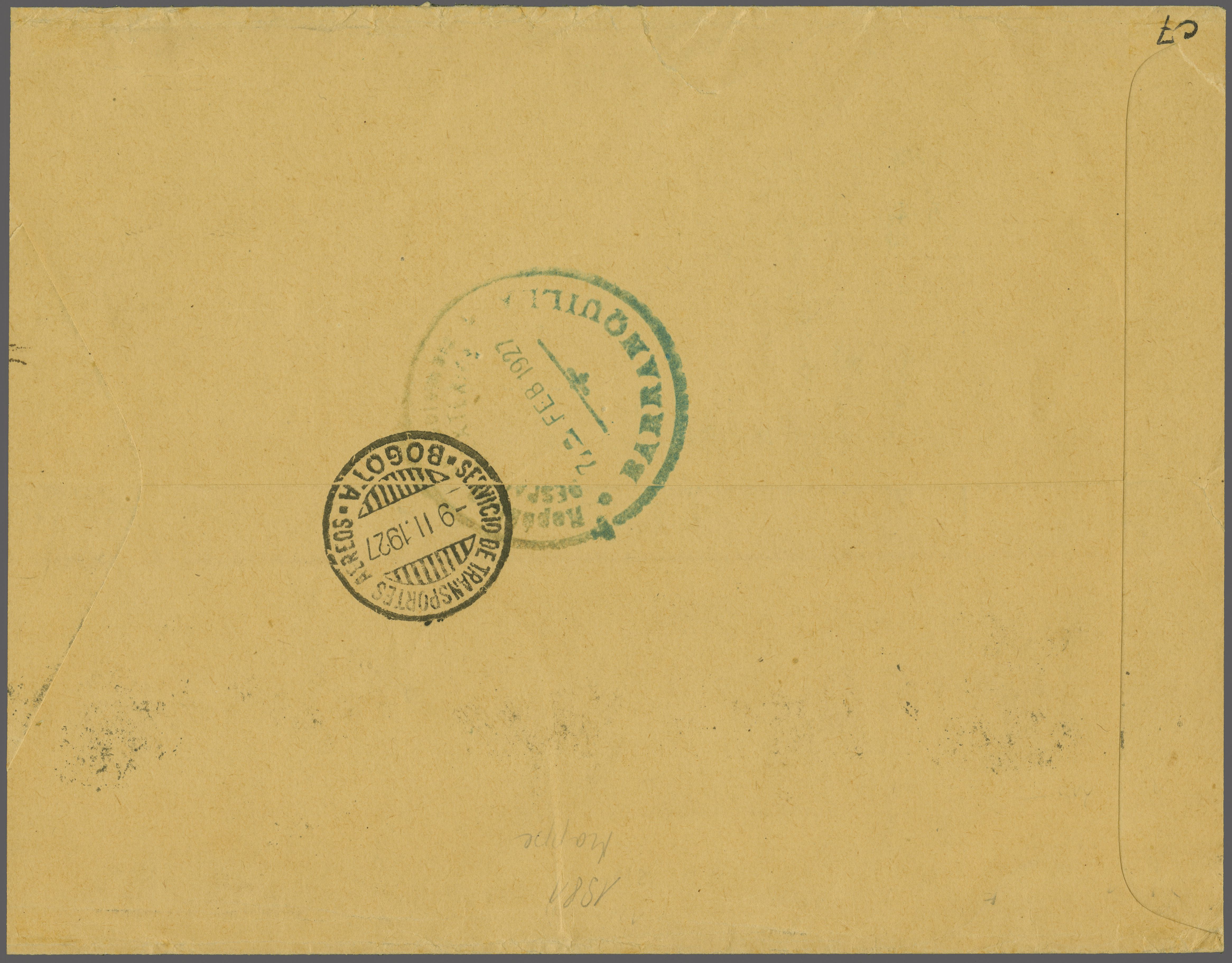 "BARRANQUILLA -7.II.1927" und rücks. AStp. "Bogotà -9.II.1927". En frischer und attraktiver Sammlerbrief an Otto Kemmler mit hoher Peso-Frankatur. Attest Bohler (1982) SLH = CHF 15'000 für Briefe mit mehreren Peso-Marken (Image 1)