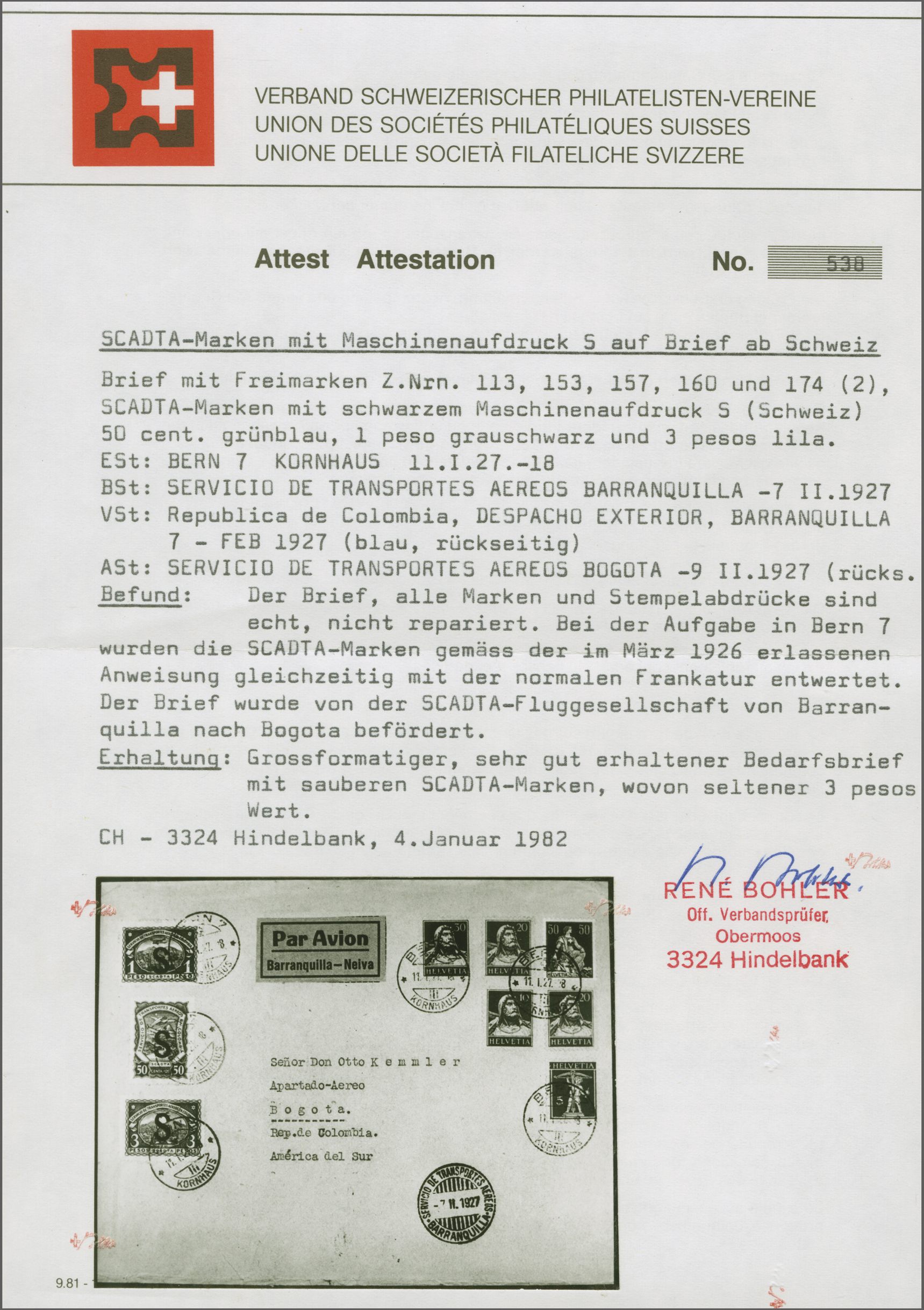 Scadta Konsularpost 1924/29: Ensemble von neun interessanten Scadta Belegen, dabei Brief ab "Bern Kornhaus 15.VIII.25" frankiert mit 70 Rp. plus Scadta 60 c. braun ohne Maschinenaufdruck im waagr. Paar nach