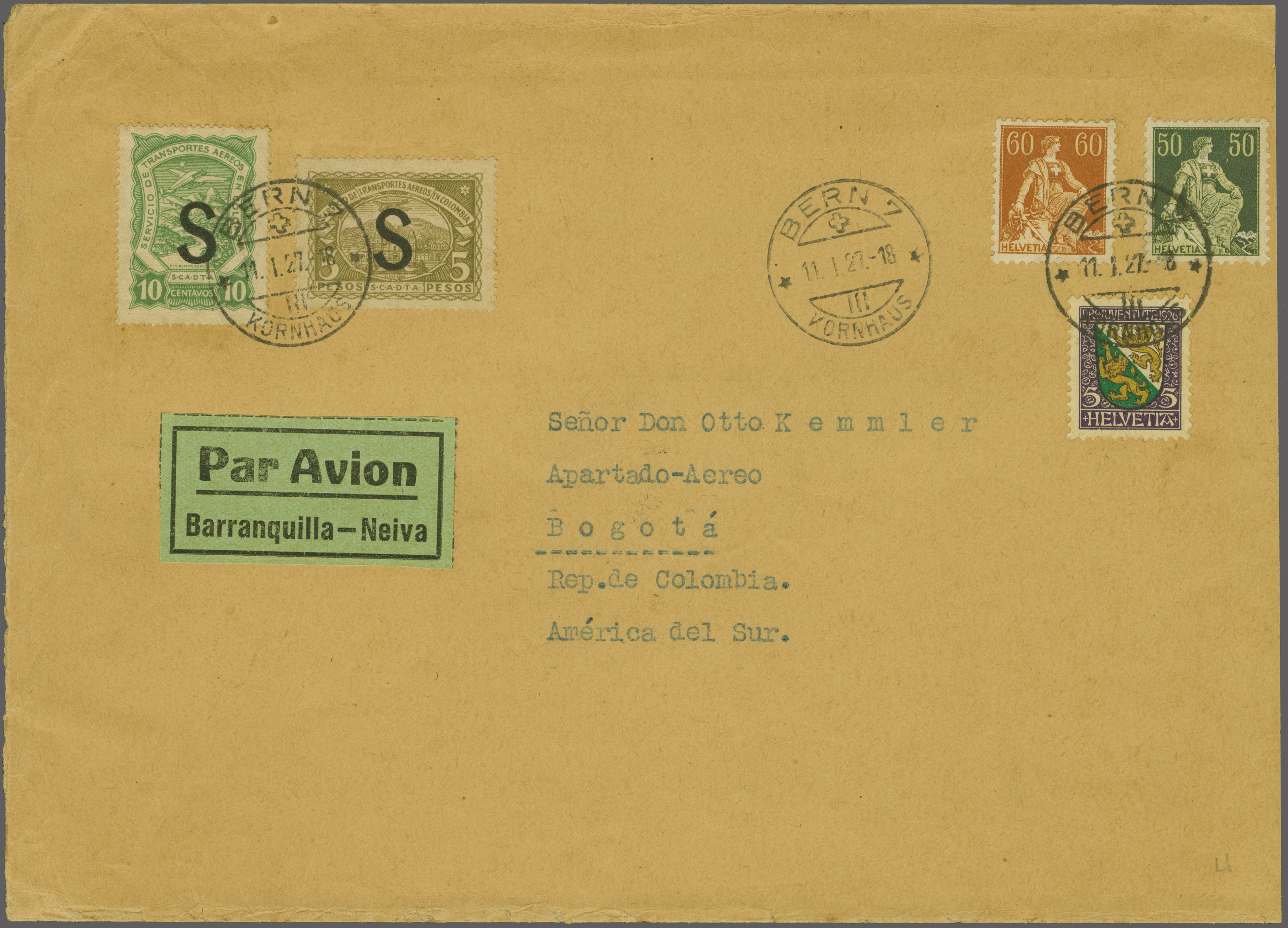 Scadta Konsularpost 1927 (11. Januar): Maschinenaufdruck 'S' auf 10 c gelbgrün und 5 p. olivgrün mit Schweizer Zusatzfrankatur Fr. 1.15, alle sauber gest. " BERN 7 Kornhaus 11.1.27" mit rücks. Transitstp. "BARRANQUILLA