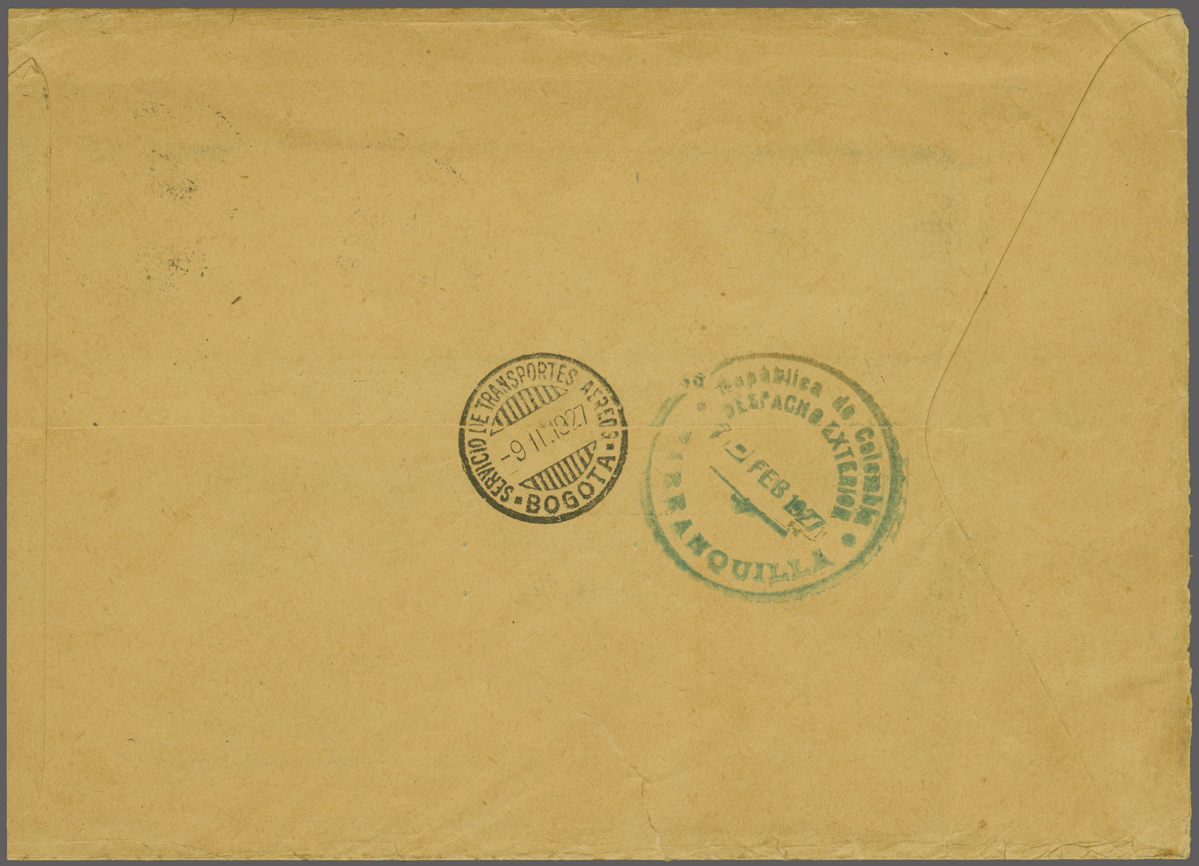 -1.Feb.1927" sowie. AStp. "Bogotà -9.II.1927". En frischer und attraktiver Sammlerbrief an Otto Kemmler frankiert mit Höchstwert zu 5 Peso SLH = CHF 11'000 (Image 1)