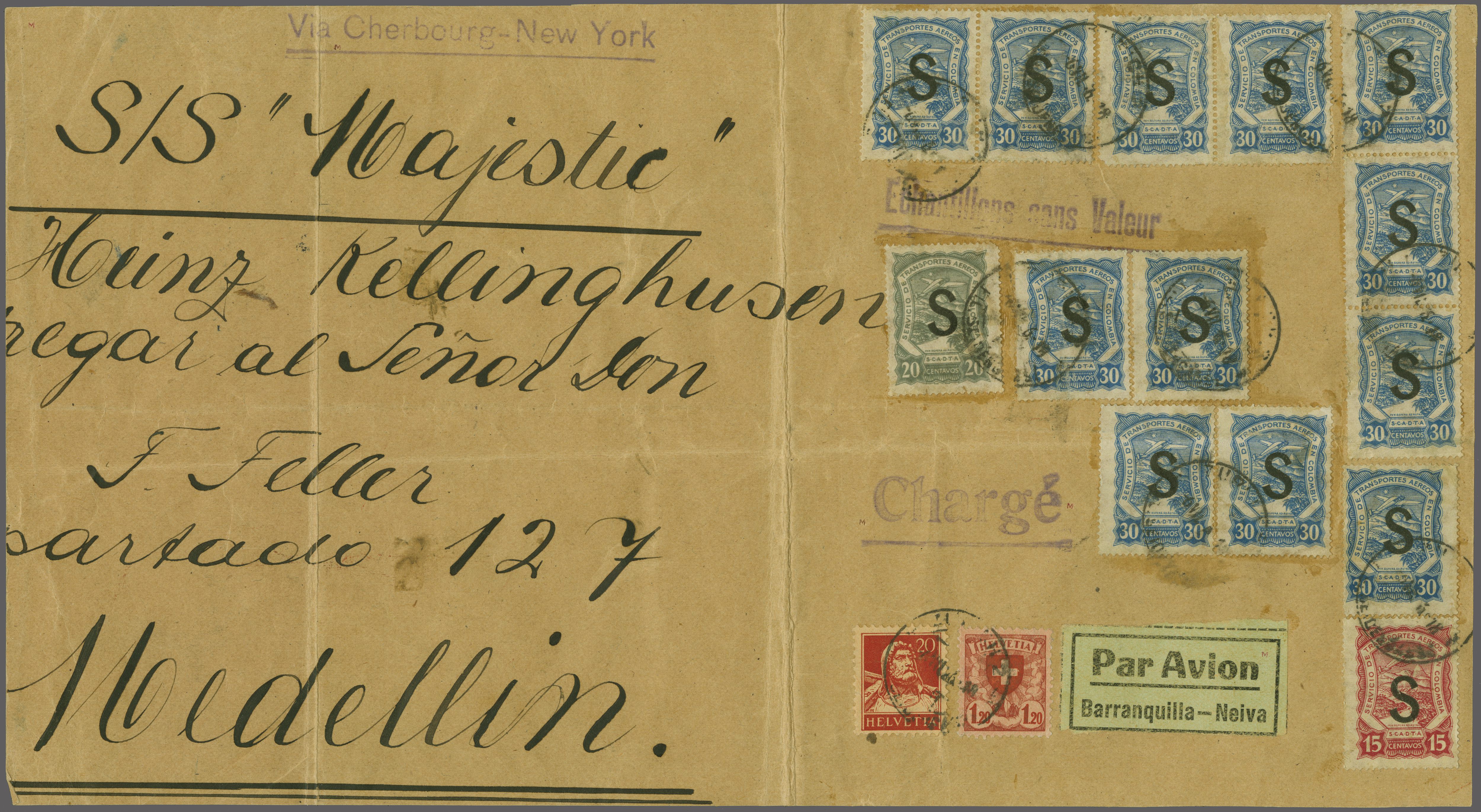 Zürich nach Medellin, deklariert als 'Echantillons sans Valeur' (Warenmuster), eingeschrieben mit Leitstp. 'Via Cherbourg-New York' und handschriftl. Vermerk S/S "Majestic". Eine seltene Frankatur für eine Warenmustersendung zu insgesamt 3 p. 95 c.