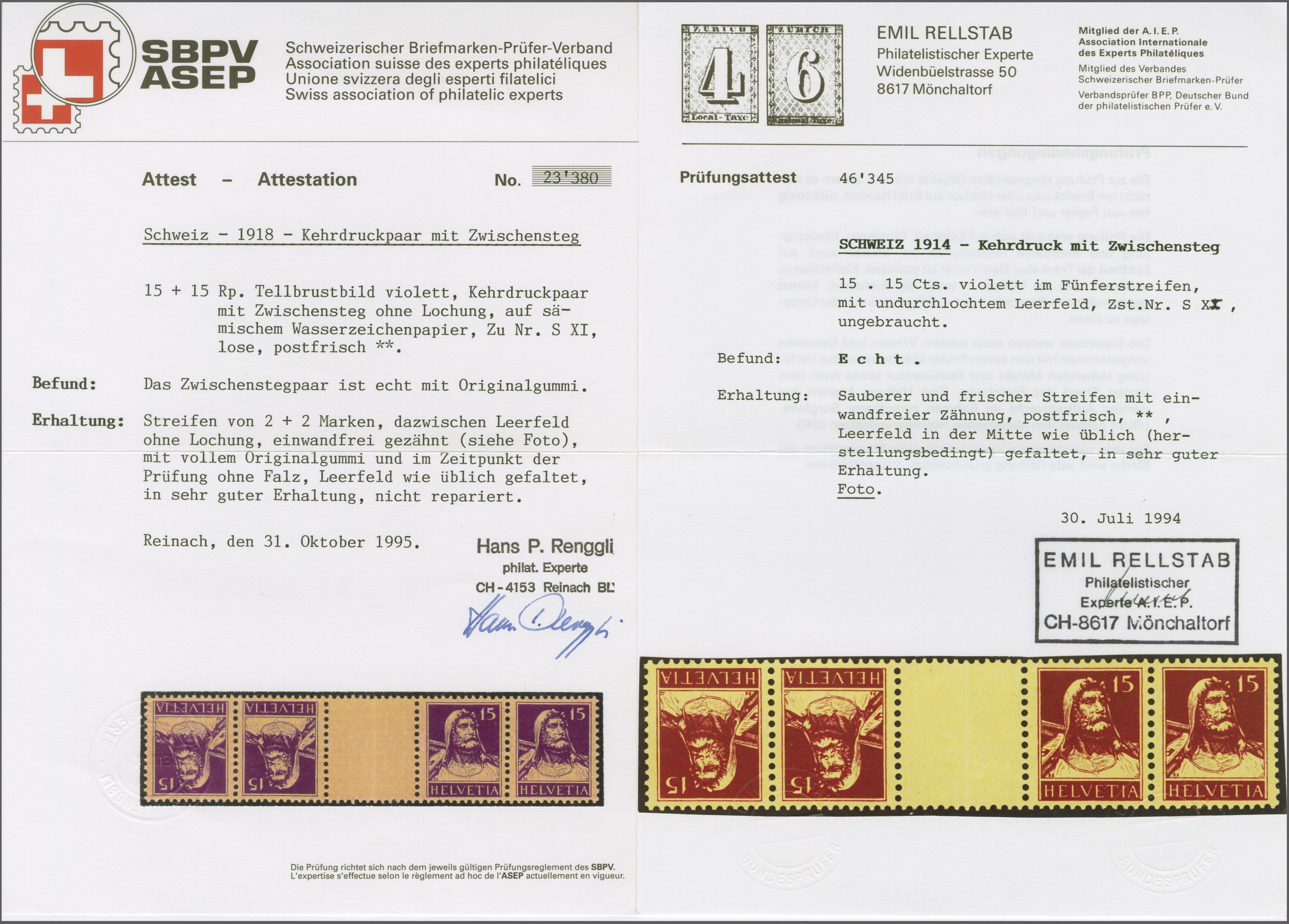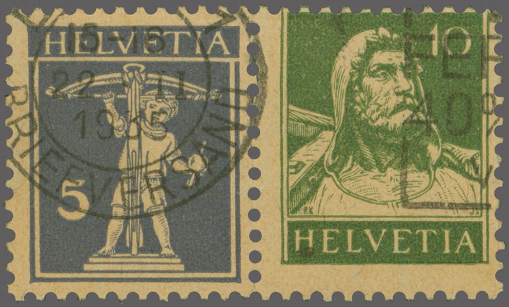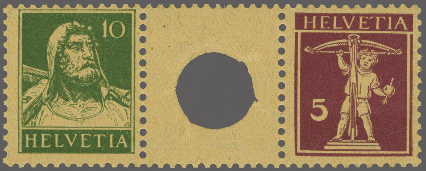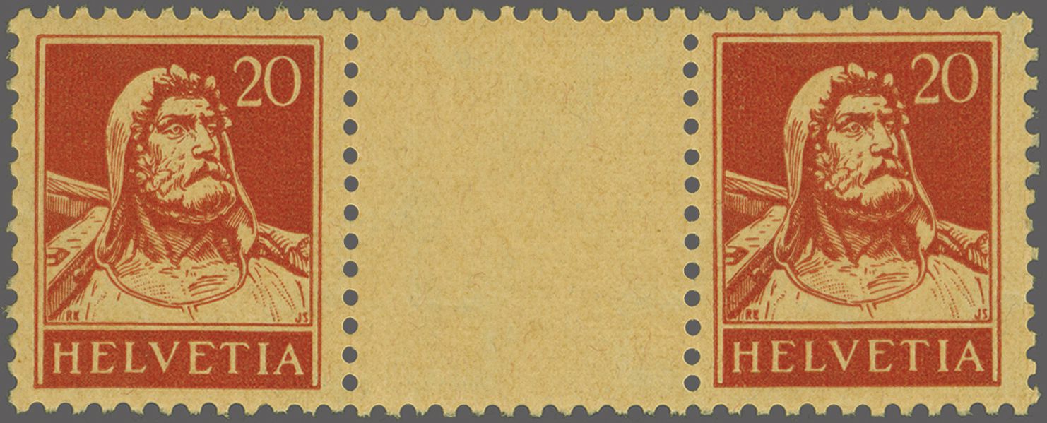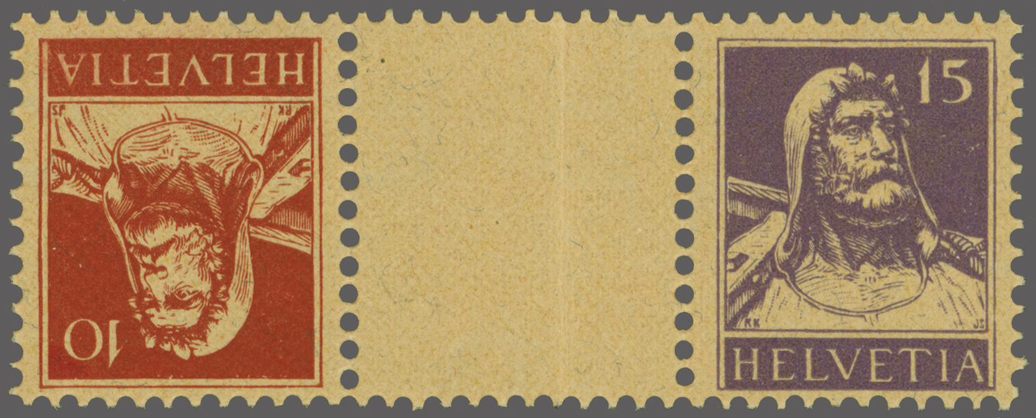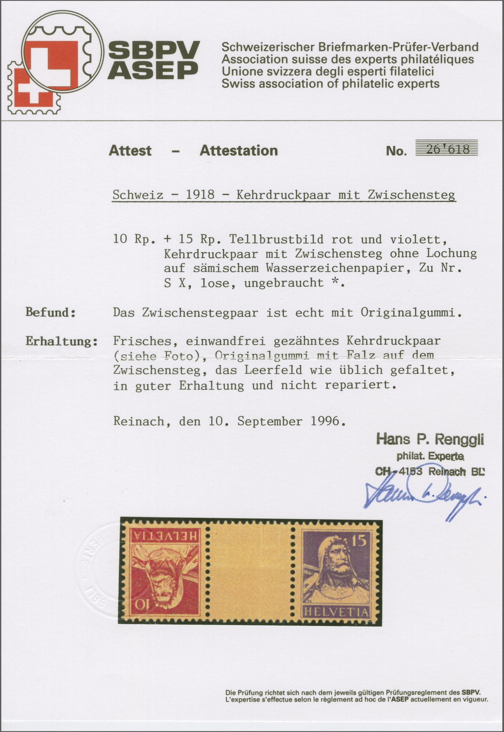 1914: Tellbrustbild 10 Rp. rot und 15 Rp. violett im Kehrdruckpaar mit Zwischensteg ohne Lochung, gut gez., übliche herstellungsbedingte Faltspur im Zwischensteg, ungebr. und in guter Erhaltung. Atteste Renggli (1996) und