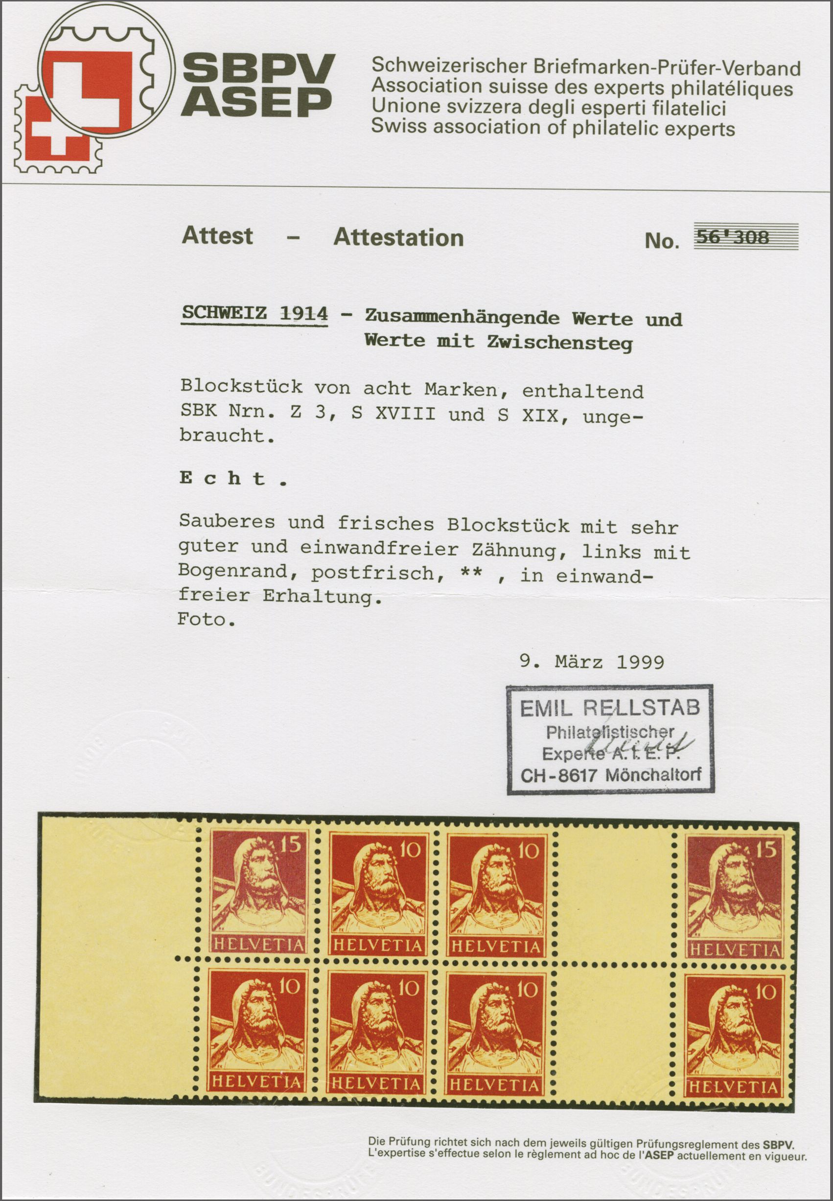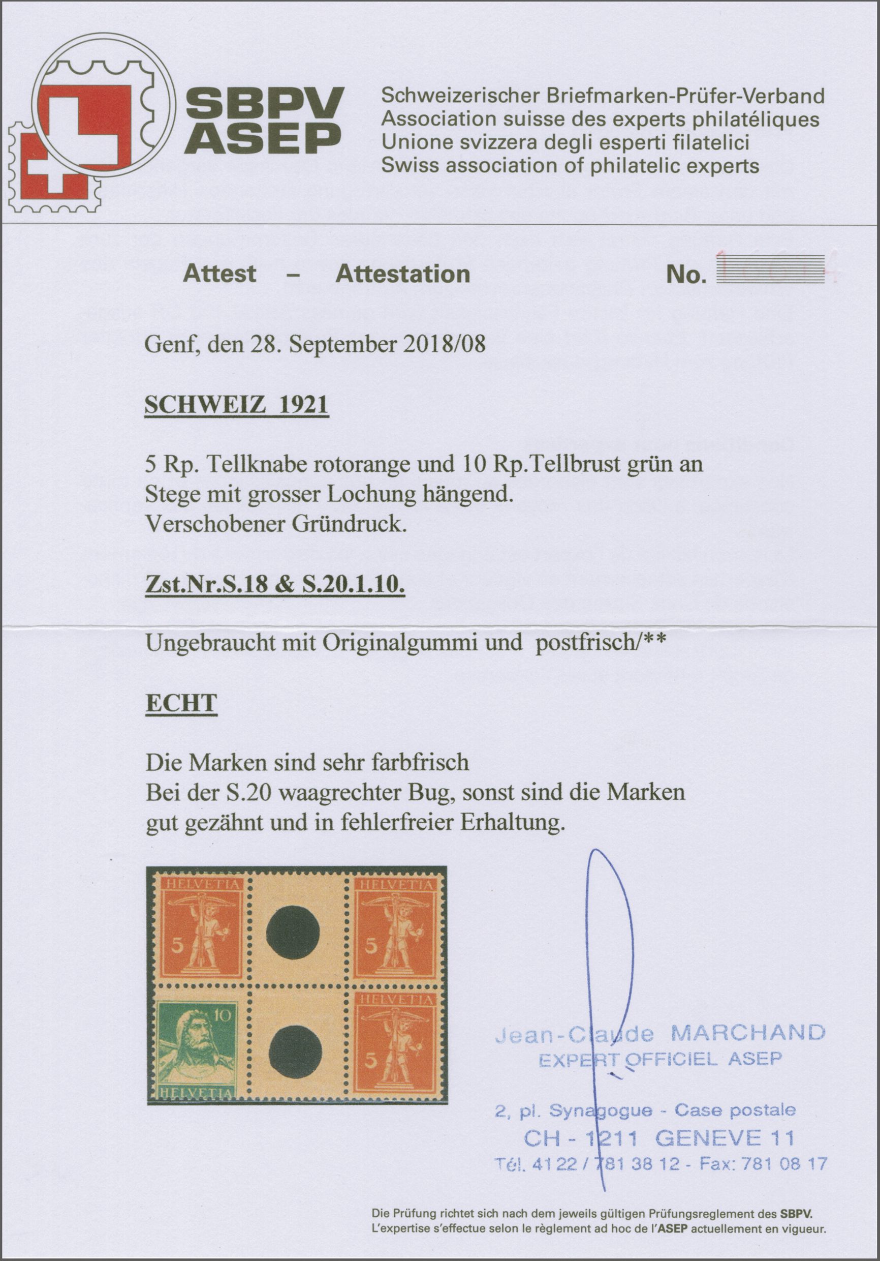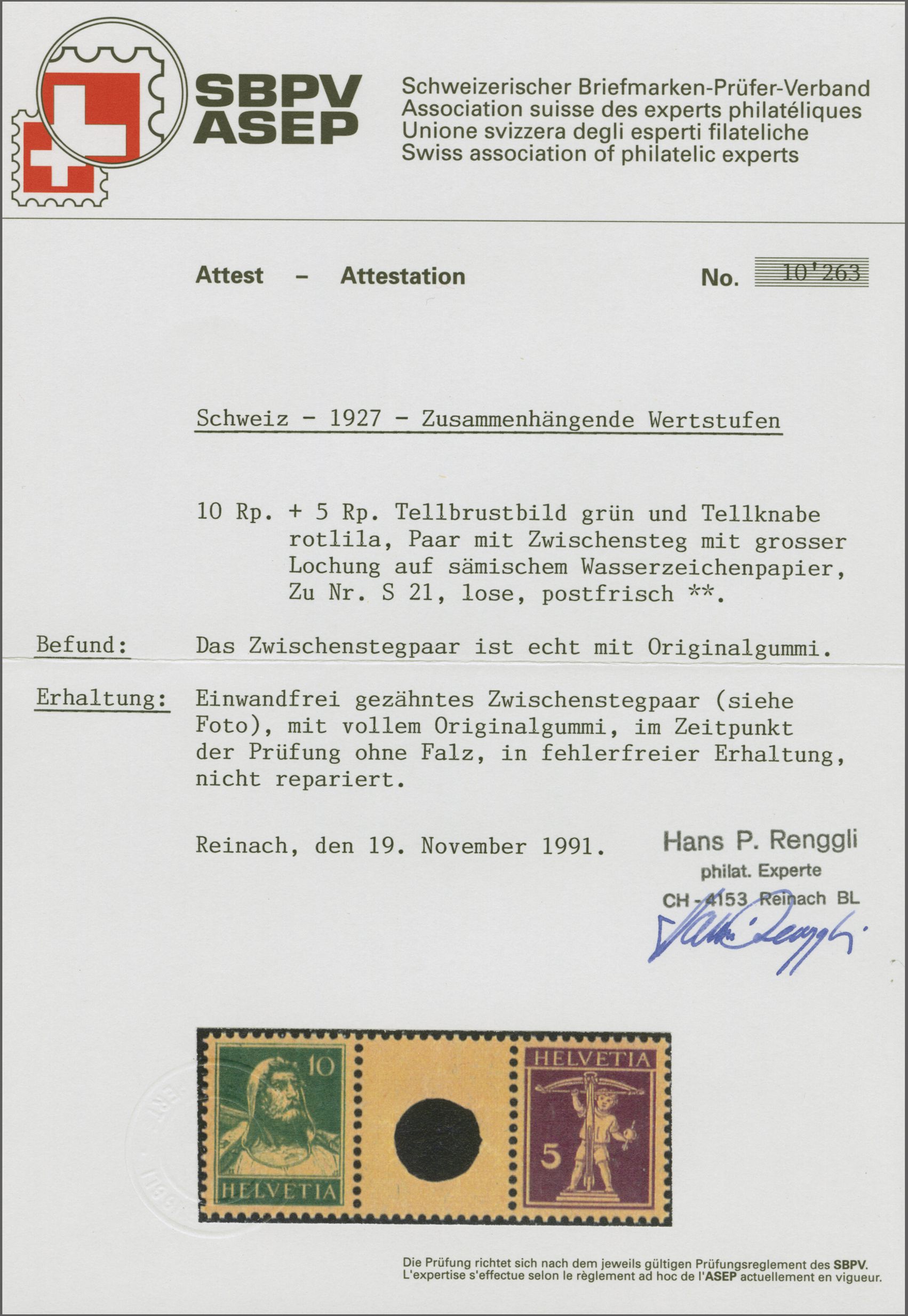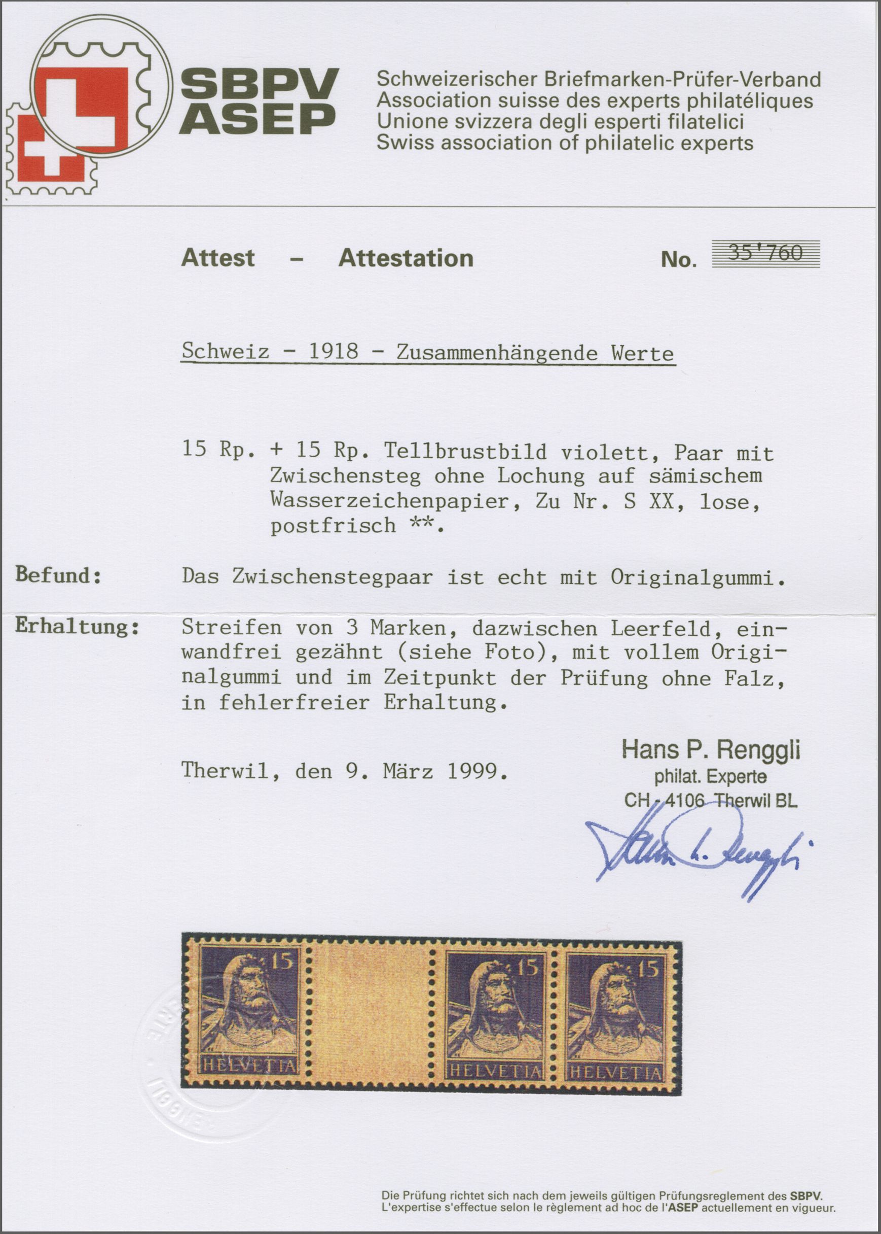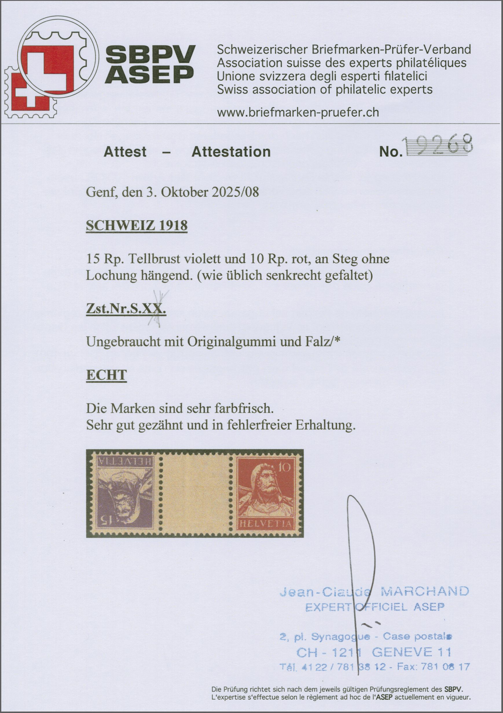 1914: Tellbrustbild 10 Rp. rot und 15 Rp. violett im Kehrdruckpaar mit Zwischensteg ohne Lochung, gut gez., übliche herstellungsbedingte Faltspur im Zwischensteg, ungebr. und in guter Erhaltung. Atteste Renggli (1996) und