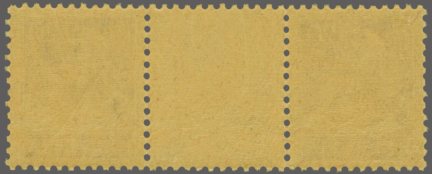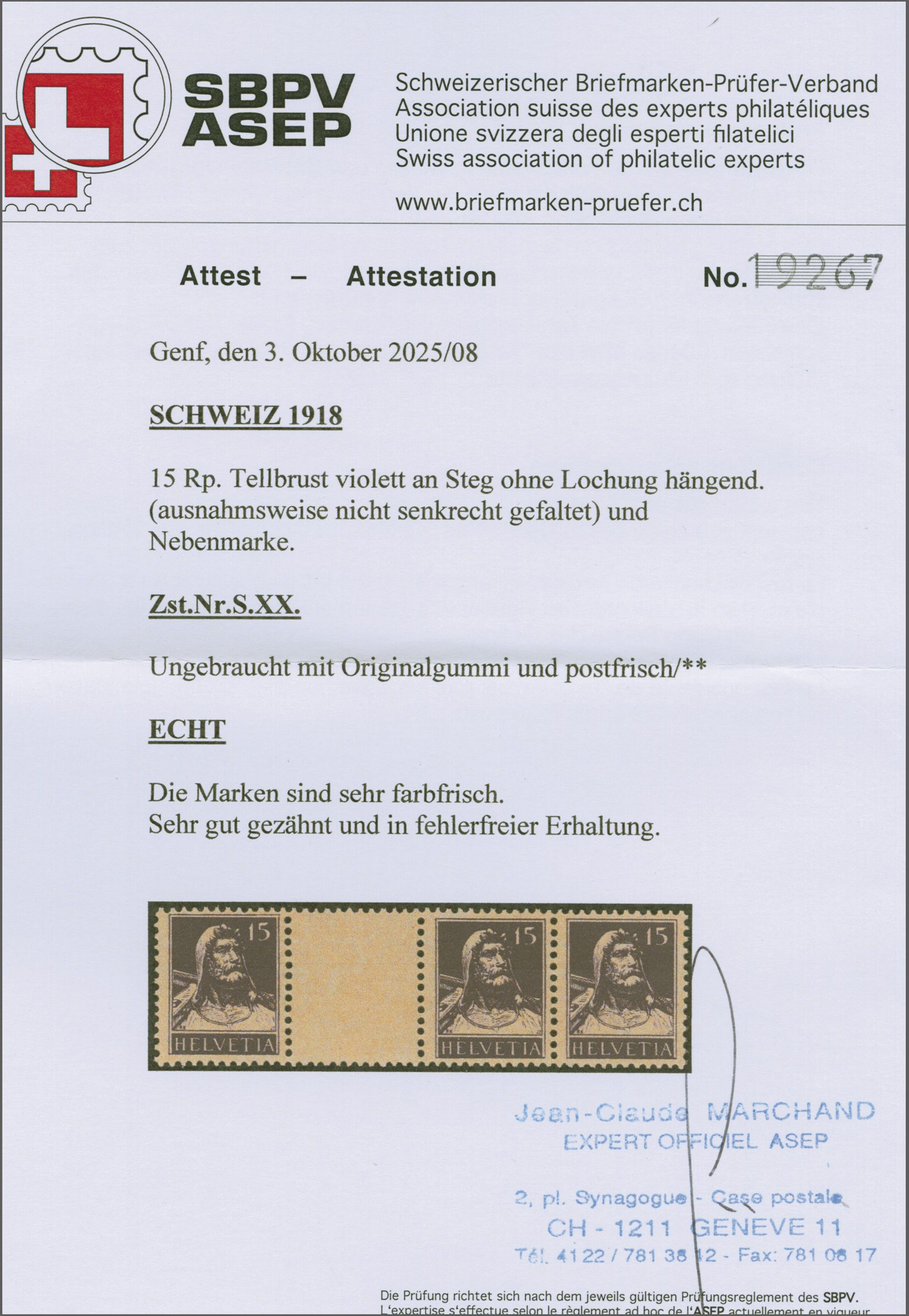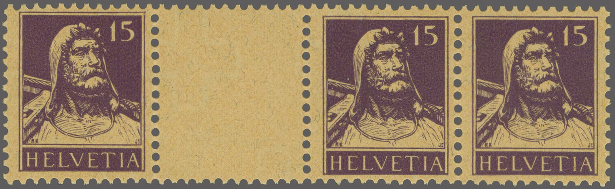 1918: Tellbrustbild 15 Rp. violett im waagr. Dreierstreifen mit Zwischensteg ohne Lochung, gut gez., postfr. mit voller Originalgummierung und in fehlerfreier Erhaltung. Eine attraktive Einheit ohne die übliche,