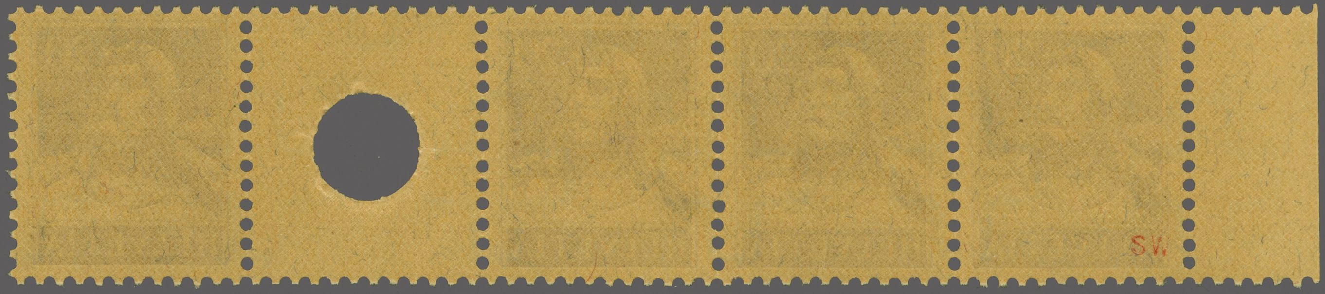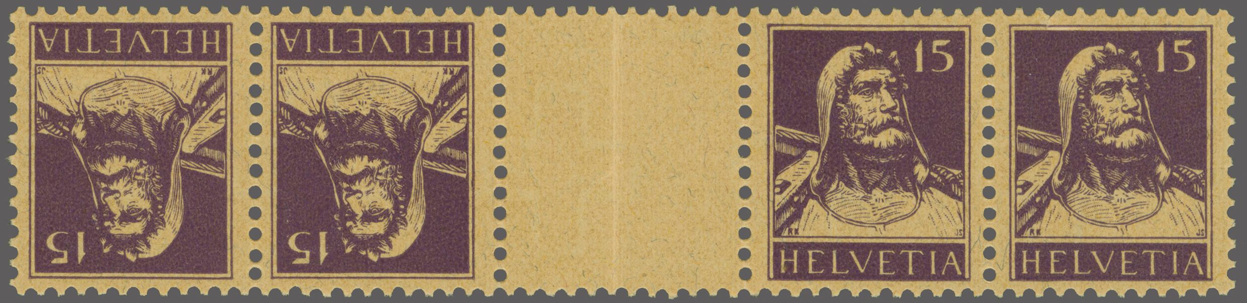 1918: Tellbrustbild 15 Rp. violett im Viererstreifen, mittig mit Kehrdruckpaar mit Zwischensteg ohne Lochung, gut gez., Zwischensteg mit üblicher herstellungsbedingter Faltspur, postfr. und in fehlerfreier Erhaltung. Atteste