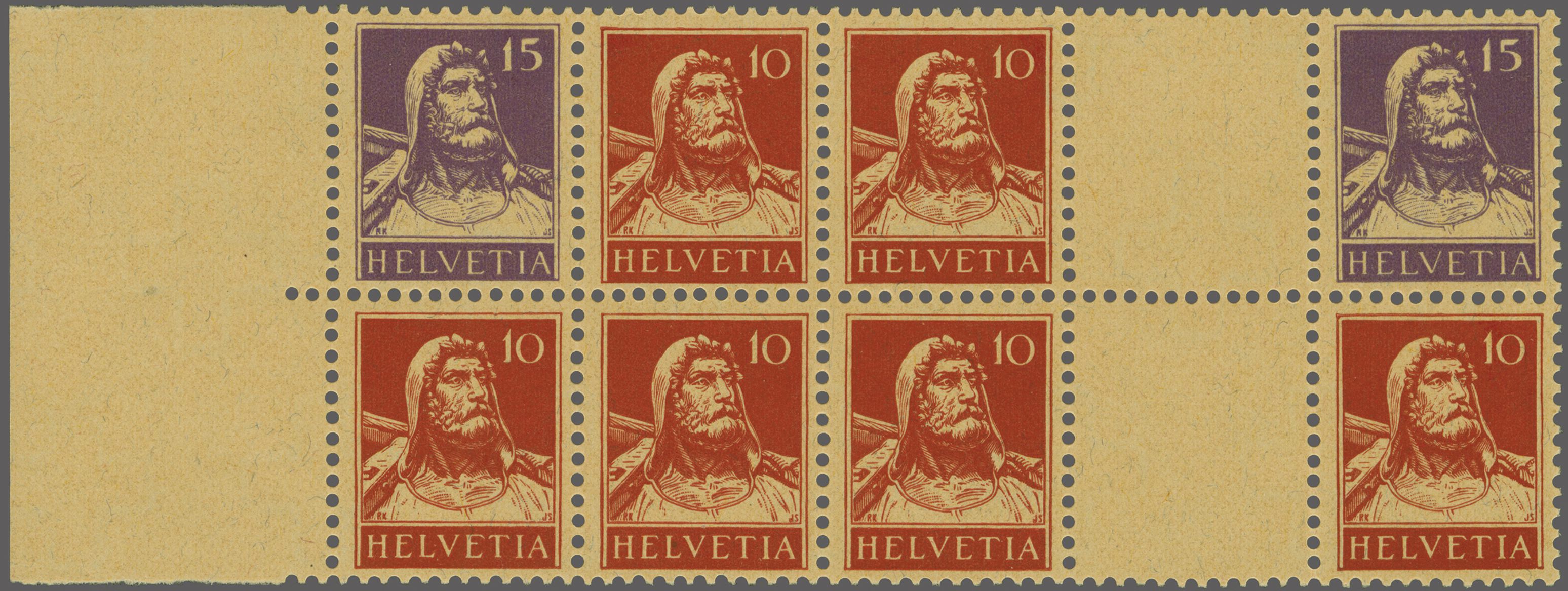 1918: Tellbrustbild 10 Rp. rot, Type II (6) und 15 Rp. violett (2), Achterblock vom linken Bogenrand mit den beiden Zwischenstegpaaren 10 und 15 Rp. sowie 10 und 10 Rp. mit Zwischensteg ohne Lochung sowie 15 und 10 Rp. im