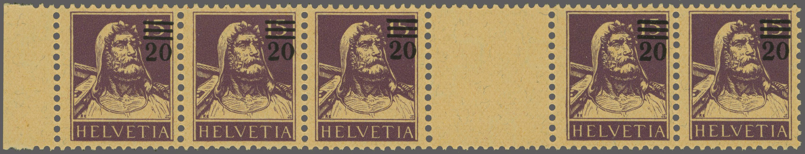 1921: Aufbrauchsausgabe 20 auf 15 Rp. violett im waagr. Fünferstreifen vom linken Bogenrand inkl. Zwischenstegpaar mit Zwischensteg ohne Lochung, gut gez., postfr. und in fehlerfreier Erhaltung. Ein seltener Zwischensteg.
