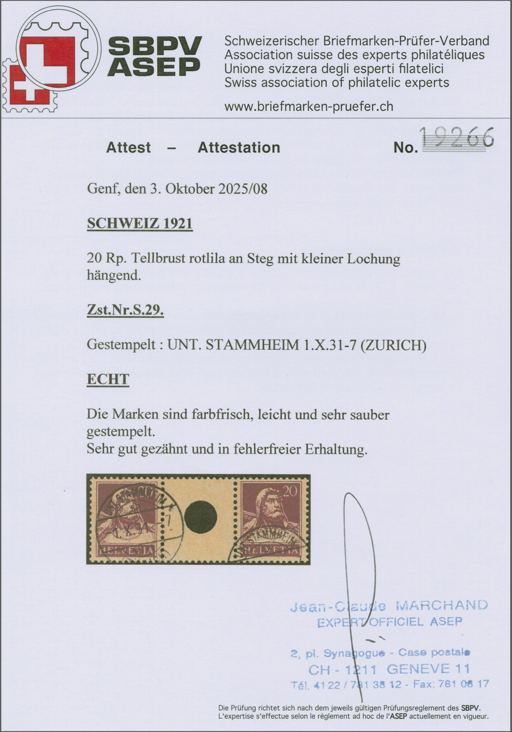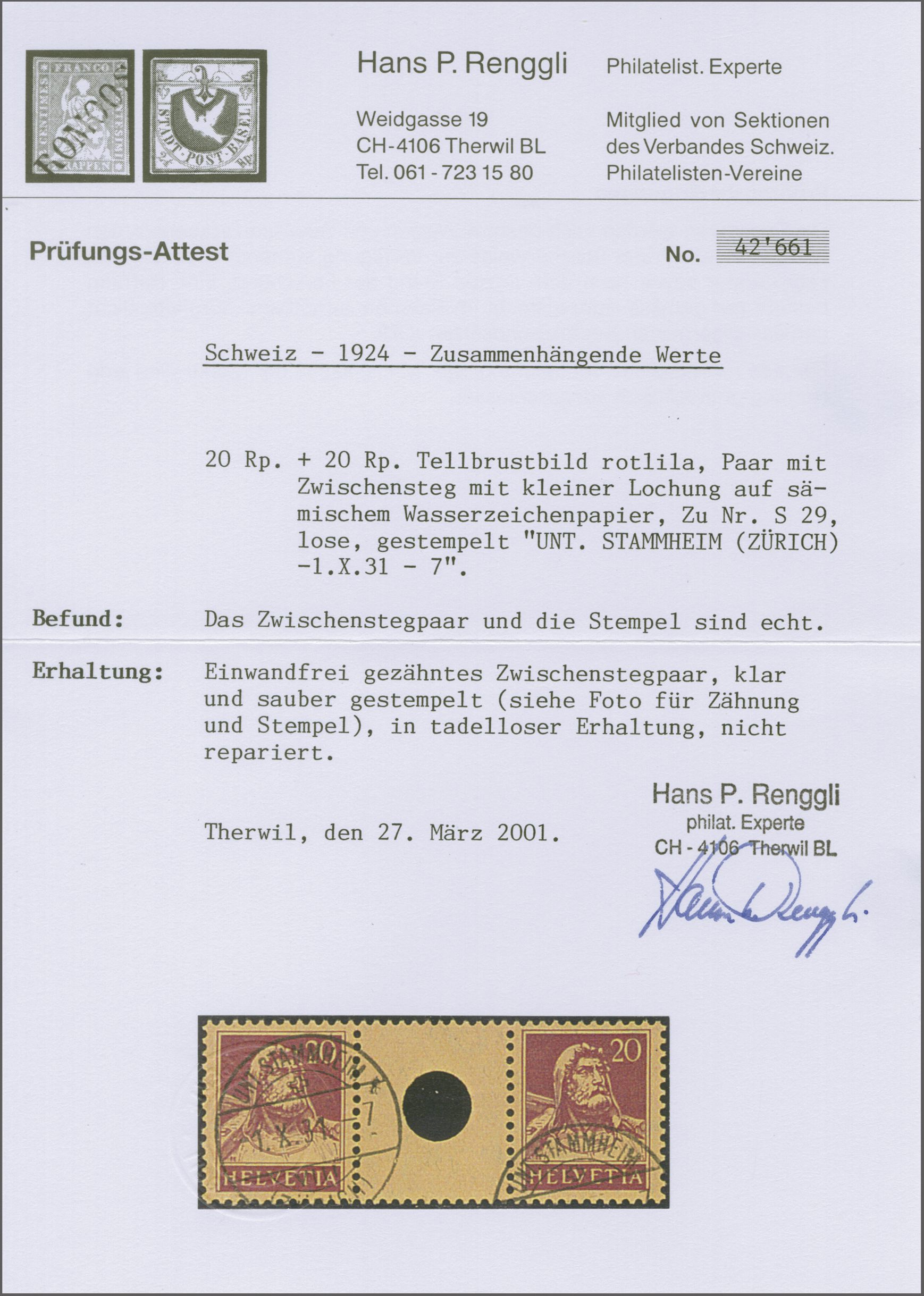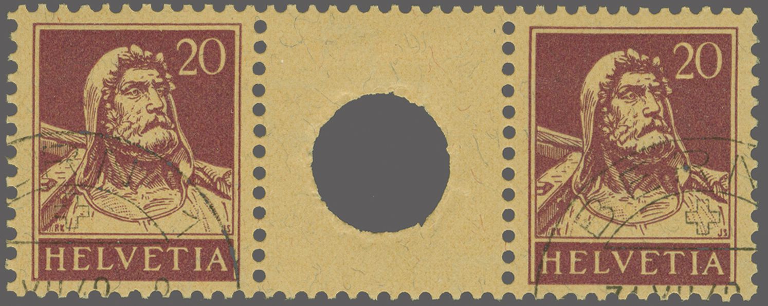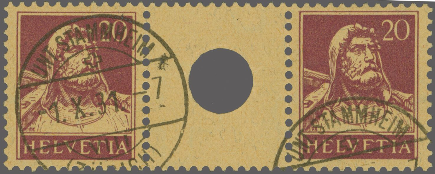 1924: Tellbrustbild 20 Rp. rotlila im Zwischenstegpaar mit kleiner Lochung, gut gez., schön gest. "UNT. STAMMHEIM (ZÜRICH) -1.X.31-7" und in fehlerfreier Erhaltung. Ein attraktives Exemplar dieses seltenen Zwischenstegs;