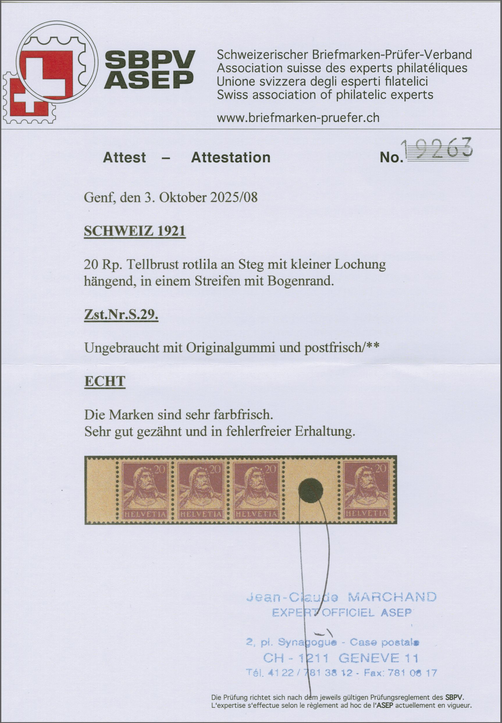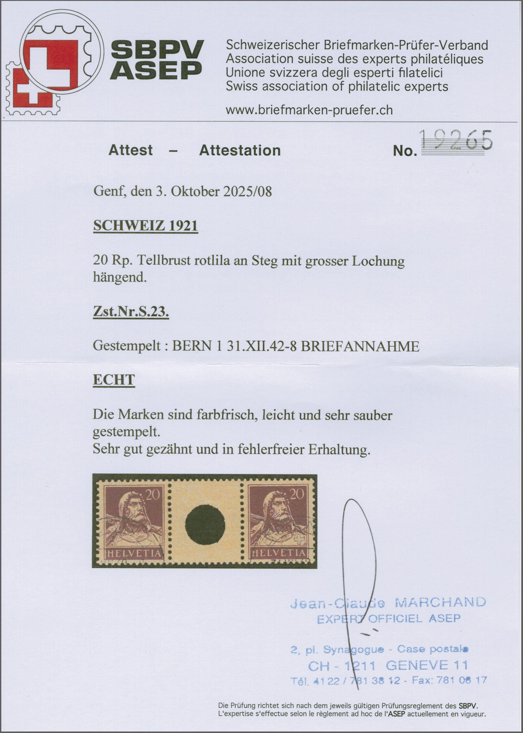 1924: Tellbrustbild 20 Rp. rotlila im waagr. Zwischenstegpaar mit grosser Lochung, gut gez., leicht und sauber entw. mit Eckstp. "BERN 1..." und in fehlerfreier Erhaltung. Signiert Moser, Attest Marchand (2025). SBK=CHF 2'000