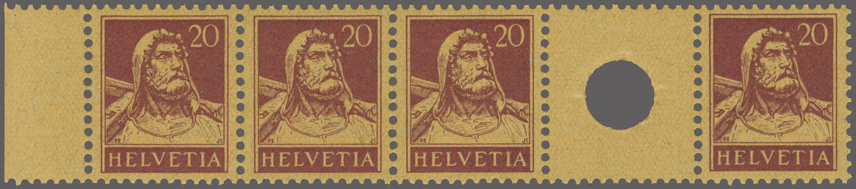 1924: Tellbrustbild 20 Rp. rotlila, waagr. Viererstreifen vom linken Bogenrand mit Zwischenstegpaar mit kleiner Lochung, gut gez., postfr. und in fehlerfreier Erhaltung. Eine attraktive und seltene Einheit; Attest Marchand