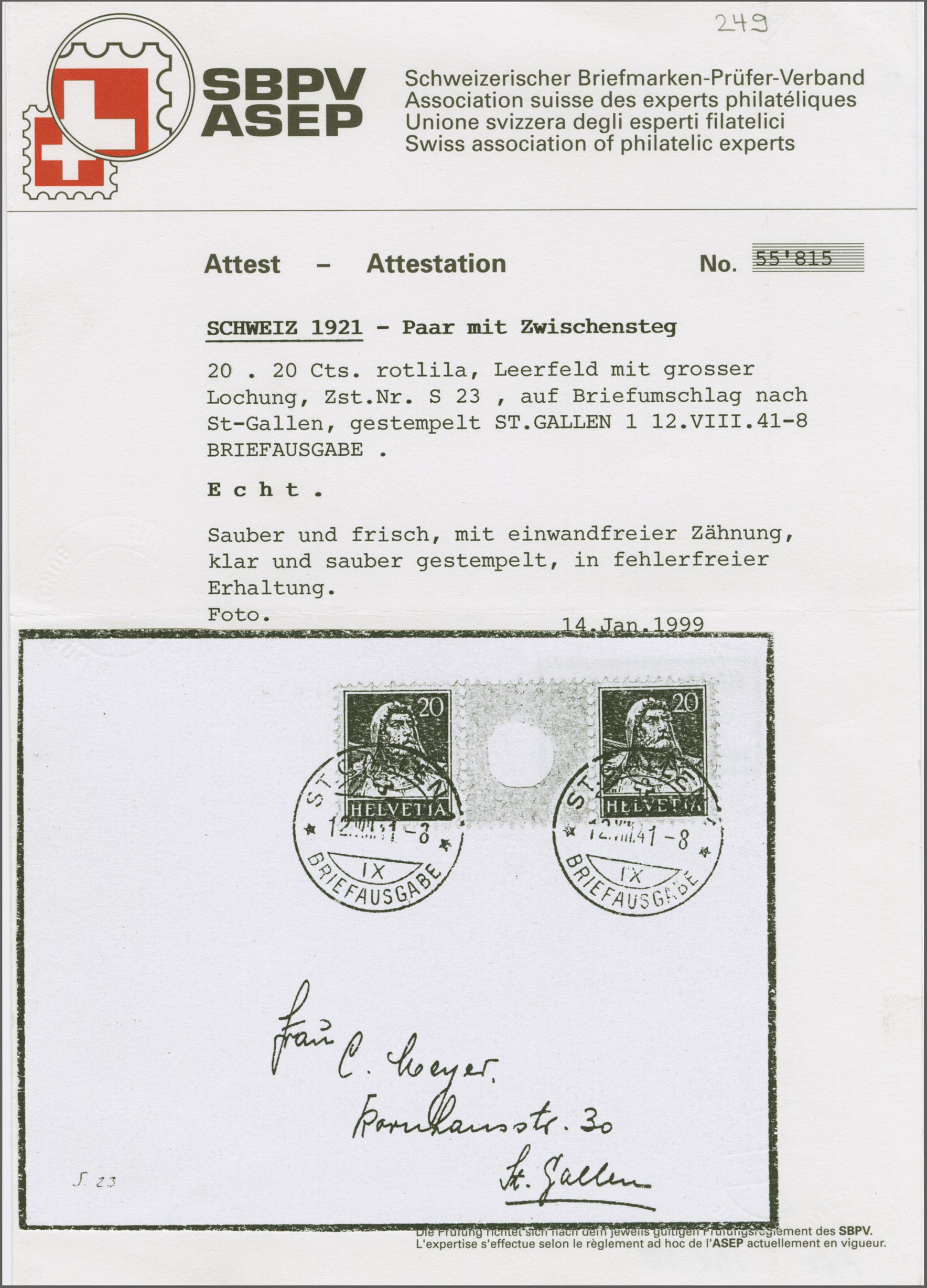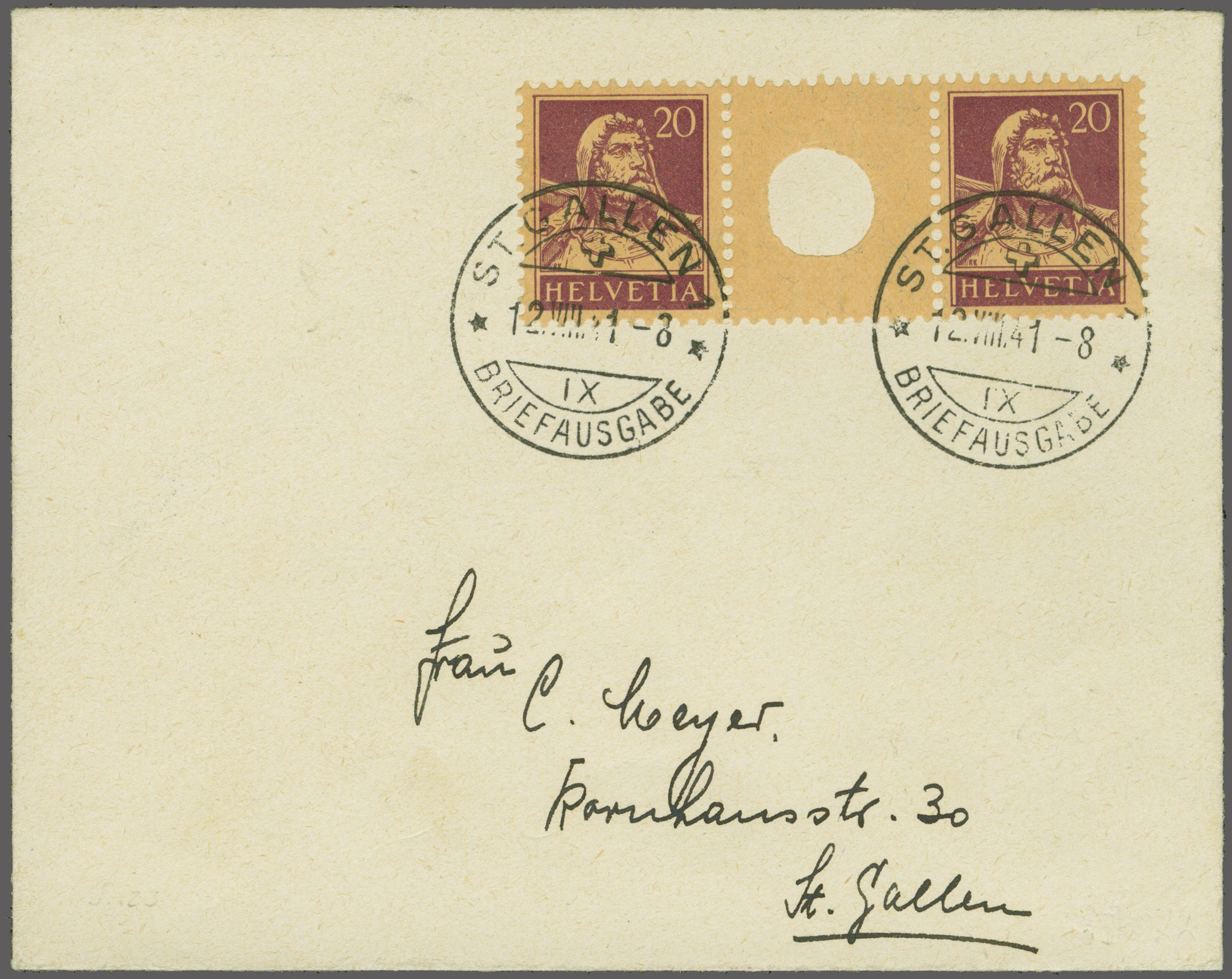 1926: Tellbrustbild 20 Rp. rotlila im Zwischenstegpaar mit grosser Lochung, eine frische und gut gez. Einheit, schön klar und übergehend gest. "ST. GALLEN 1 BRIEFAUSGABE 12.VIII.41-8" auf kleinformatigem Briefcouvert in der
