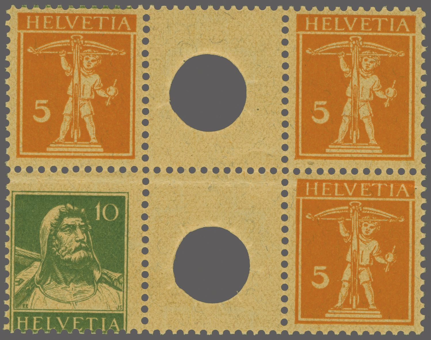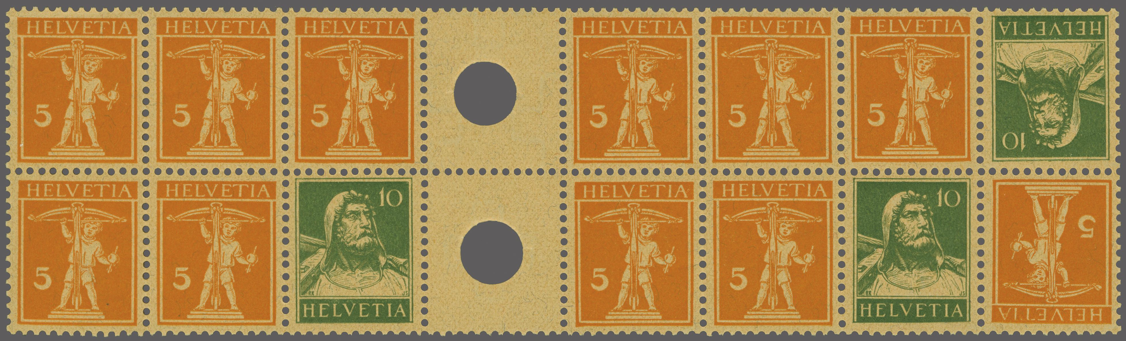 1921: Tellknabe 5 Rp. orange im Zwischenstegpaar mit kleiner Lochung sowie Tellbrustbild 10 Rp. grün und Tellknabe 5 Rp. orange, ebenfalls im Zwischenstegpaar mit kleiner Lochung in einem phänomenalen Vierzehnerblock mit sechs