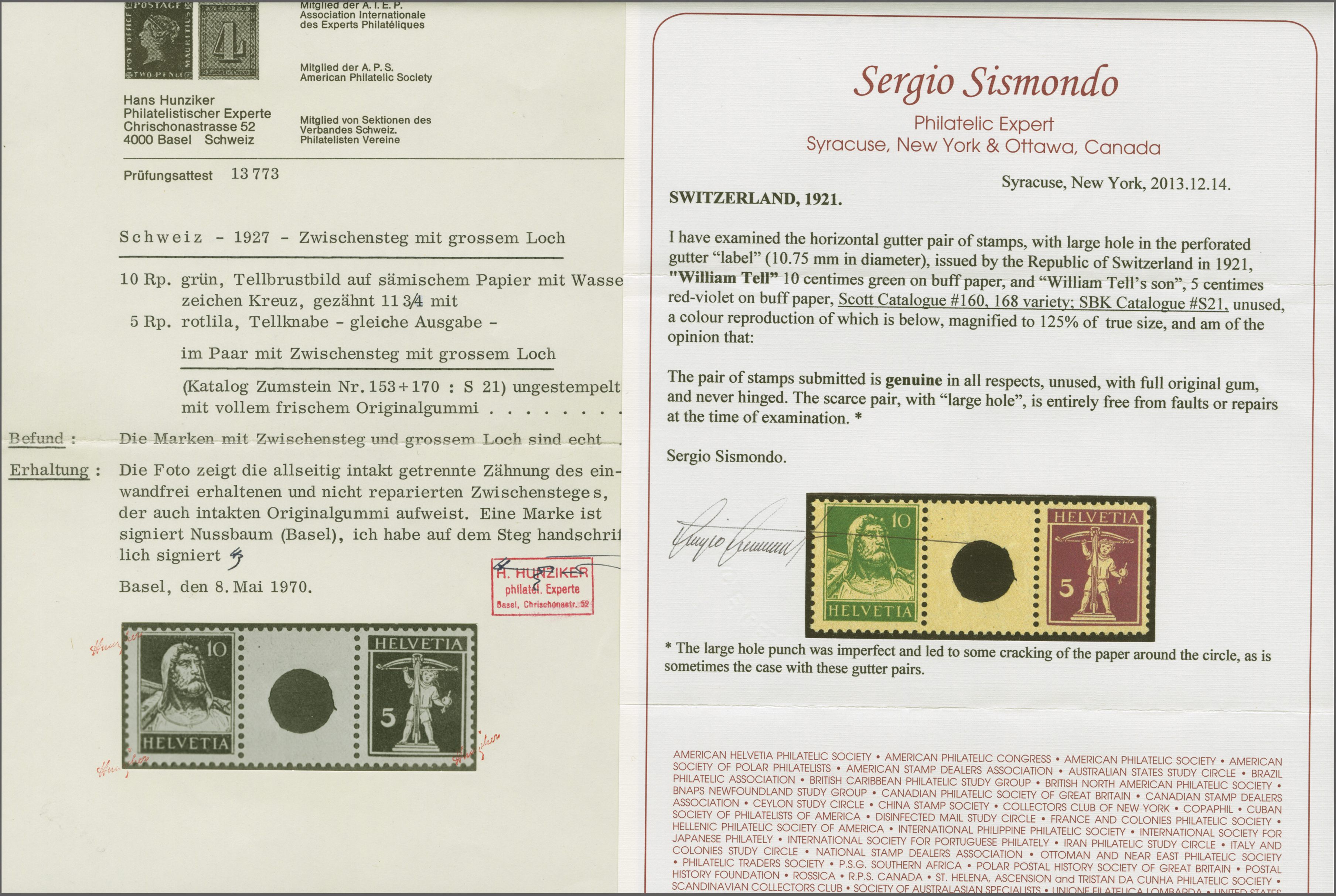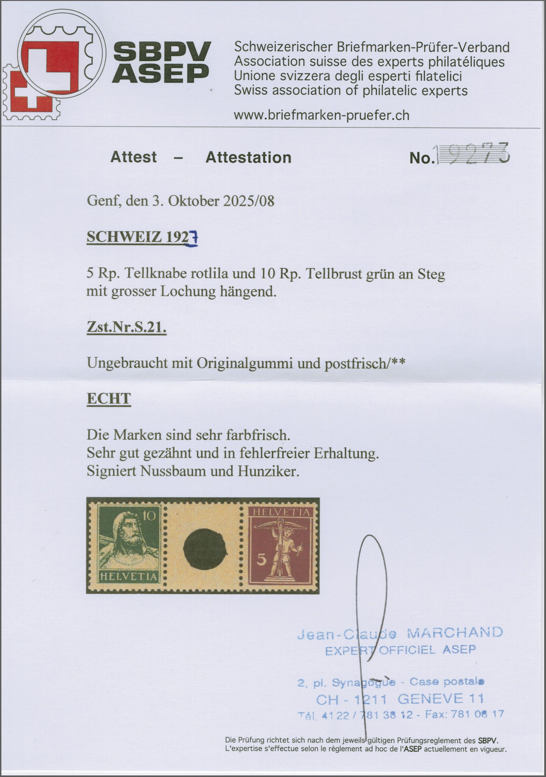 1927: Tellbrustbild 10 Rp. grün und Tellknabe 5 Rp. rotlila im Zwischenstegpaar mit grosser Lochung, gut gez., postfr. und in fehlerfreier Erhaltung. Signiert Nussbaum, Atteste Hunziker (1970), Renggli (1991), Sismondo (2013)