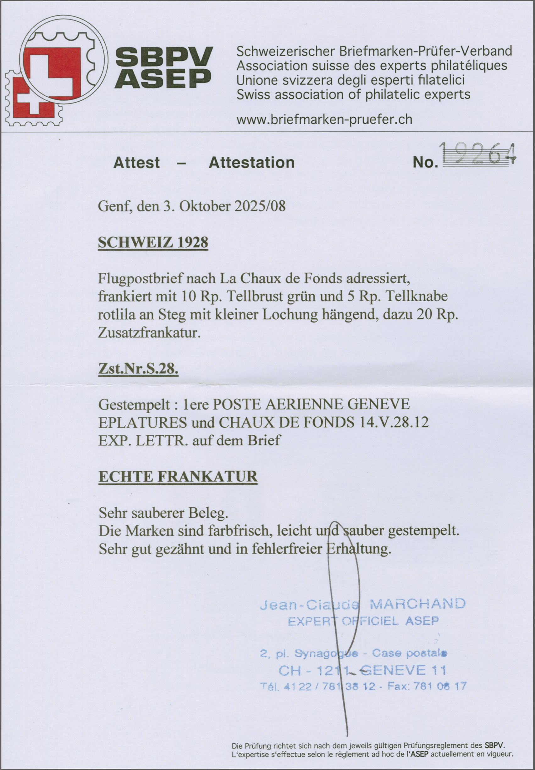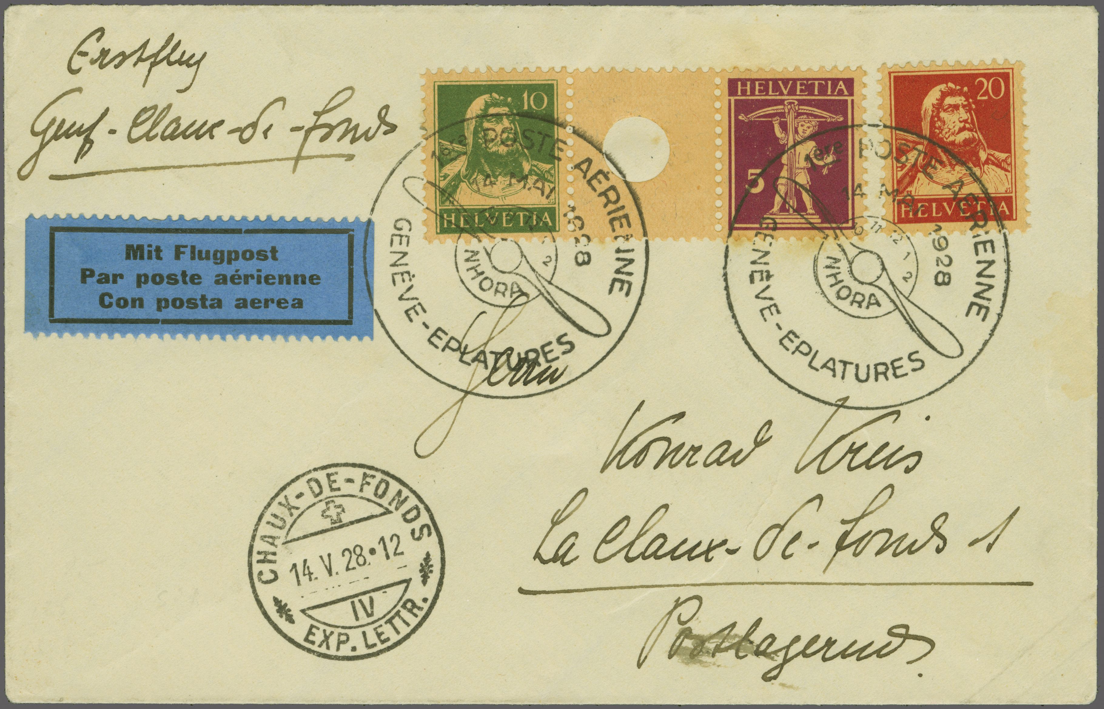 AÉRIENNE / GENÈVE-EPLATURES / 14. MAI 1928" in schwarz auf Briefumschlag nach La Chaux-de-Fonds, befördert mit Erstflug Genf-La Chaux-de-Fonds mit vorders. Ankunftsstp. "CHAUX-DE-FONDS EXP. LETTR. 14.V.28-12". Attest Marchand (2025). SBK=CHF 3'500 (Image 1)