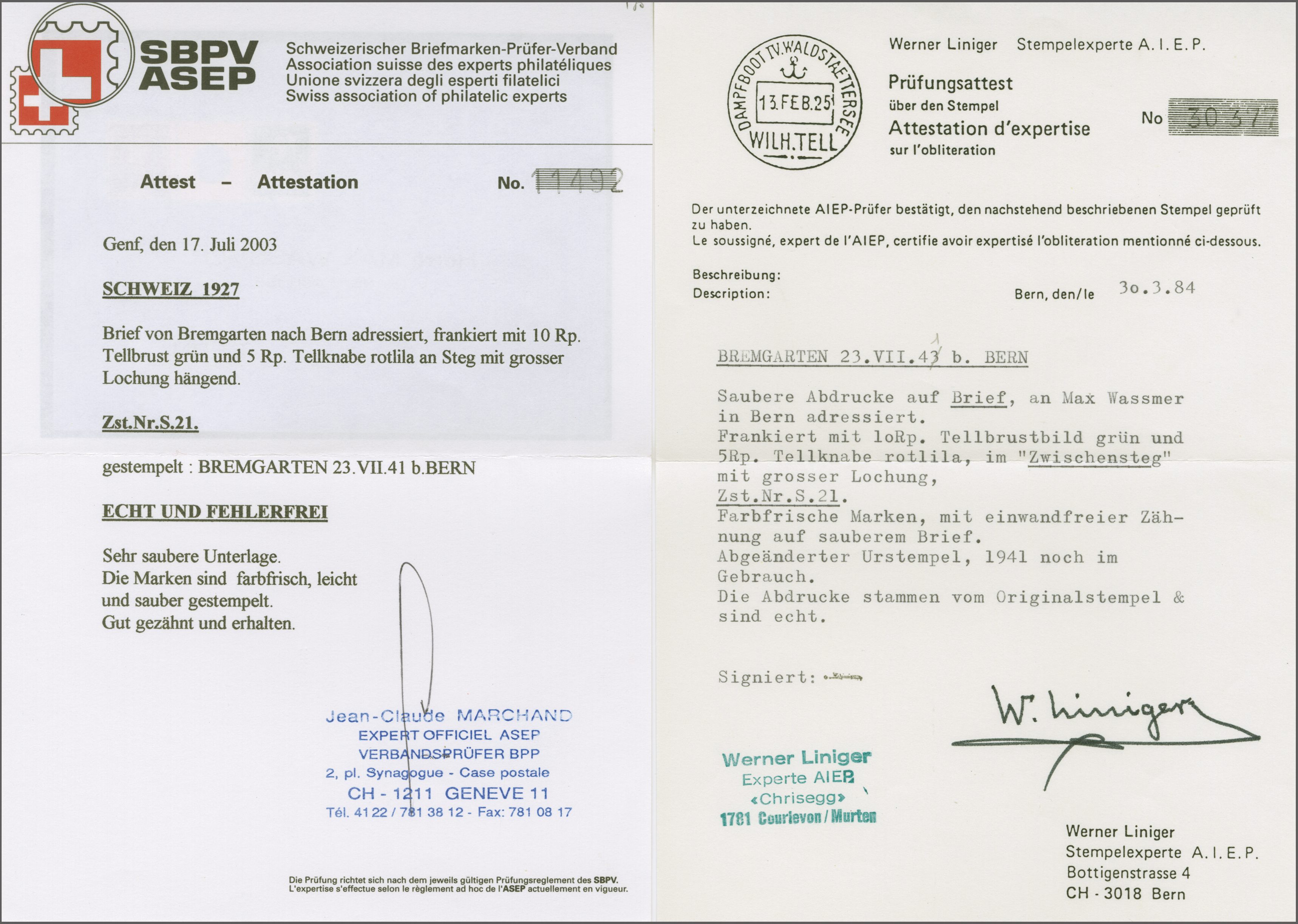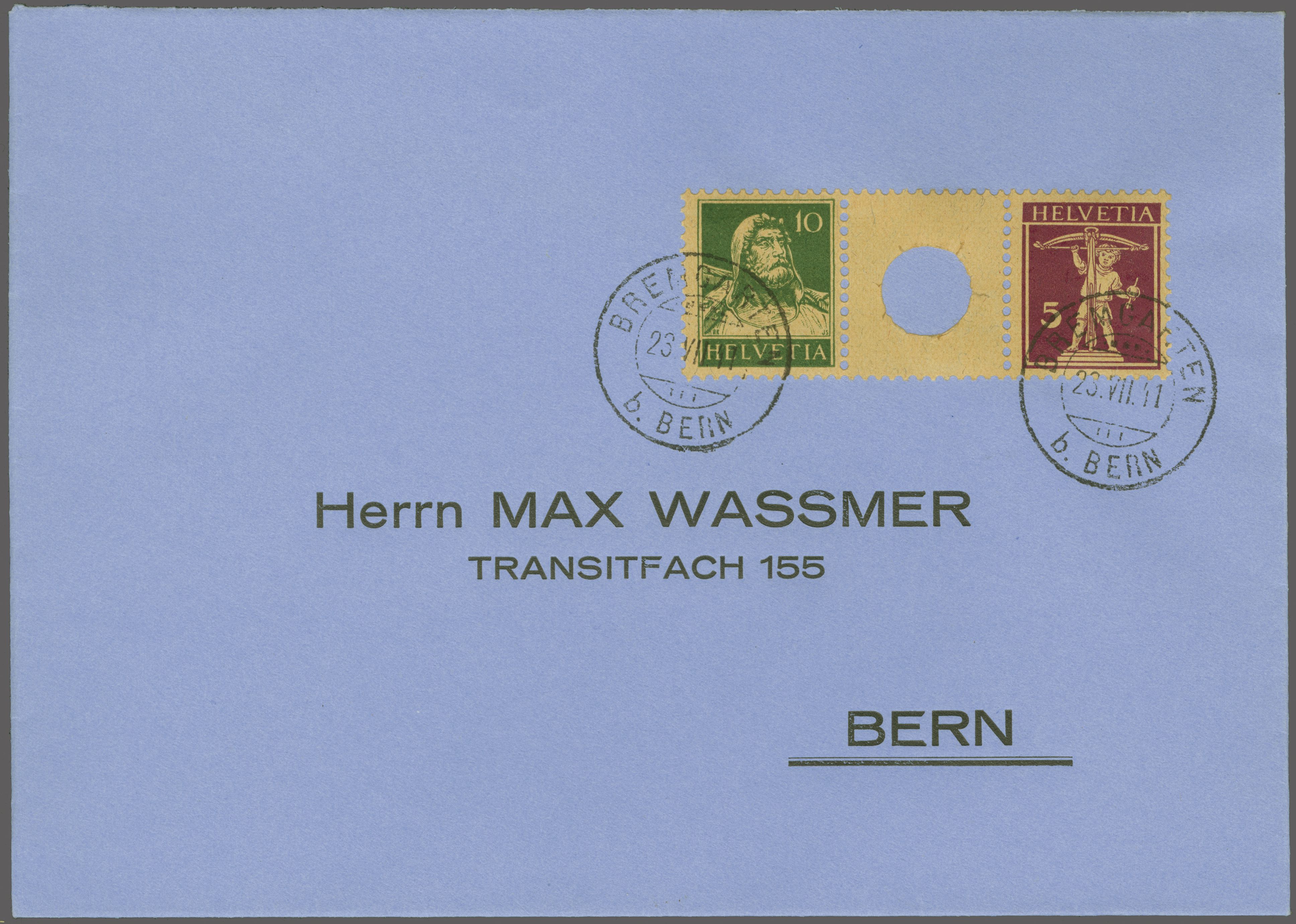 1927: Tellbrustbild 10 Rp. grün und Tellknabe 5 Rp. rotlila im seltenen Zwischenstegpaar mit grosser Lochung, eine frische und gut gez. Einheit, sauber und übergehend gest. "BREMGARTEN b. BERN 23.VII.41" auf Firmenumschlag mit