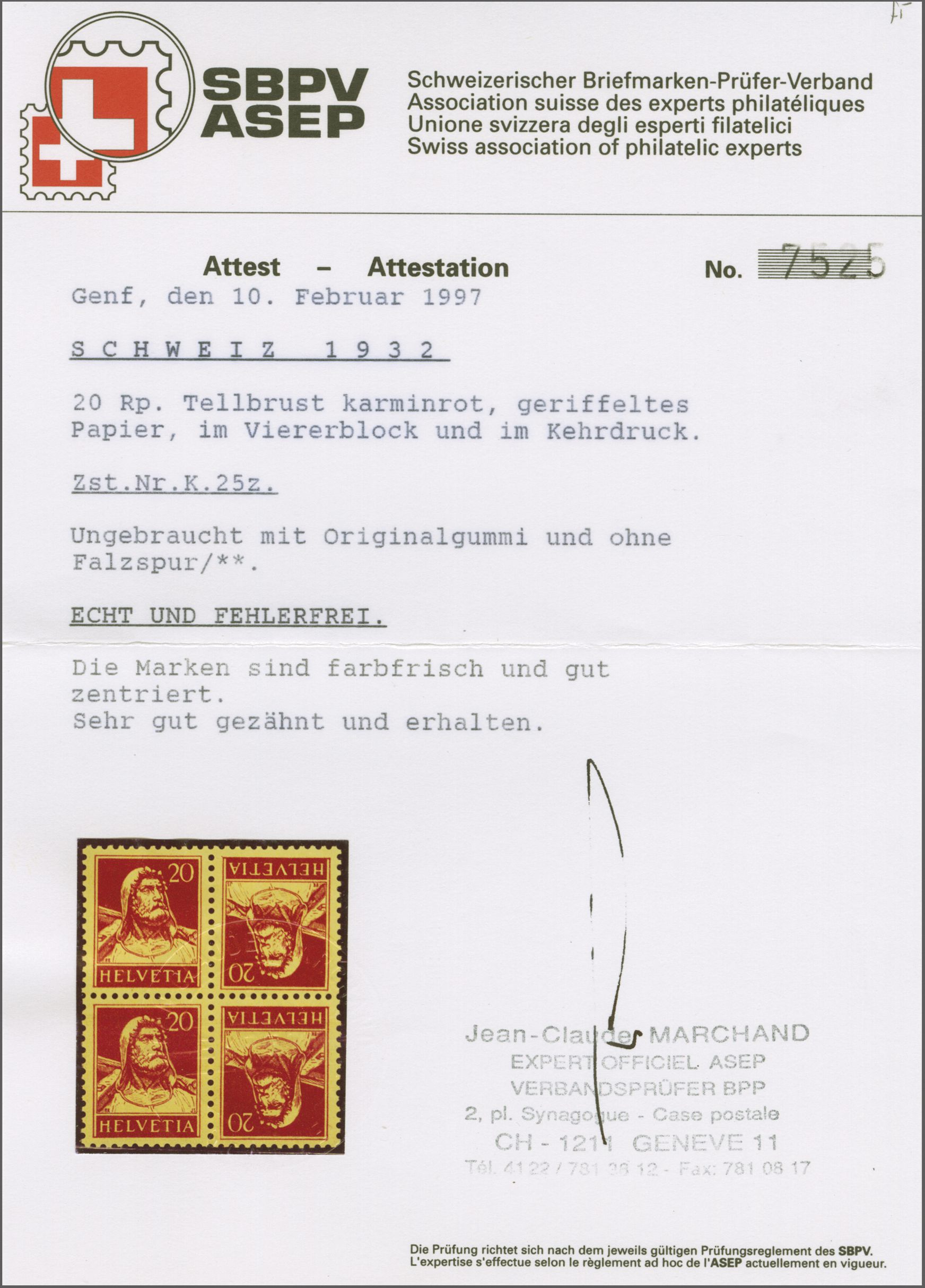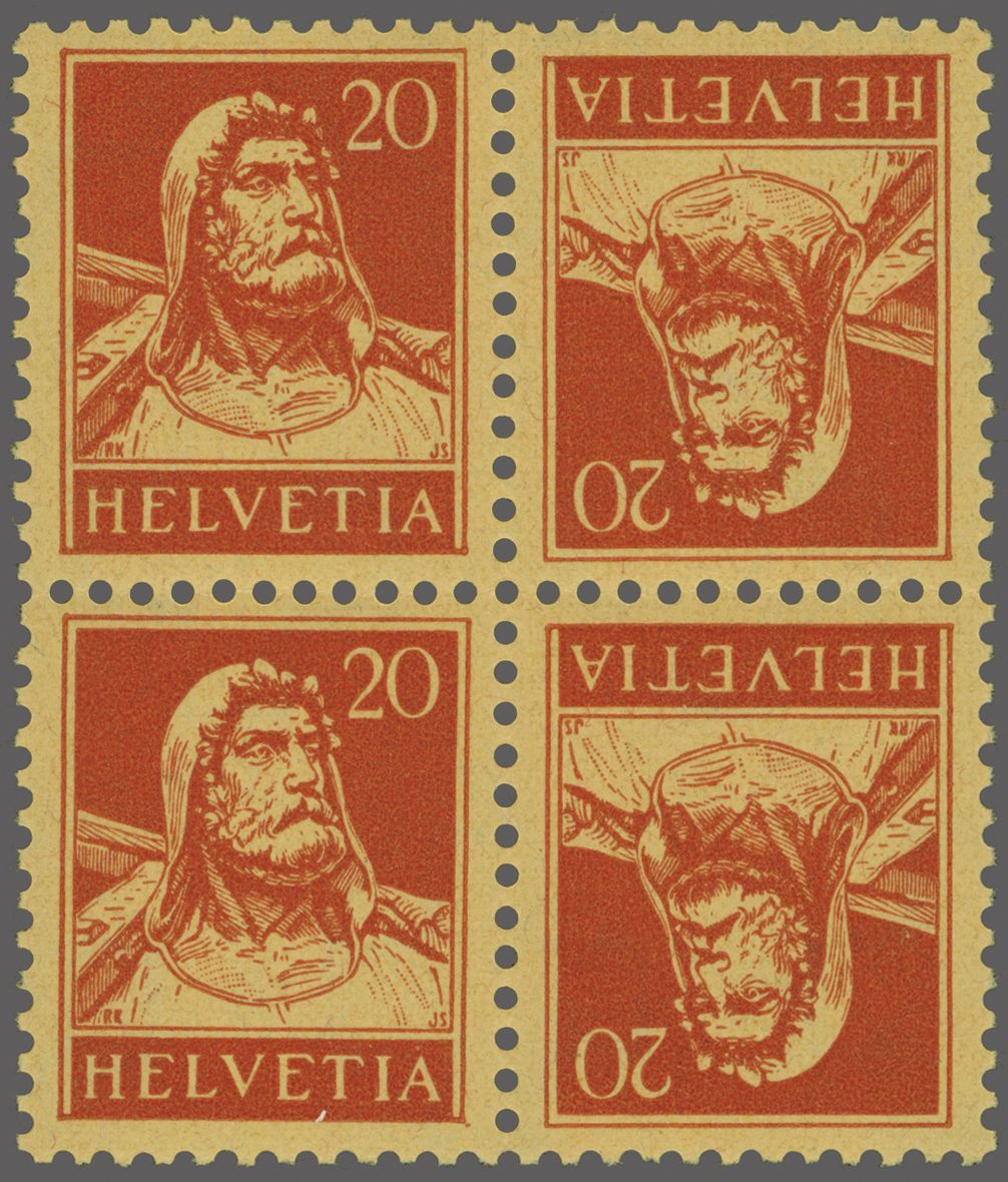 1932: Tellbrustbild 20 Rp. karminrot auf geriffeltem Papier, zwei waagr. Kehrdruckpaare im Viererblock, einwandfrei gezähnt, postfrisch mit voller Originalgummierung und in fehlerfreier Erhaltung. Eine seltene Einheit; Attest